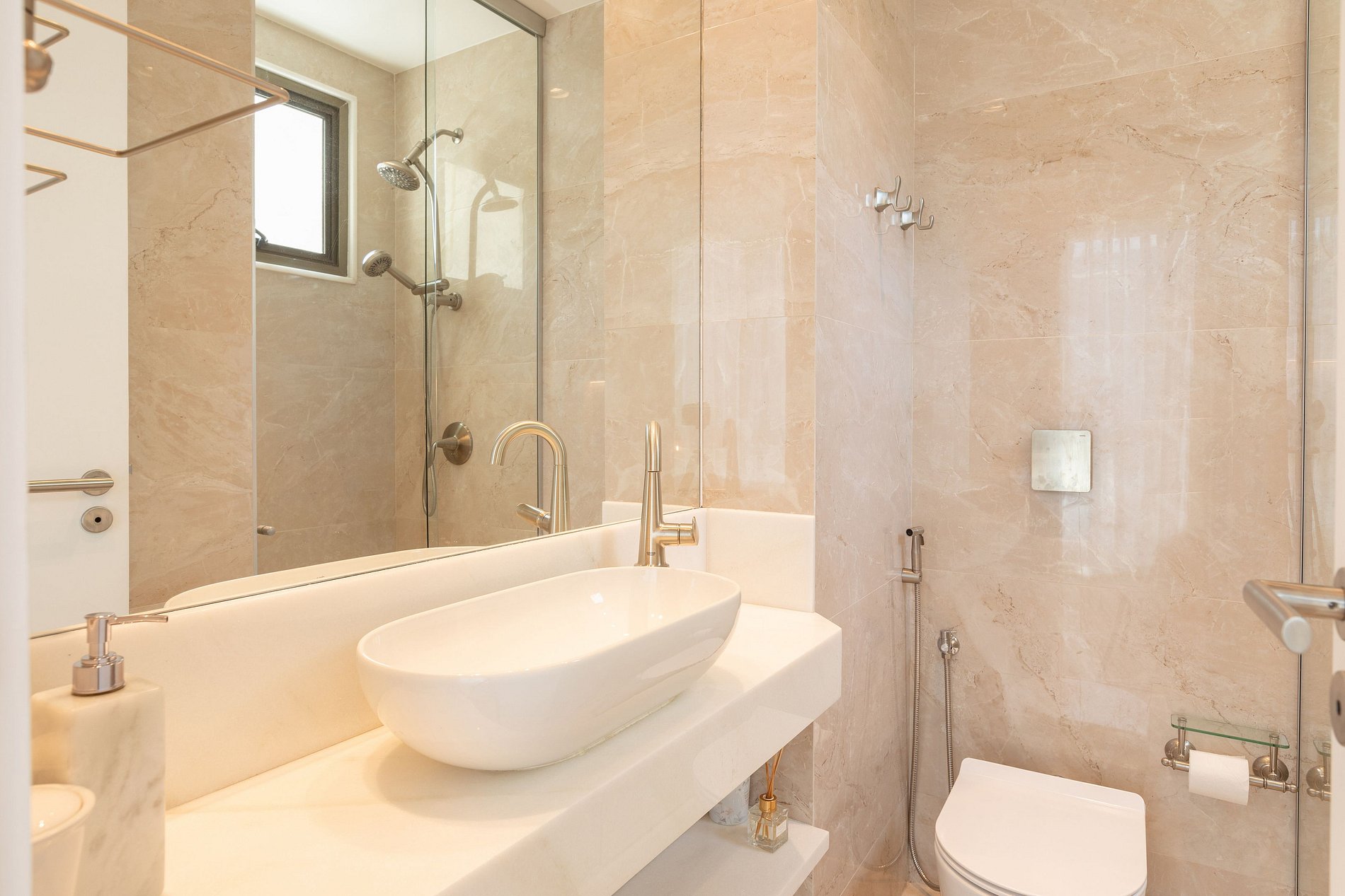 La lujosa Master Suite cuenta con un vestíbulo con espejos de cuerpo entero, un closet gigante y un gran balcón exclusivo, ofreciendo un espacio acogedor con vegetación y un sofá de dos plazas, un espacio para deportistas con colchoneta y remero. El maravilloso baño de mármol tiene un inodoro, una bañera y dos duchas fijas.