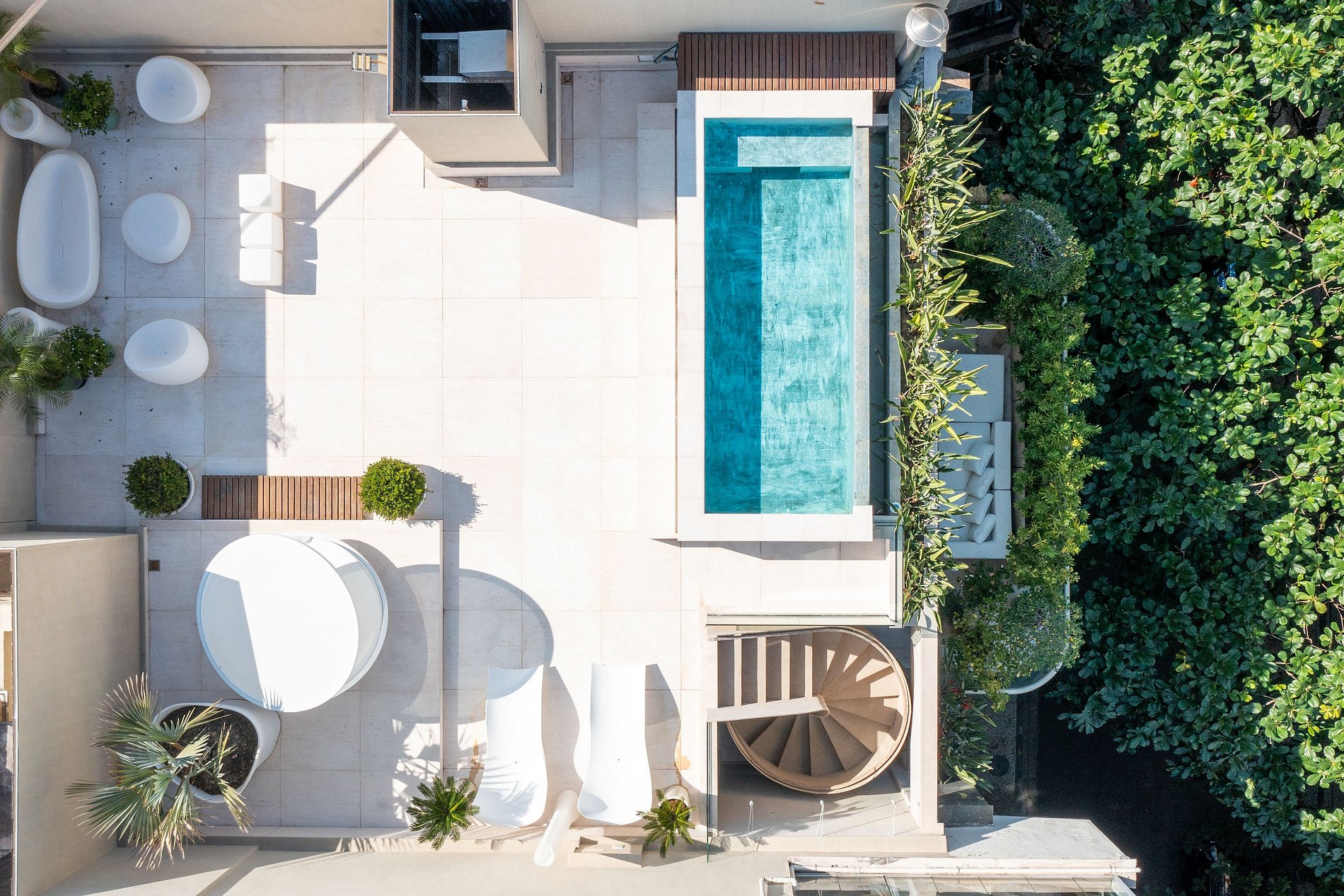 La terraza cuenta con una zona de estar con muebles seleccionados de la más alta calidad, una hermosa piscina, perfecta para nadar y arreglos vegetales para decorar el ambiente.