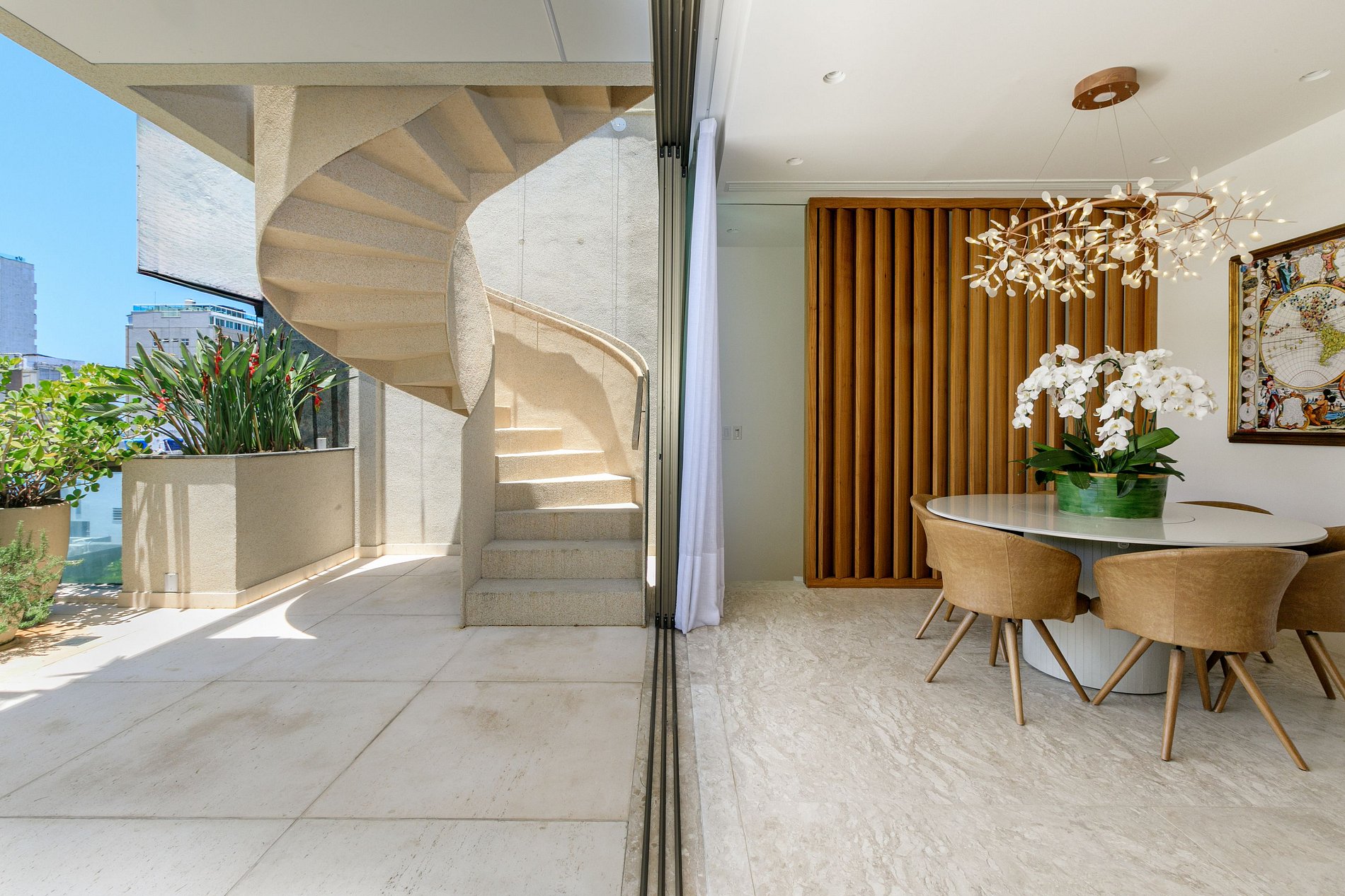 Un ático triplex completamente renovado, lujoso y de buen gusto ubicado en uno de los mejores lugares de Leblon, a media cuadra de la playa. Son dos niveles adornados con arquitectura contemporánea, materiales de la más alta calidad y una hermosa terraza con piscina.