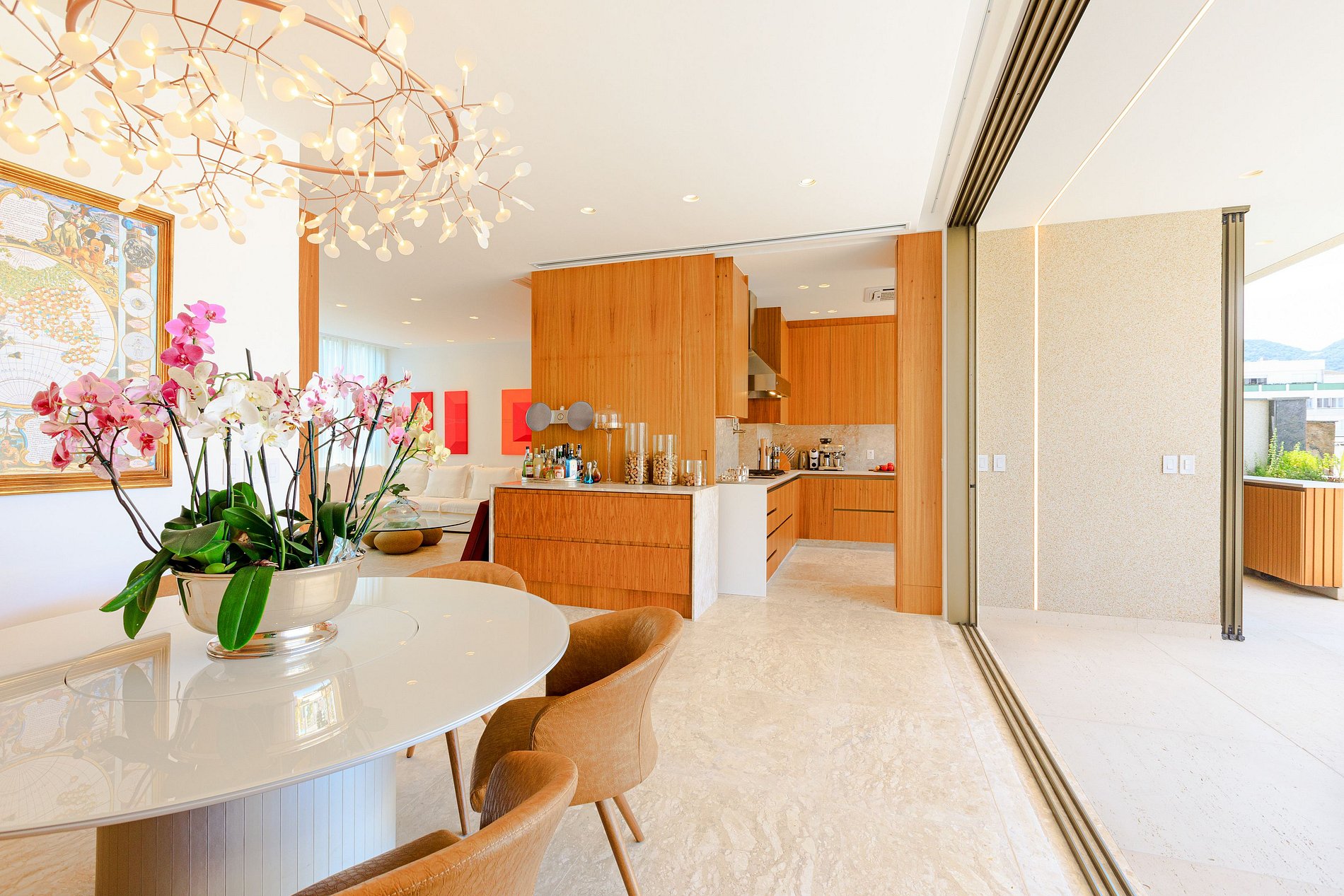 El área social se ubica en el segundo piso del apartamento, el cual tiene un diseño de concepto abierto. Los salones y comedores se pueden integrar con el espacio exterior, abriendo totalmente los paneles de vidrio, así como la cocina, que también se puede mantener abierta al comedor o reservada, cerrando sus puertas paneladas de madera.