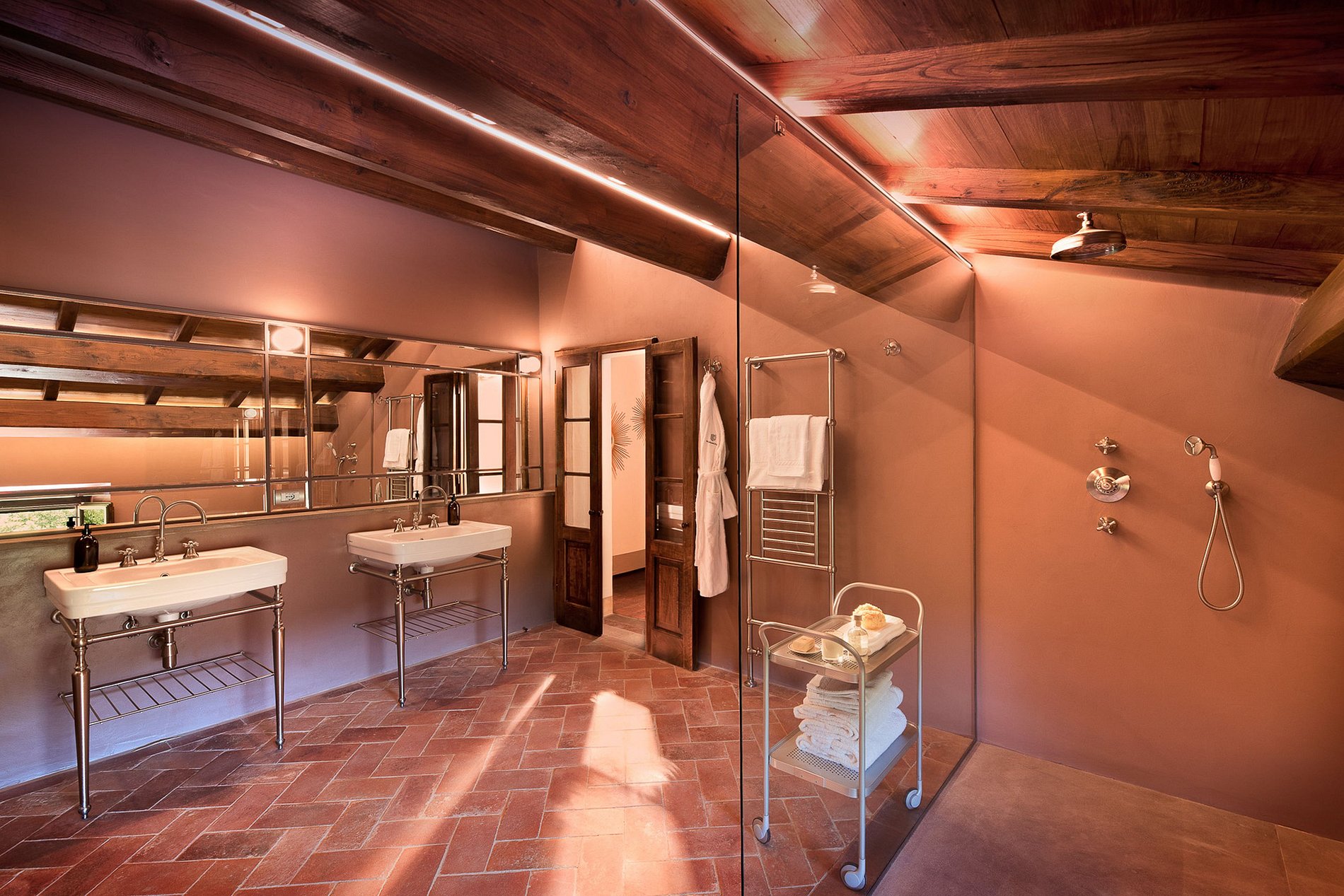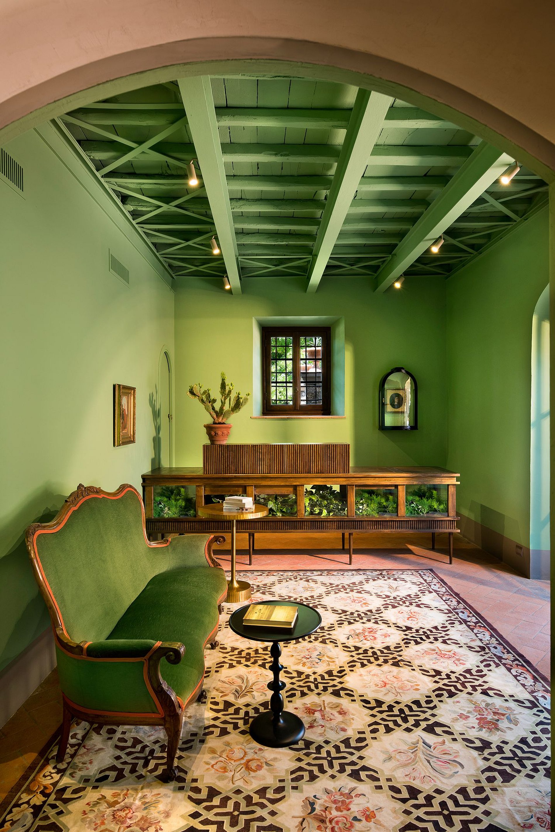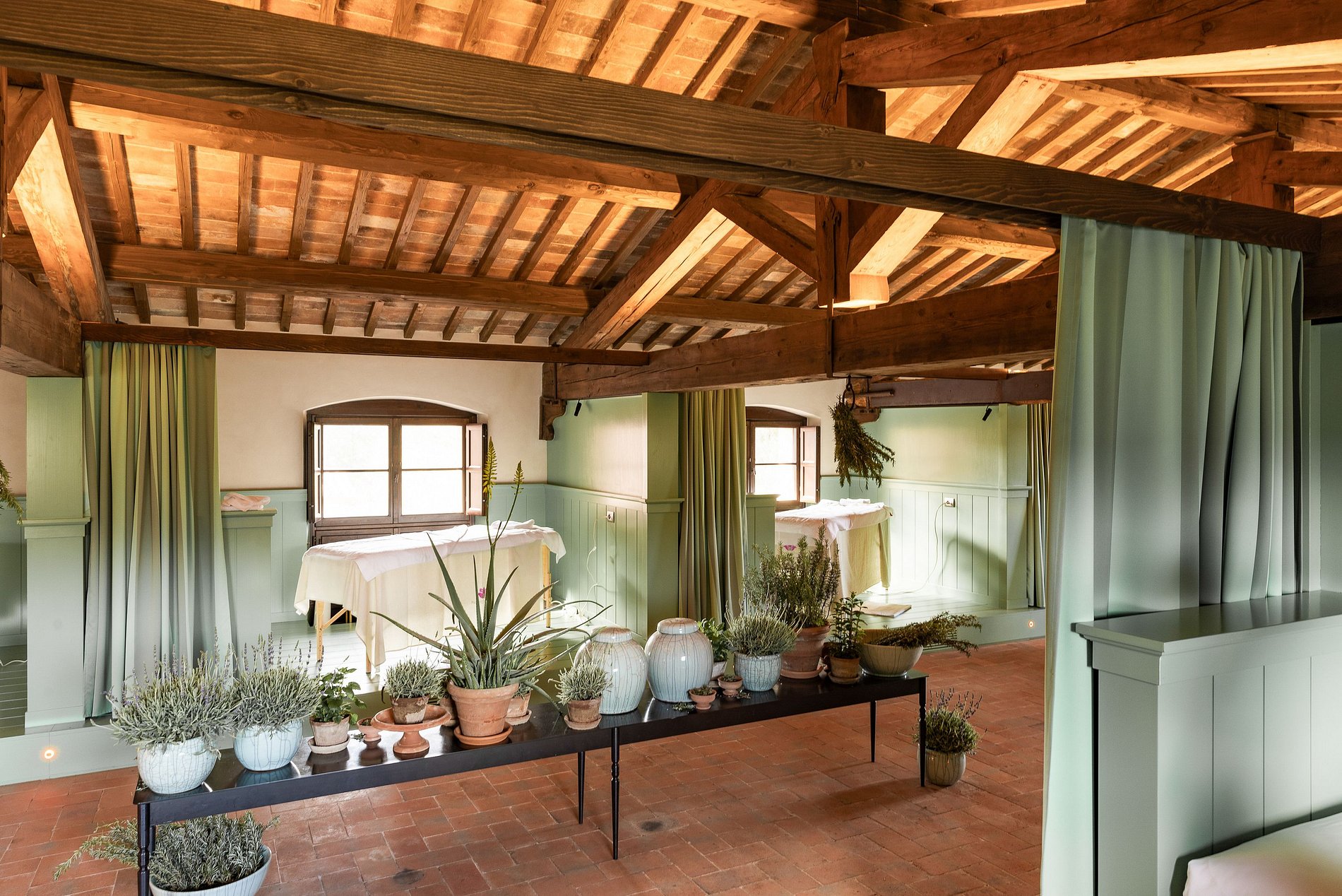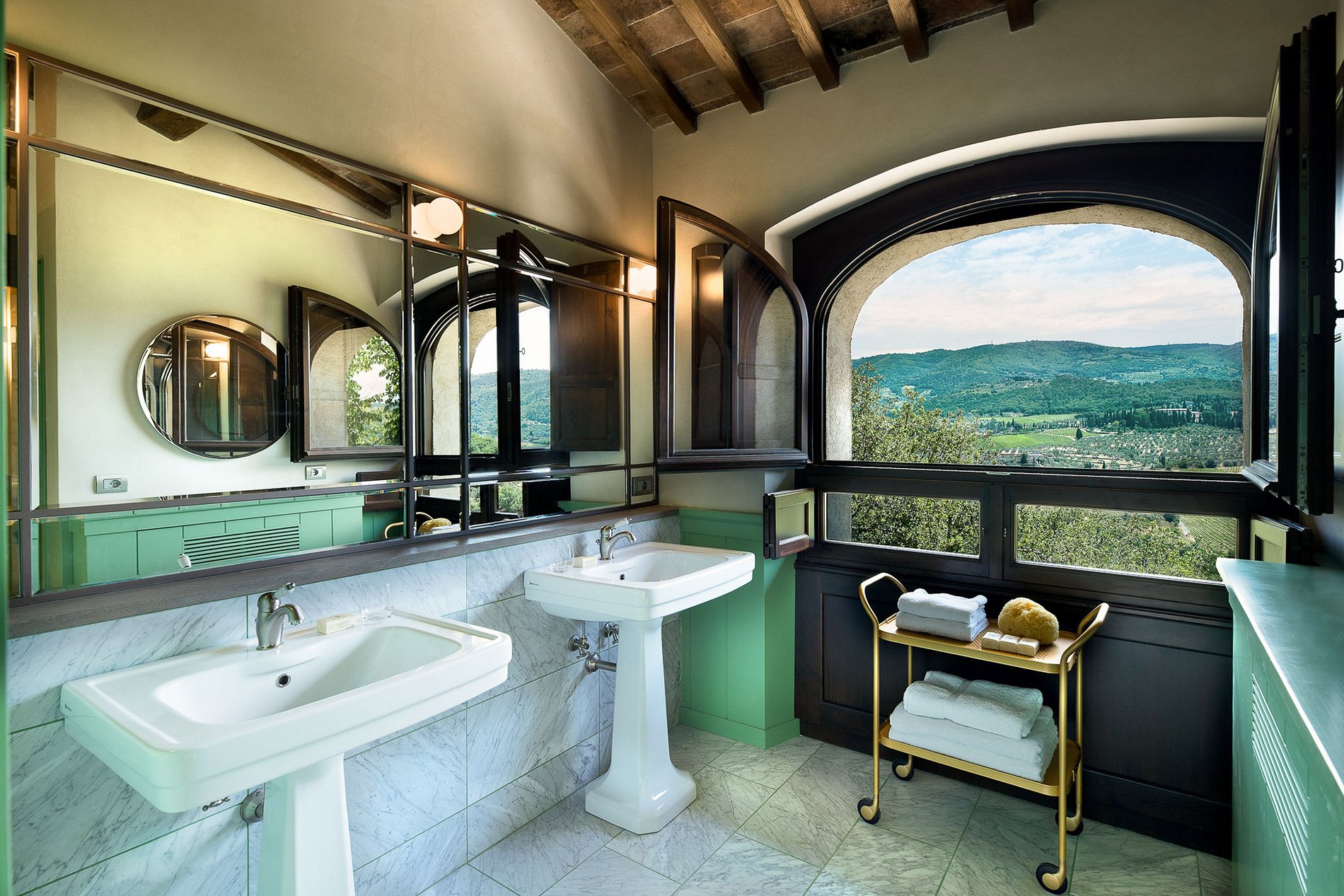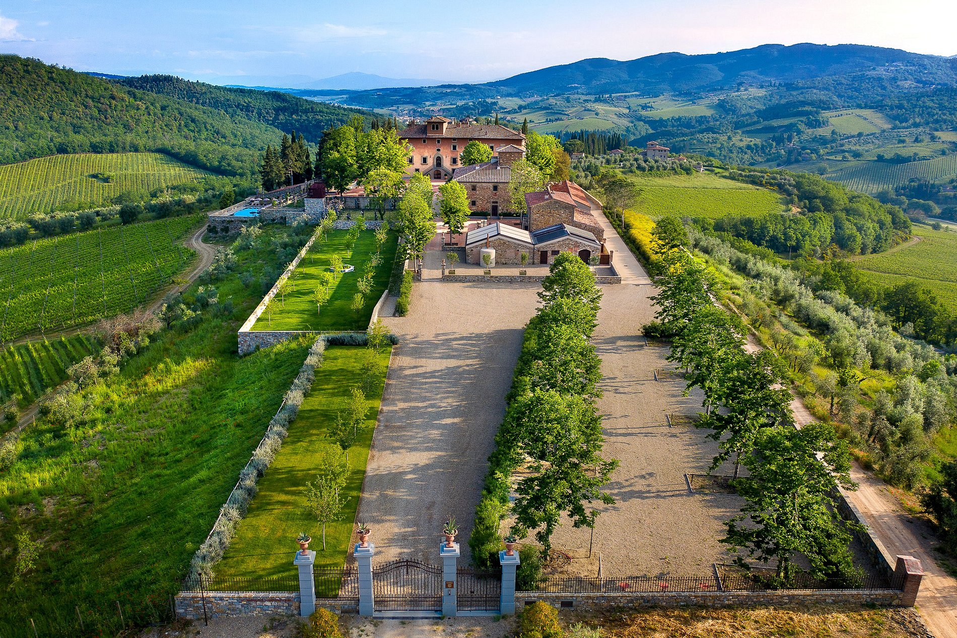 En el corazón de la finca se encuentra una villa renacentista del siglo XIV, construida originalmente por una noble familia florentina. Rodeada de hileras de cipreses, viñedos y olivos, la villa encarna la elegancia arquitectónica de la Toscana en un entorno natural sereno. Los jardines, diseñados por el estudio liderado por el reconocido arquitecto Patrice Taravella (creador de los jardines de Babylonstoren y The Newt), combinan árboles maduros —como pinos, tilos y palmeras— con un paisajismo mineral enriquecido por cientos de macetas de terracota artesanales de Impruneta.