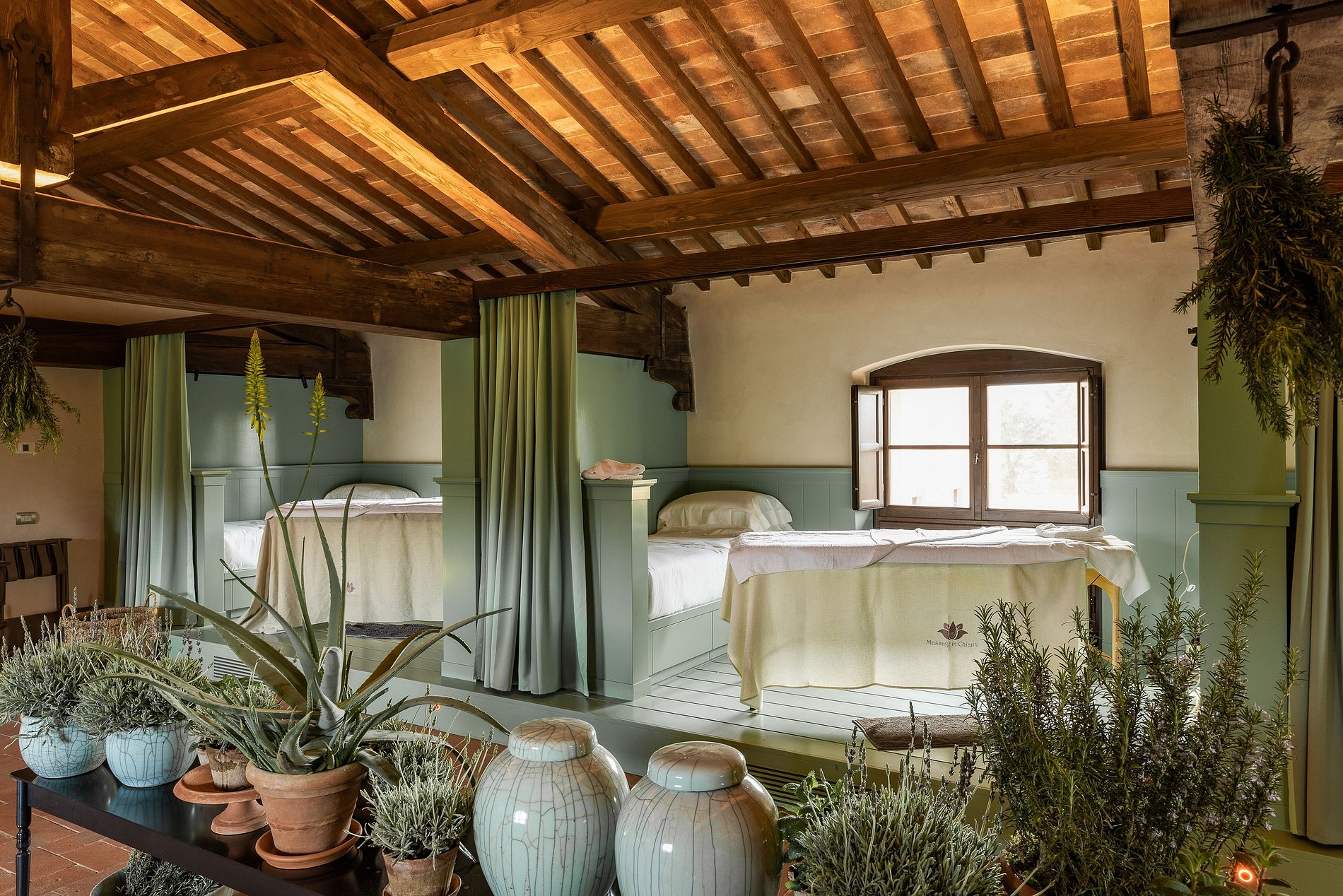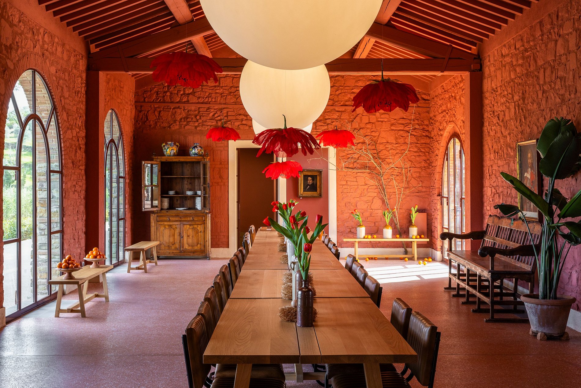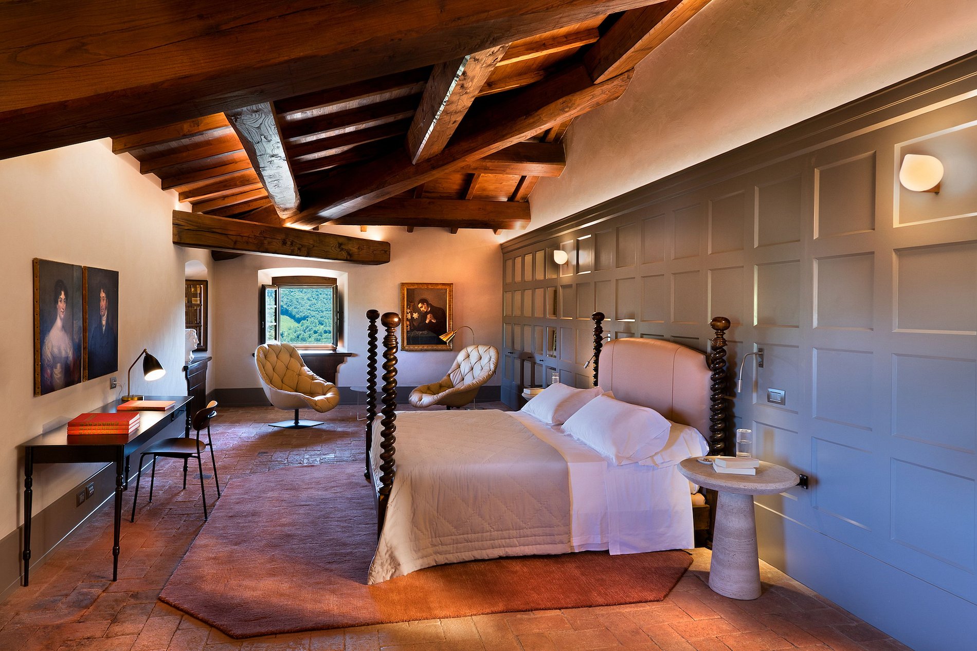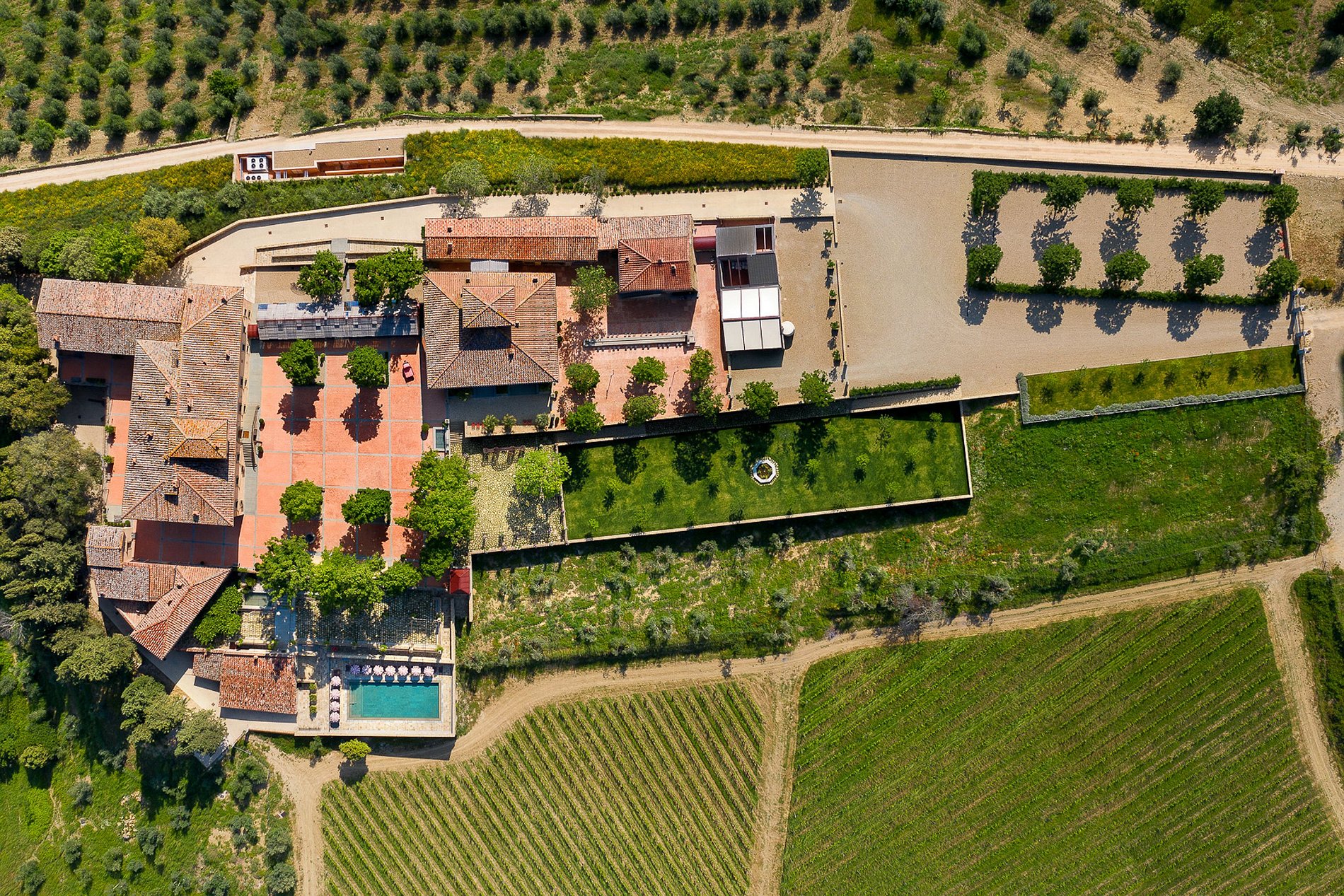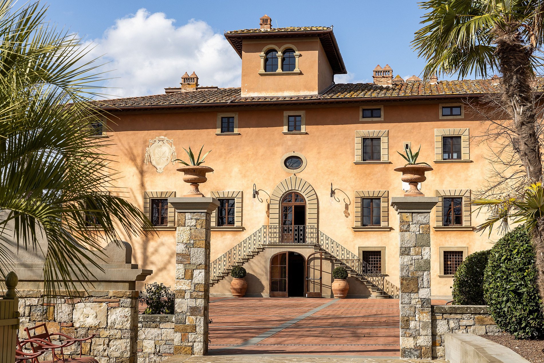 En el corazón de la finca se encuentra una villa renacentista del siglo XIV, construida originalmente por una noble familia florentina. Rodeada de hileras de cipreses, viñedos y olivos, la villa encarna la elegancia arquitectónica de la Toscana en un entorno natural sereno. Los jardines, diseñados por el estudio liderado por el reconocido arquitecto Patrice Taravella (creador de los jardines de Babylonstoren y The Newt), combinan árboles maduros —como pinos, tilos y palmeras— con un paisajismo mineral enriquecido por cientos de macetas de terracota artesanales de Impruneta.