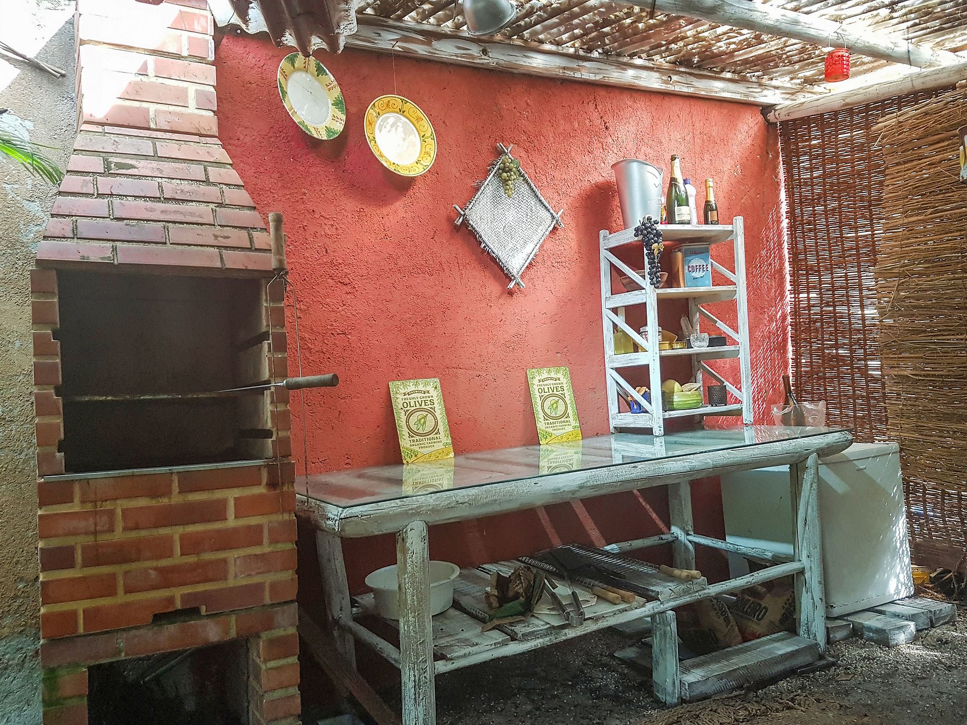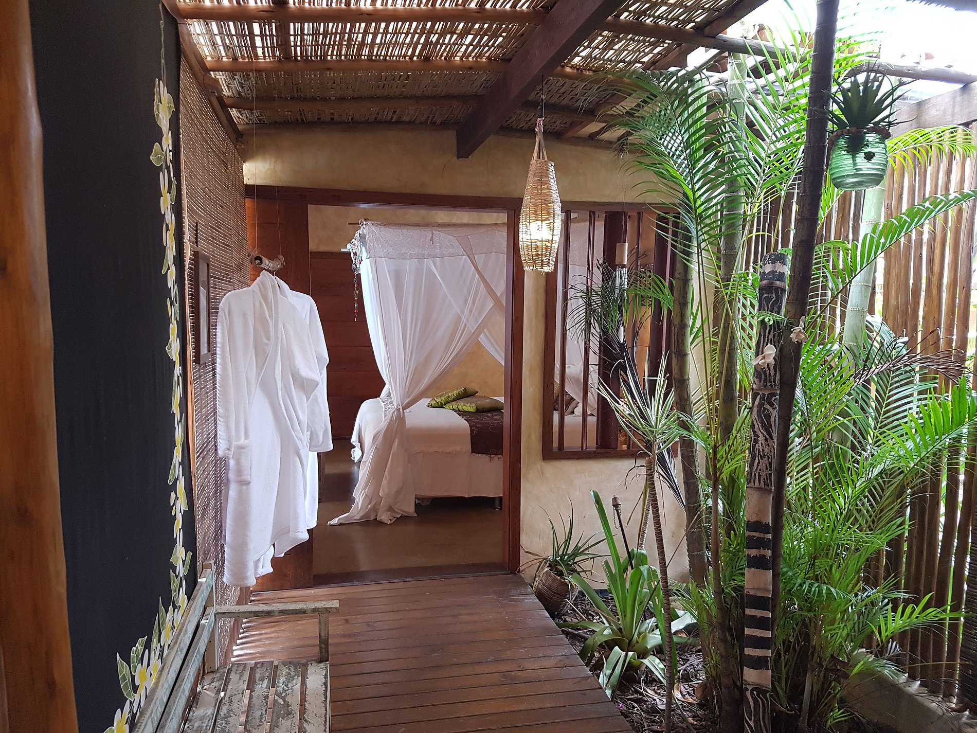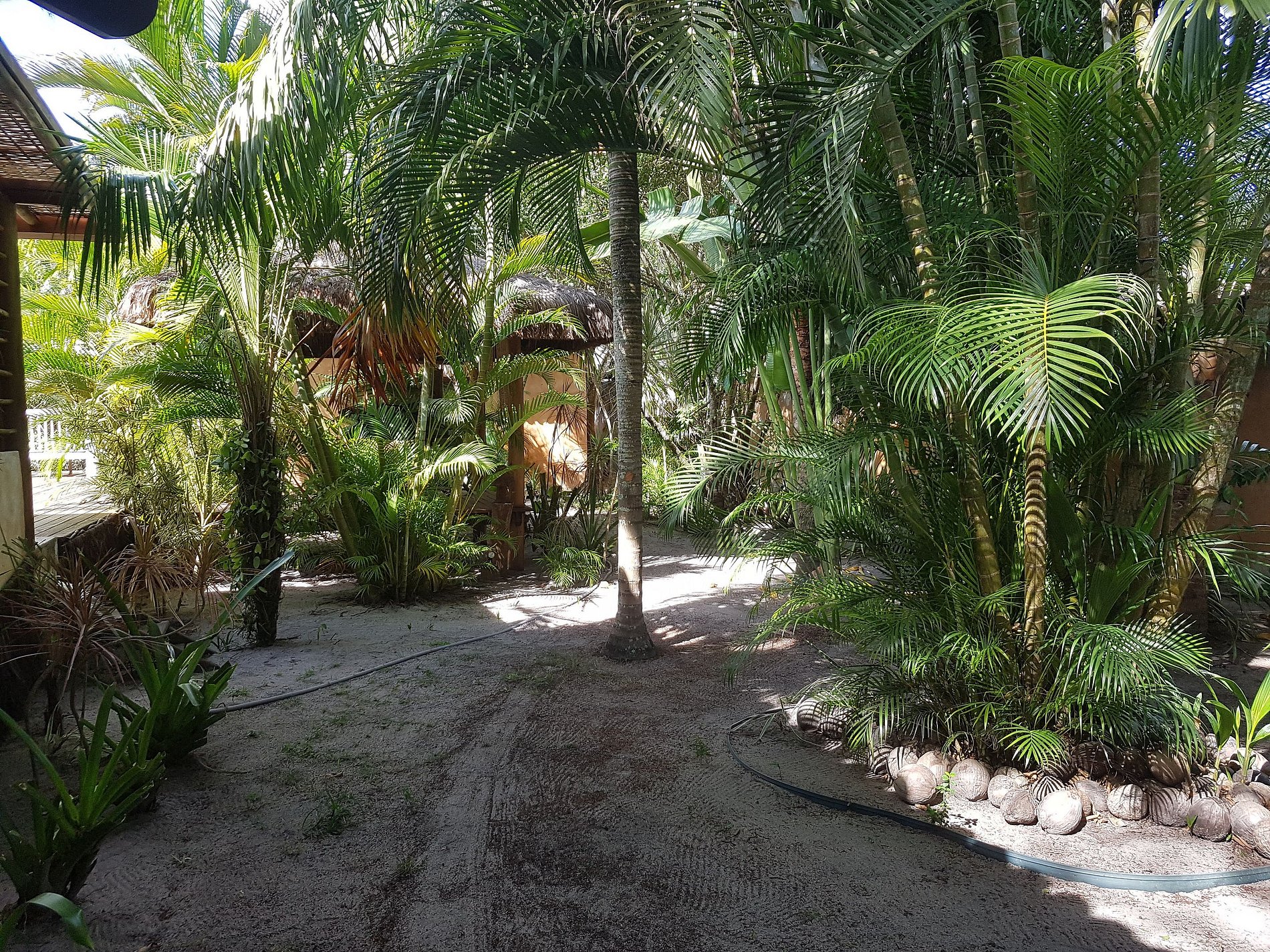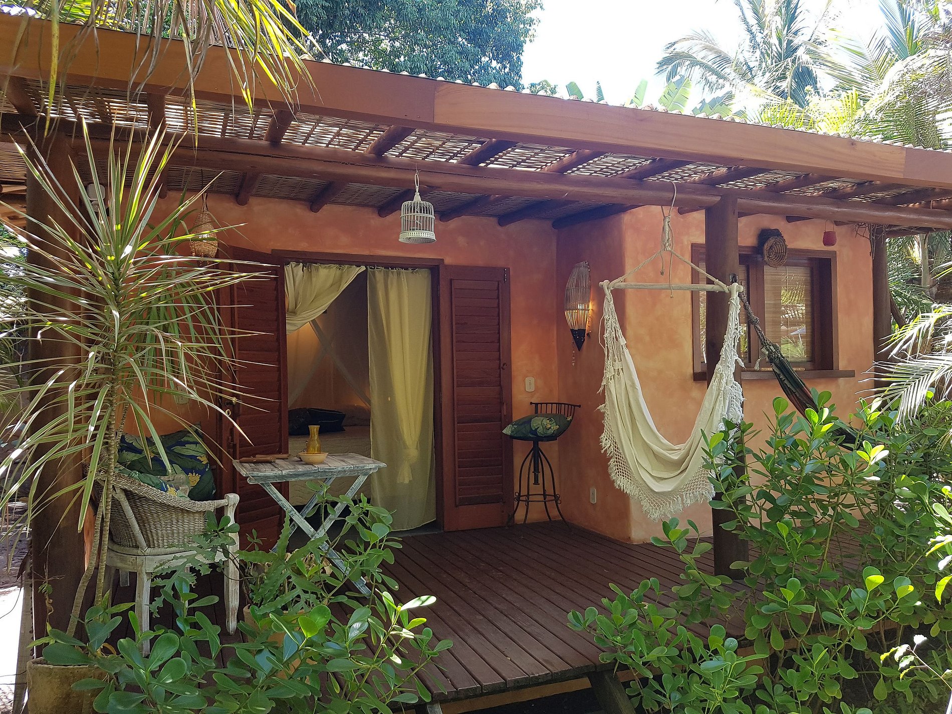 Muy hermoso jardín tropical con muchas especies de plantas, muy verde. En medio del jardín, una cama doble cubierta. En un rincón del jardín tropical, un espacio cubierto llamado "Espaço Caraíva" con una gran mesa y dos grandes bancos de eucalipto con capacidad para más de 10 personas. Barbacoa con ladrillos refractarios, heladera.