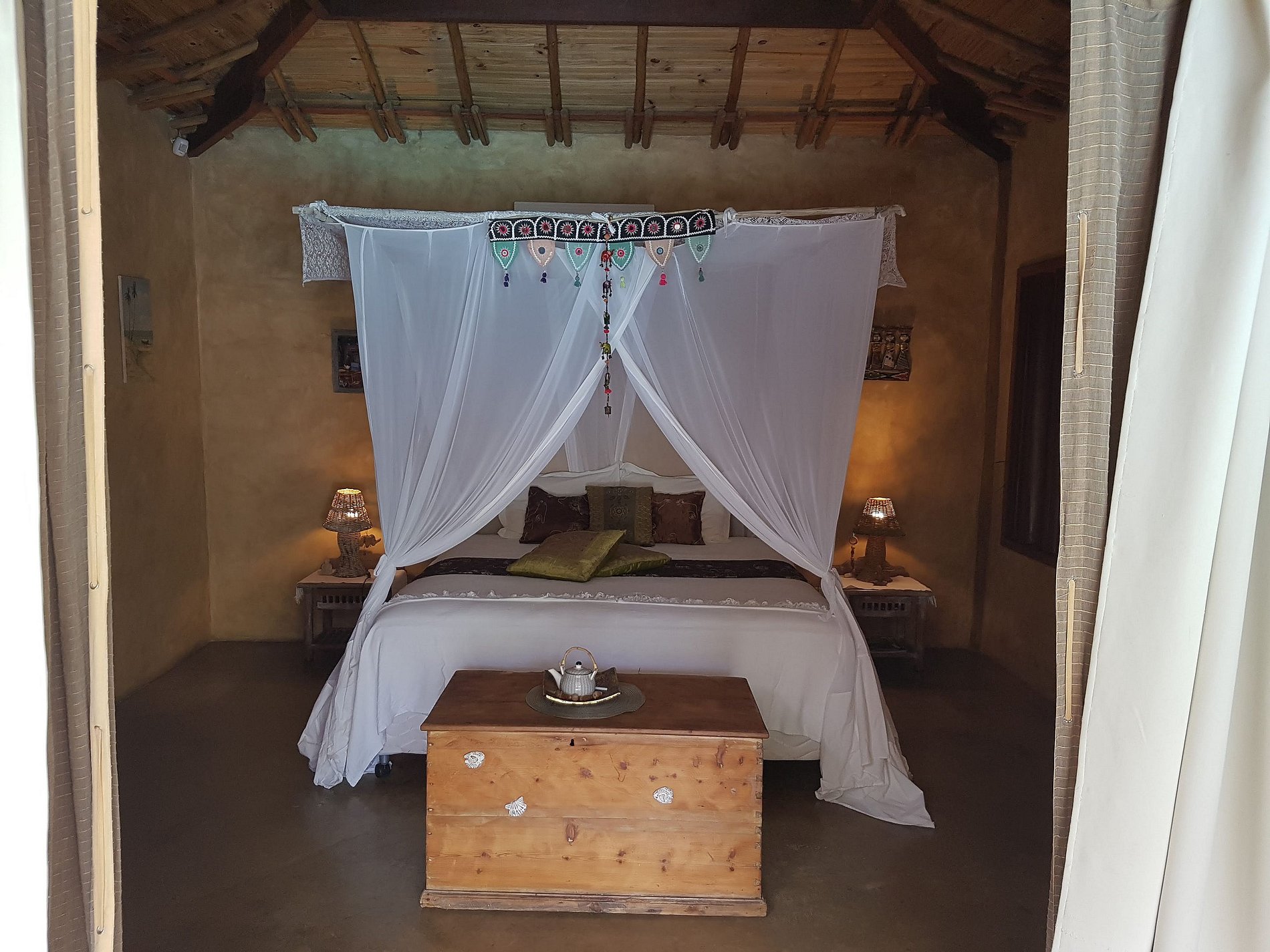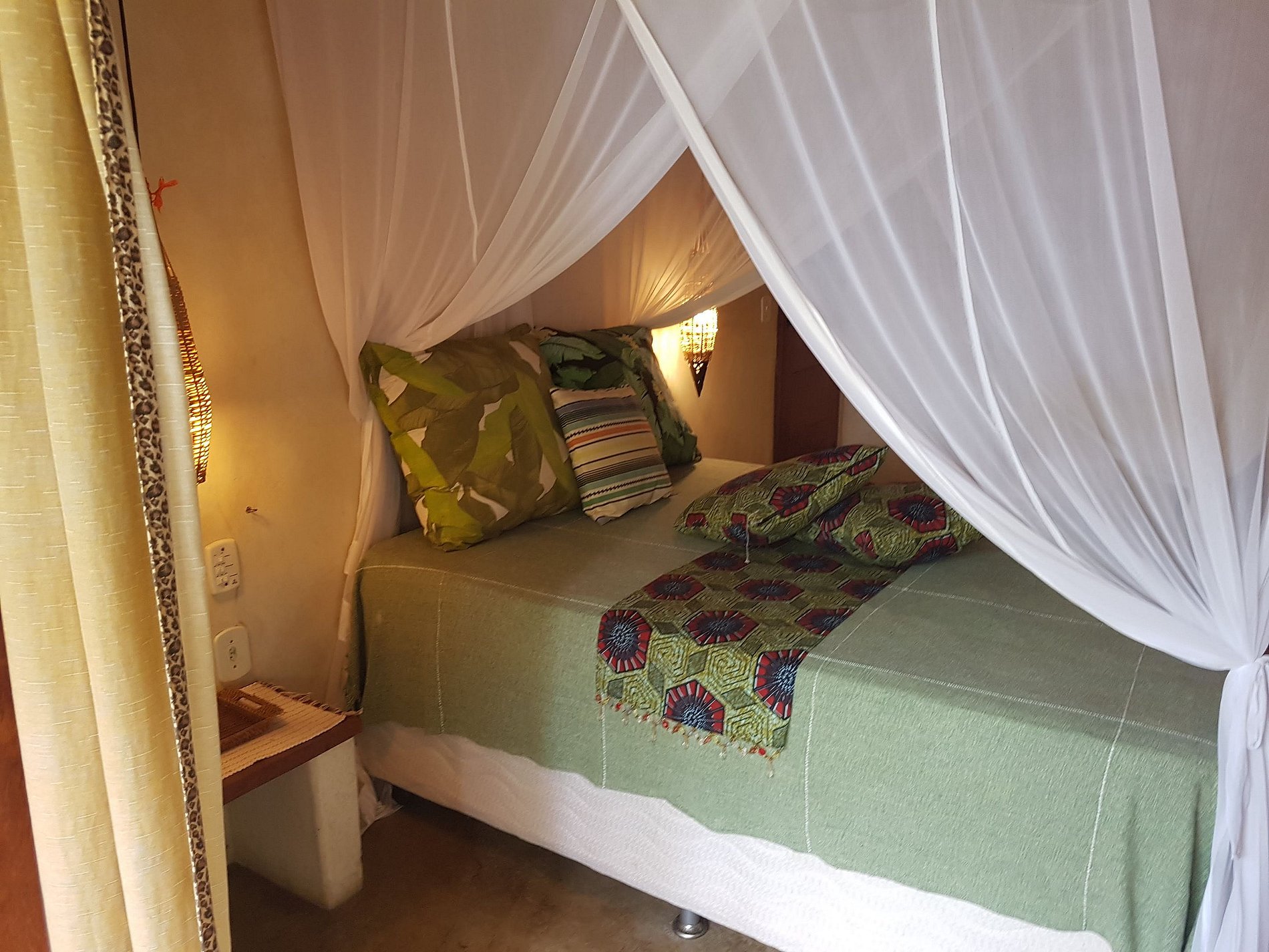 Chalet independiente con terraza privada con vista al jardín tropical, ubicado a la entrada de la propiedad en el borde del jardín tropical. Consta de un dormitorio con 1 cama queen con mosquitero, aire acondicionado y ventilador de techo. Una pequeña sala de estar con 2 camas individuales, TV y ventilador de techo. Pequeña cocina con nevera, baño con ducha separada, armario, WC separado con puerta, caja fuerte.
