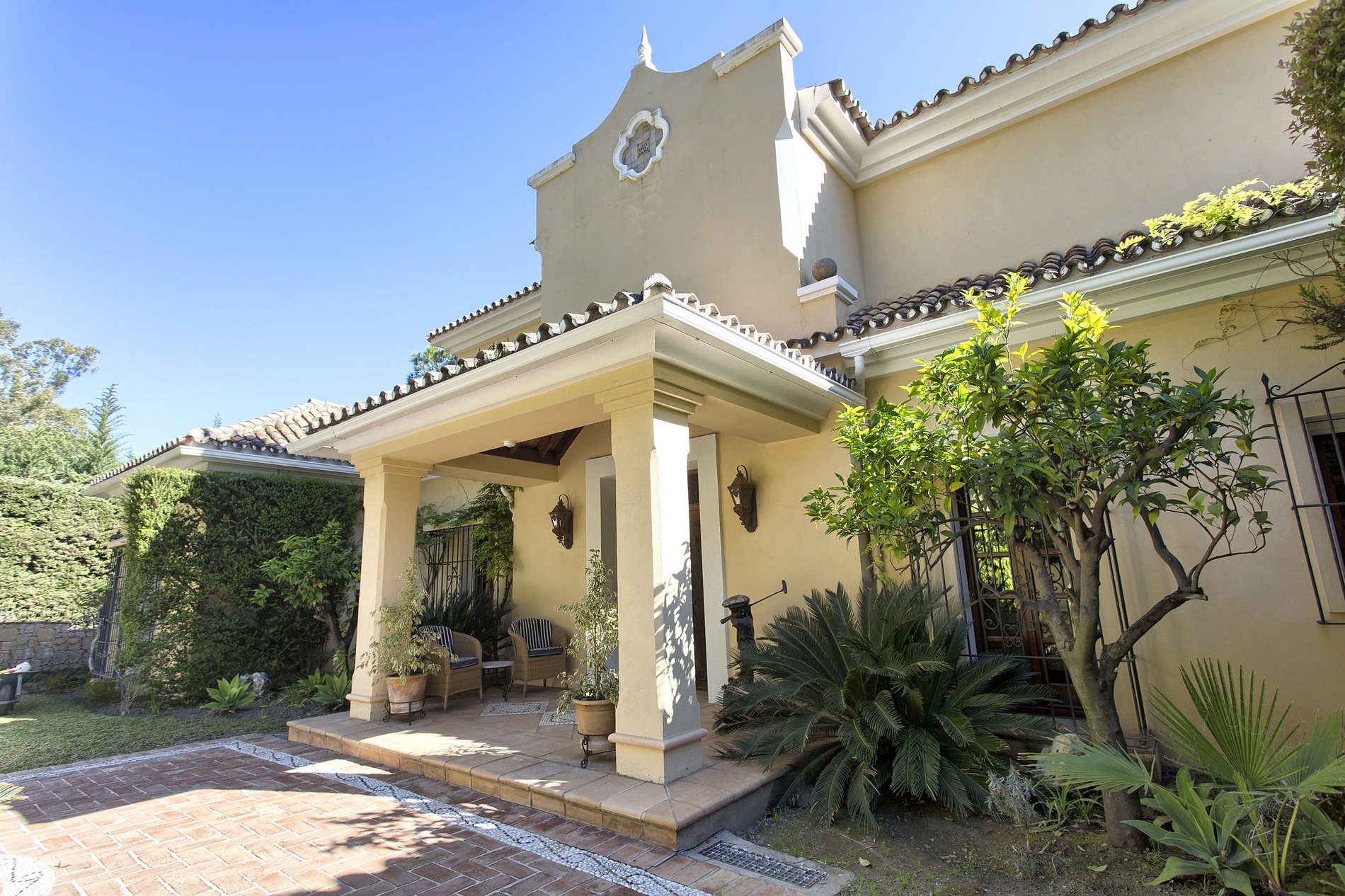 La villa de 560 metros cuadrados, incluye una casa de huéspedes de 70 metros cuadrados. La entrada al patio conduce directamente a un pasillo de doble cara, que sigue al encantador salón con una chimenea de leña. Cuenta con 5 dormitorios en total y tiene capacidad para 10 personas. Tres dormitorios están ubicados en el edificio principal más un dormitorio al final de la casa con entrada y salida independientes al jardín y la piscina. Esta habitación doble también tiene sauna. El quinto dormitorio está en la casa de huéspedes.