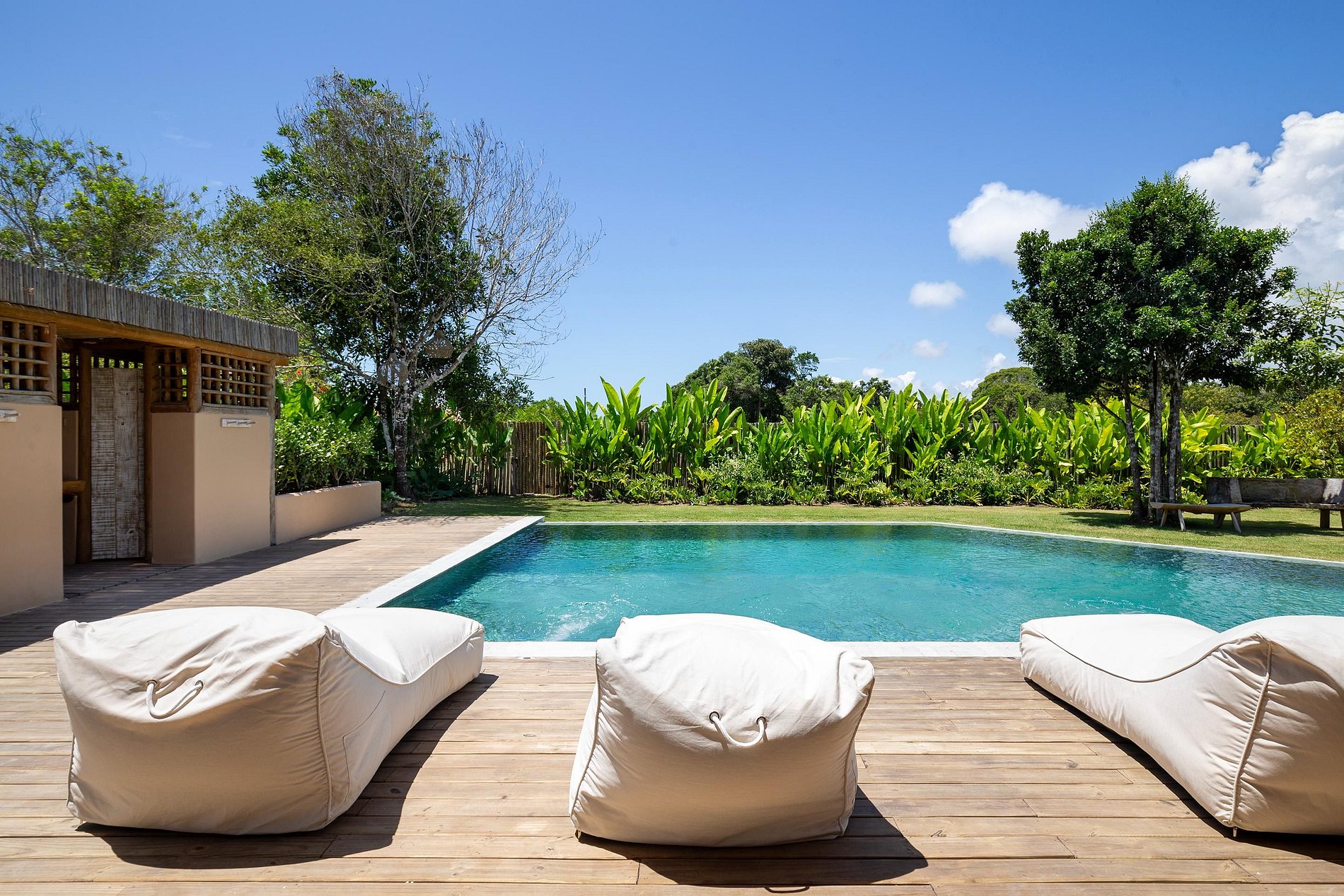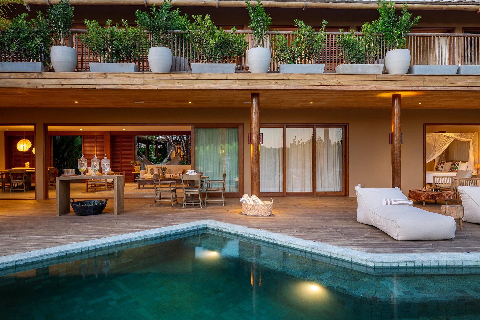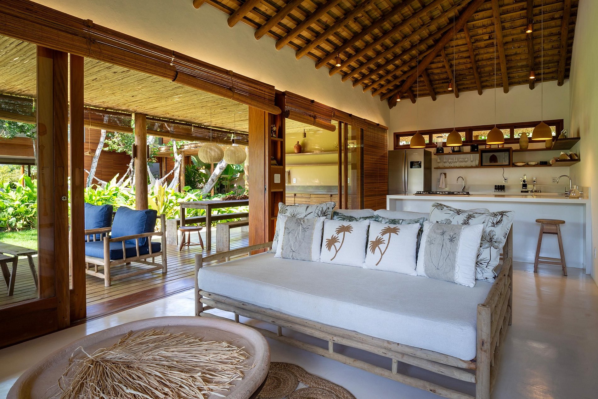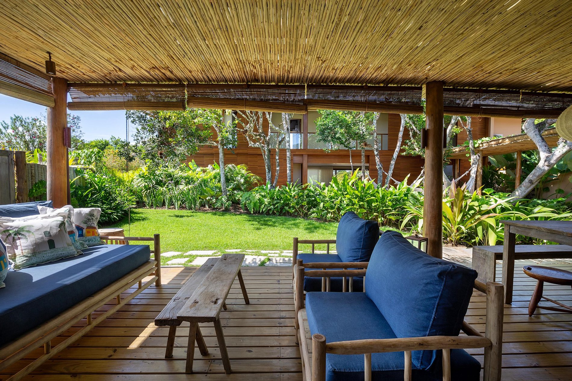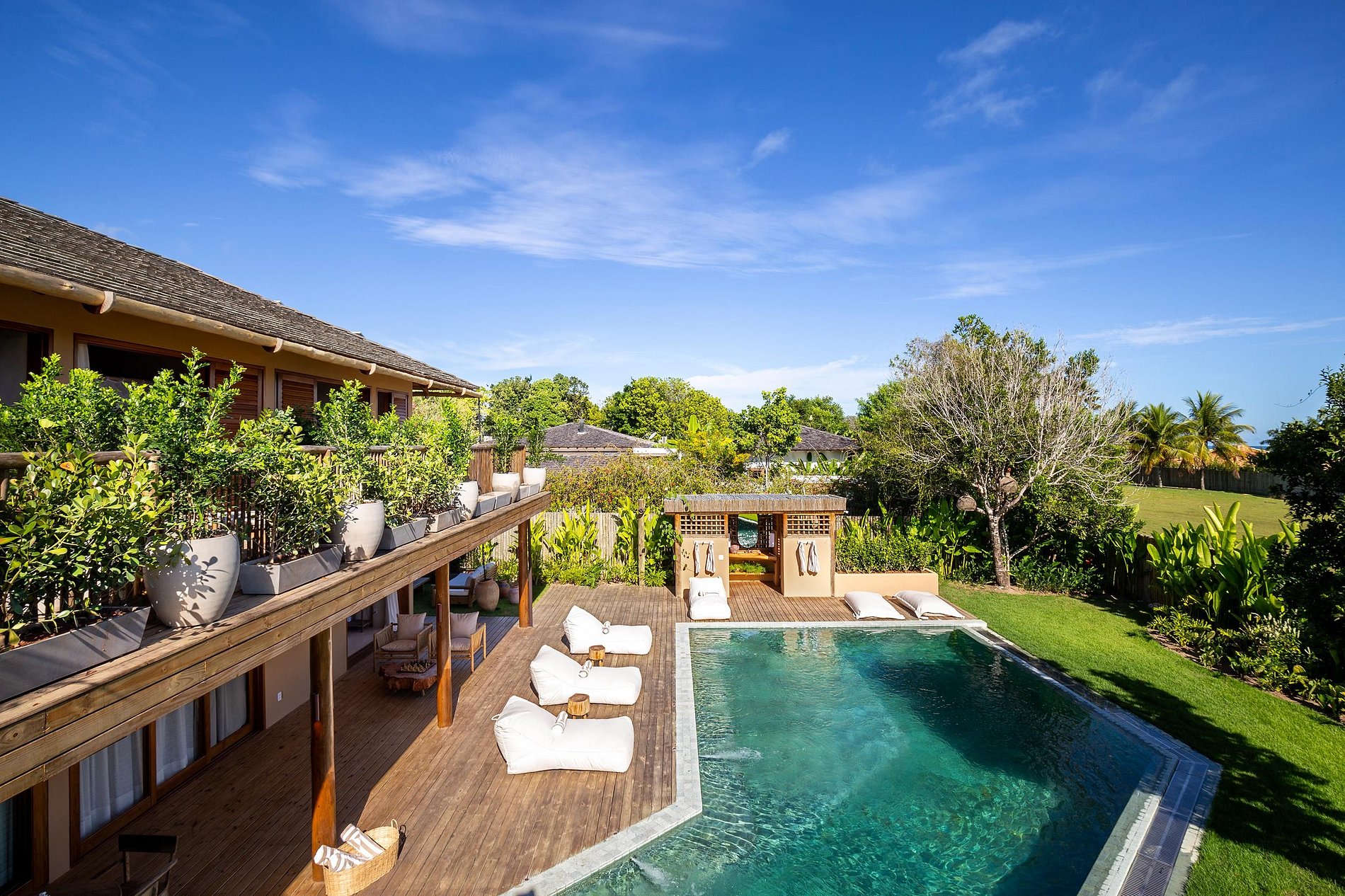 Ubicada en la hermosa comunidad de Altos de Trancoso, la casa ofrece siete suites, bien distribuidas entre el jardín, la casa principal y los edificios individuales. Tiene capacidad para 14 personas.