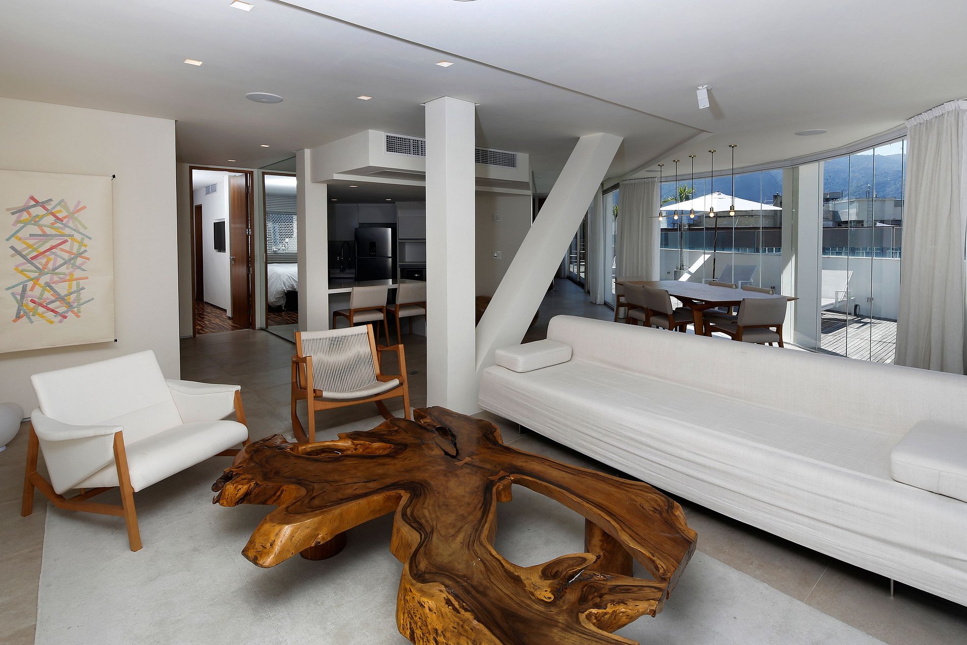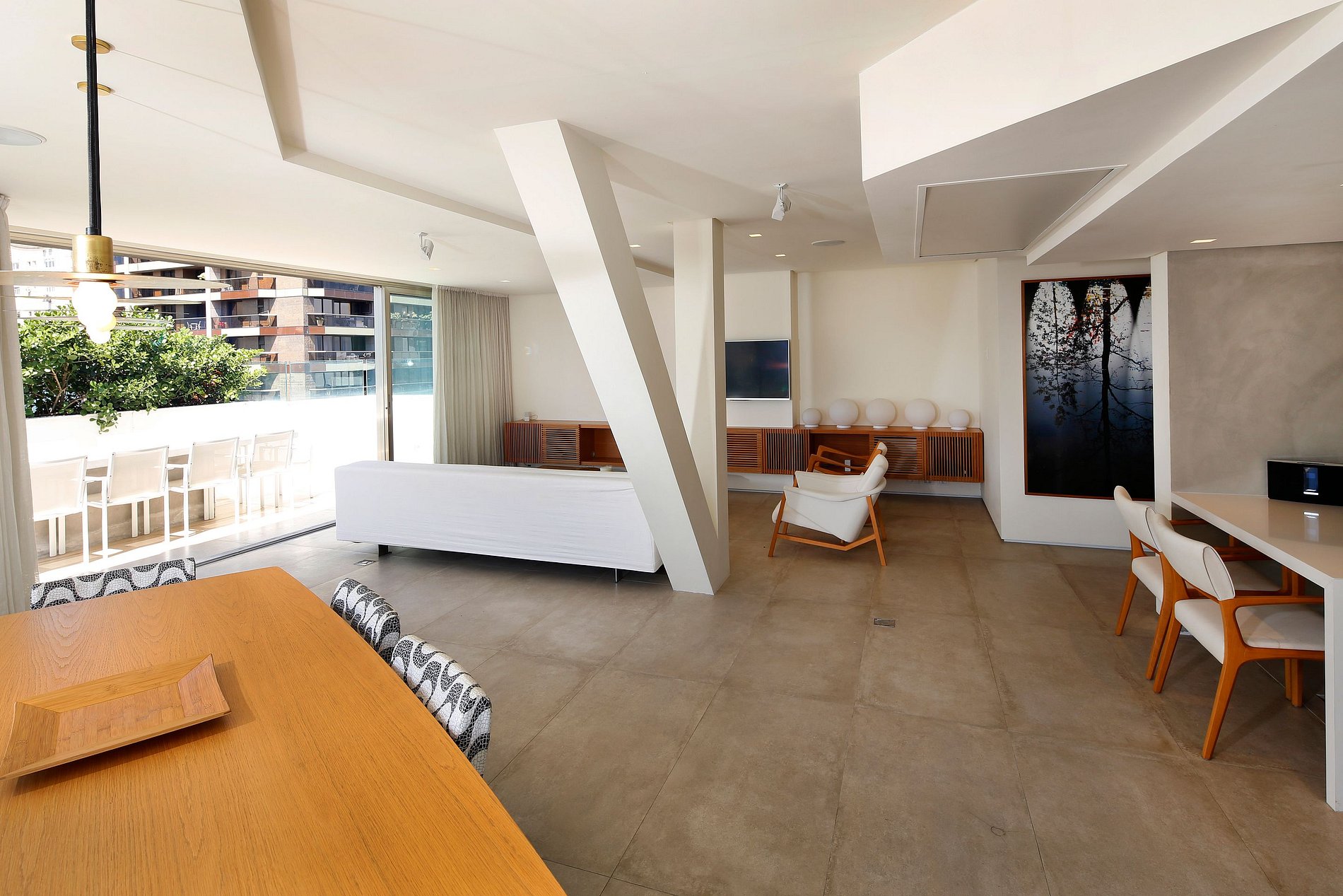 El apartamento mide 300m² de área total y posee 3 grandes suites. Estos y sus respectivos cuartos de baño han sido diseñados en estilo súper exclusivo, moderno y arrojado. El área común cuenta con una cocina completamente reformada y con acabados en cemento quemado, que combinan perfectamente con los avanzados electrodomésticos en acero inoxidable. El salón principal cuenta con ventanas que van del suelo al techo y con una mesa de comedor para hasta 6 personas.