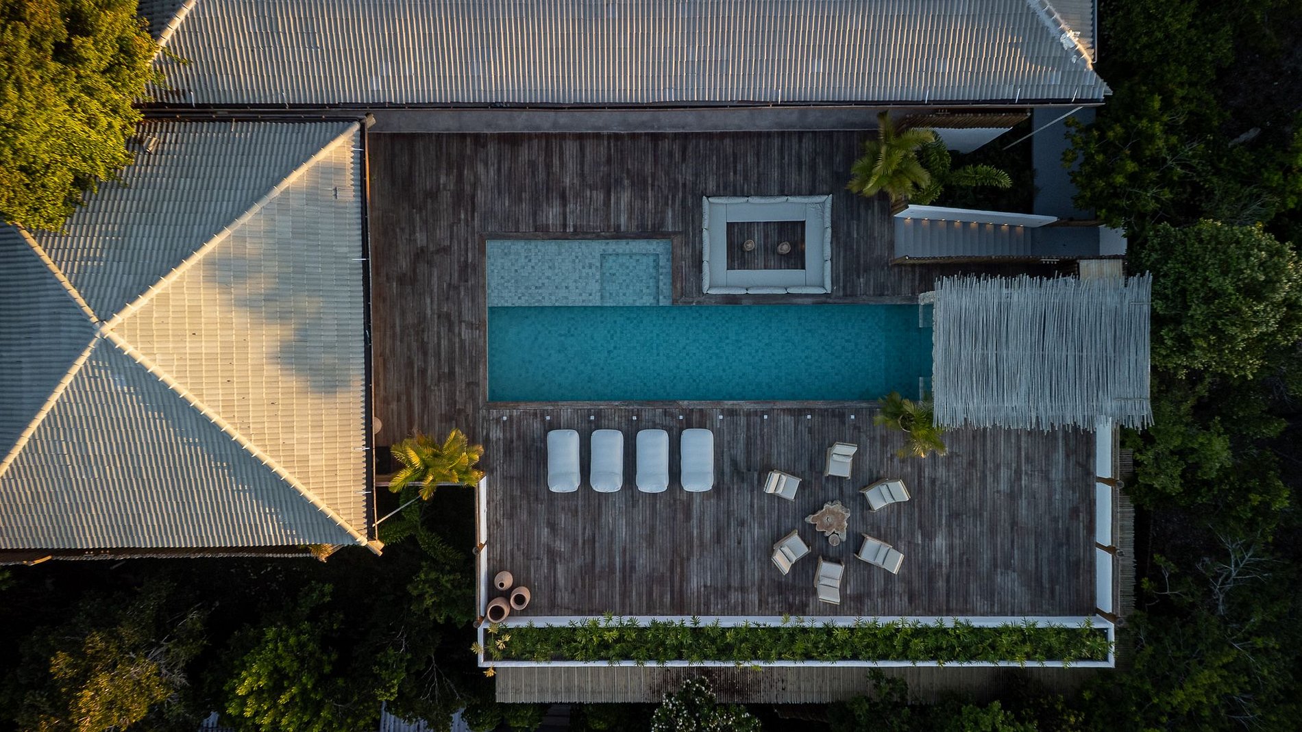 En la terraza del balcón, hay sofás a la altura de la piscina. La piscina cuenta con una bañera de hidromasaje en la parte menos profunda y un carril de 20 metros que da acceso al sauna. El baño turco tiene una pared de cristal y acceso directo a la piscina.