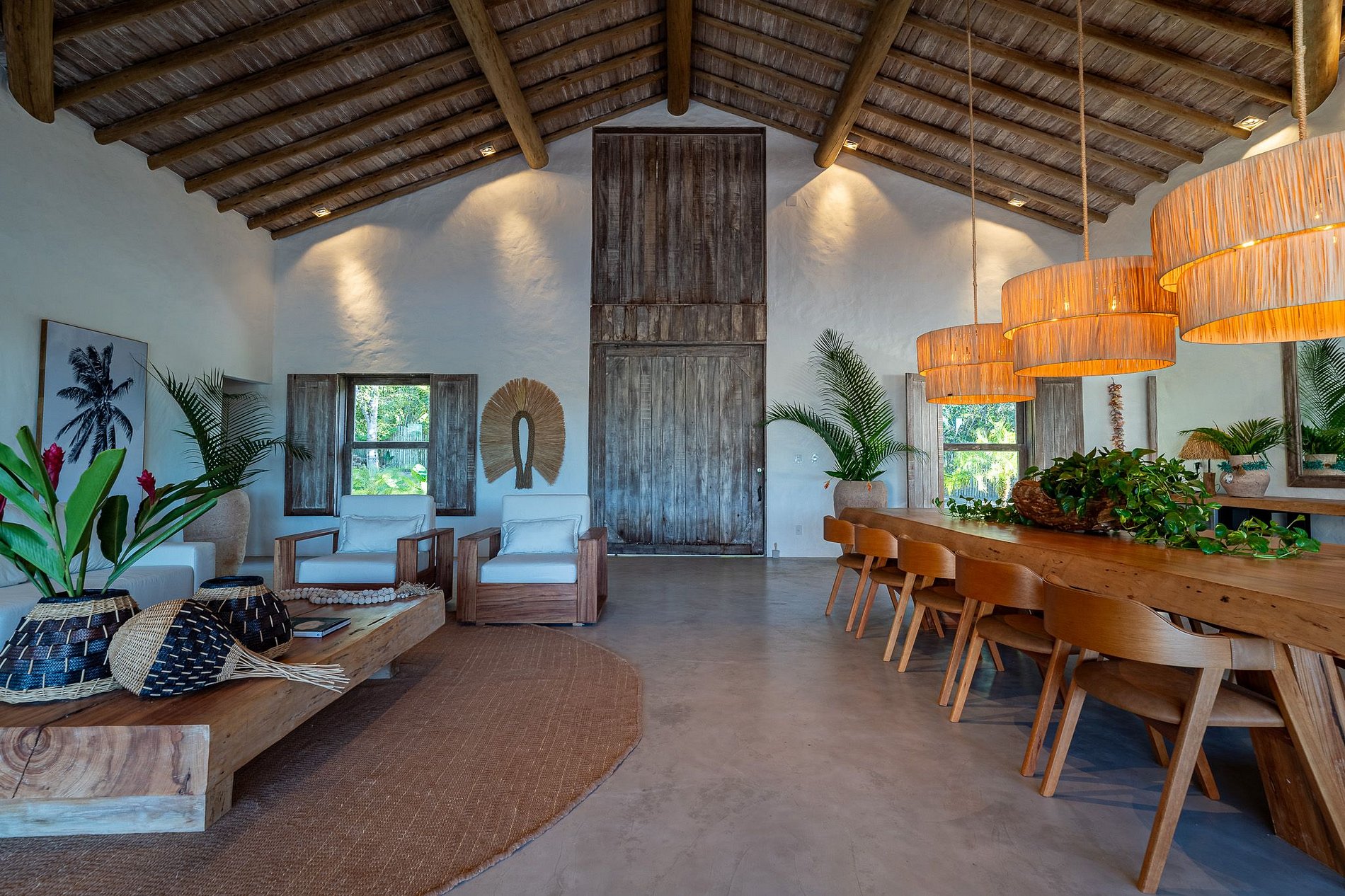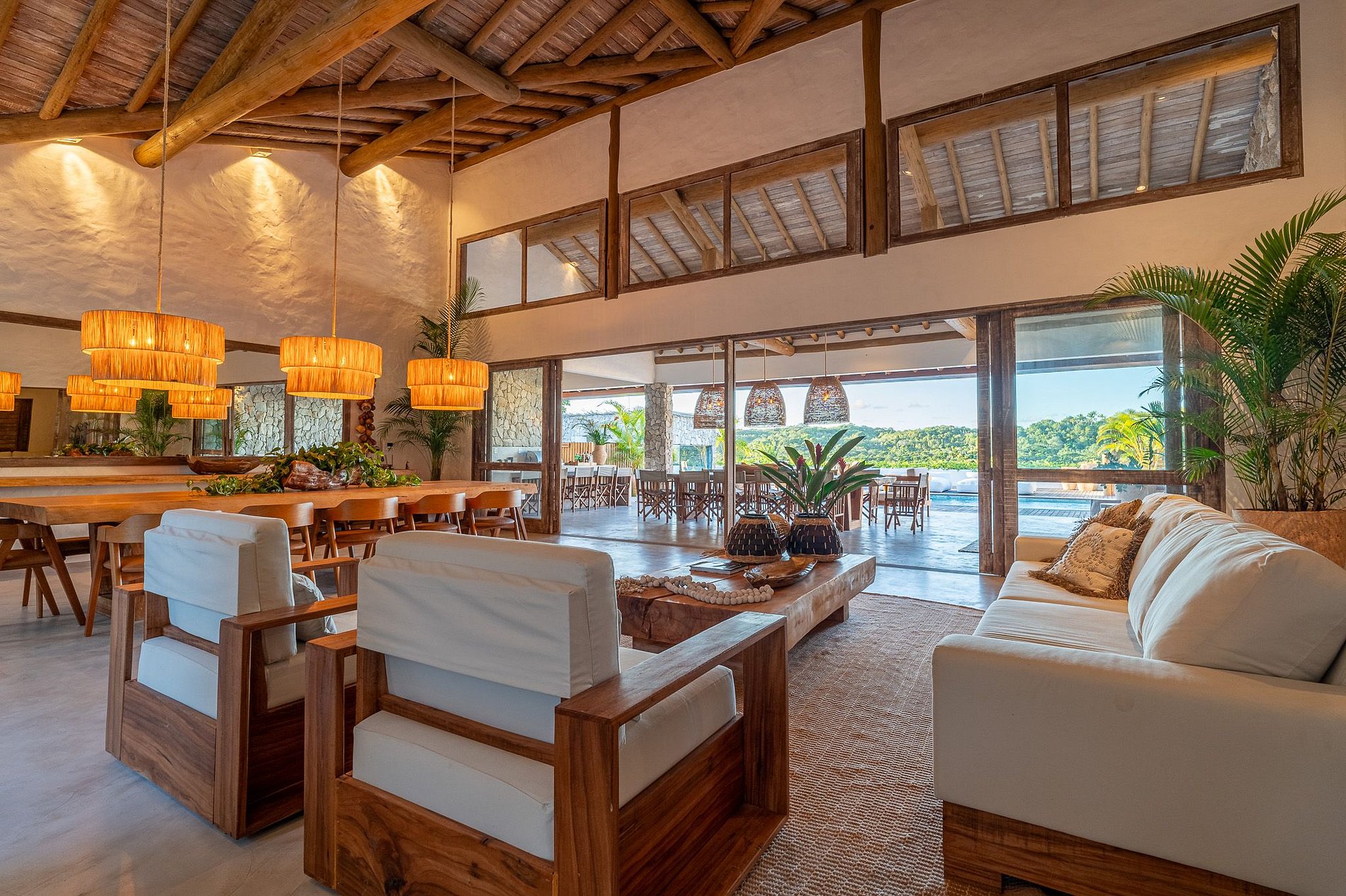 Al entrar a la casa, se abre una amplia sala de estar y comedor con una mesa para 12 personas. Al lado se encuentra la sala de televisión: climatizada, con home cinema, un televisor de 75 pulgadas y cómodos sofás. El balcón, con sus propias sillas y sofás, cuenta con otra mesa de comedor para 12 personas. La cocina gourmet está equipada con parrilla eléctrica, máquina de hielo, enfriador de cerveza, dos refrigeradores y una encimera con placa de cocina.