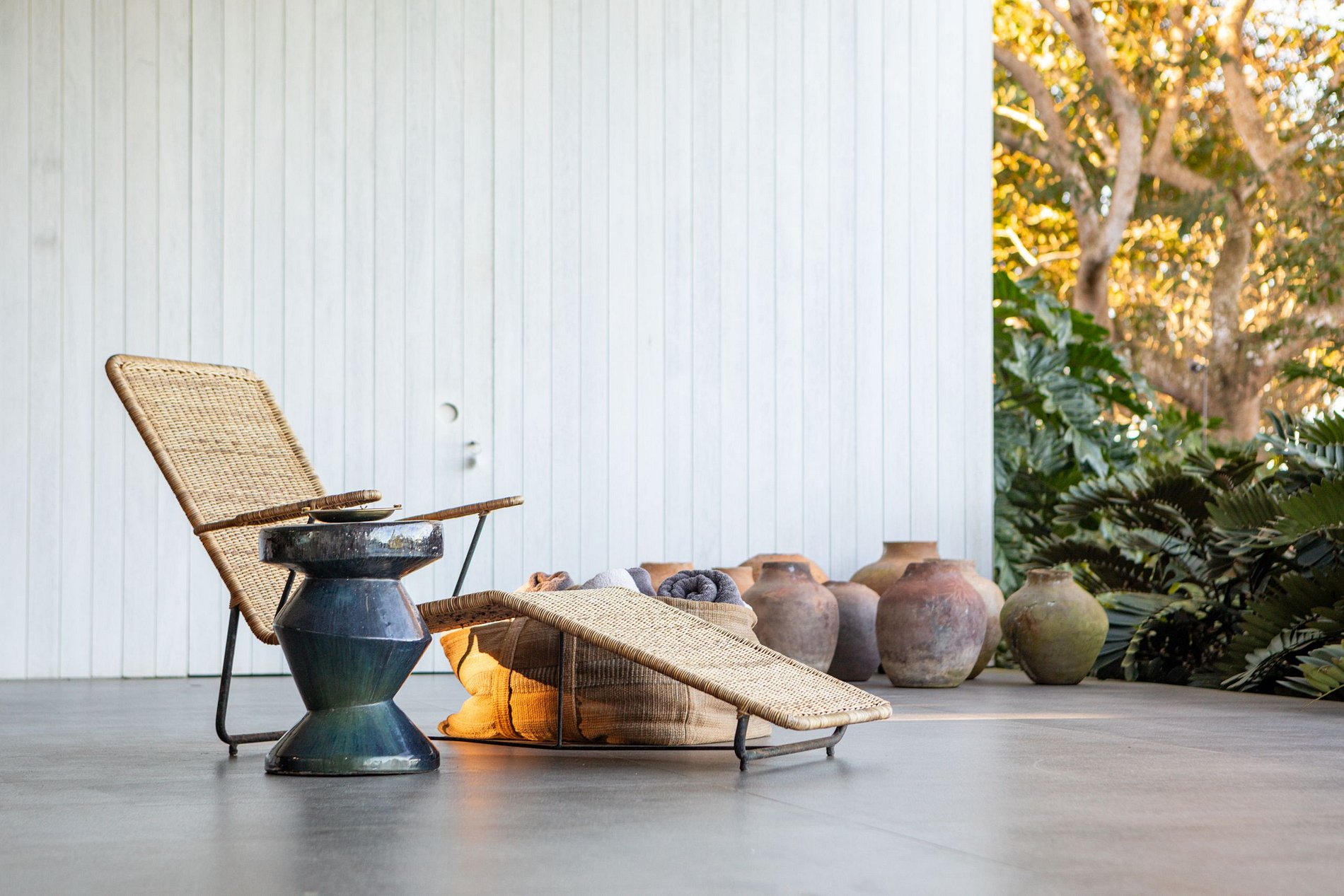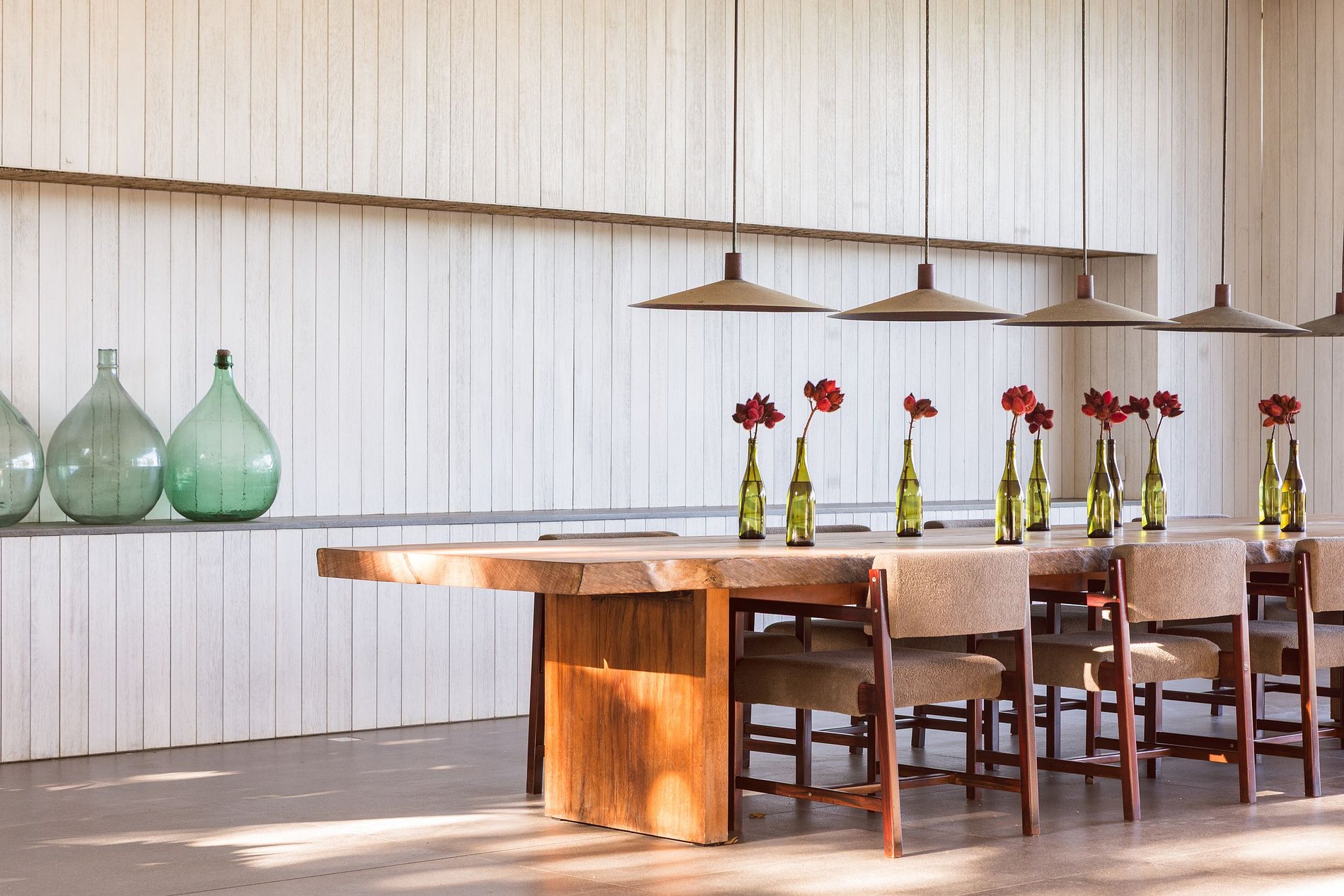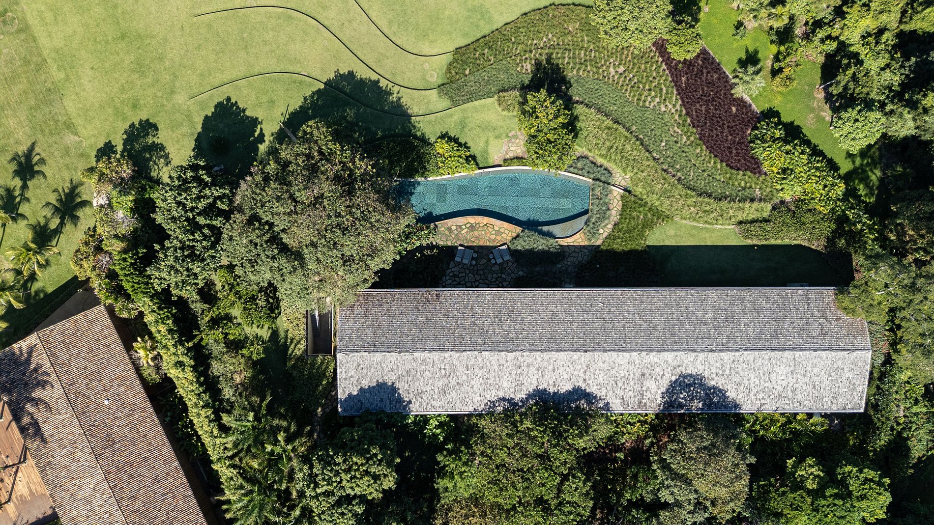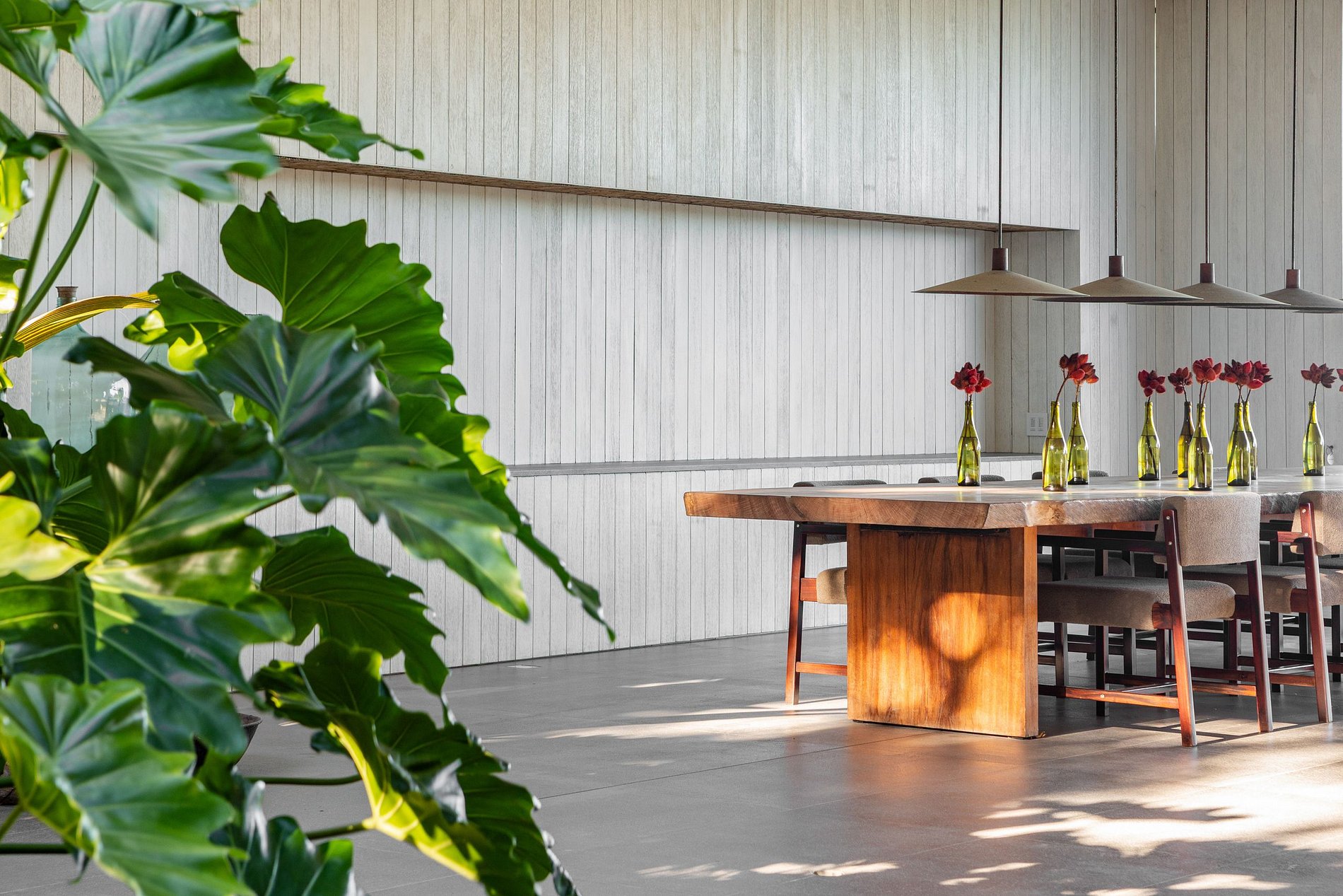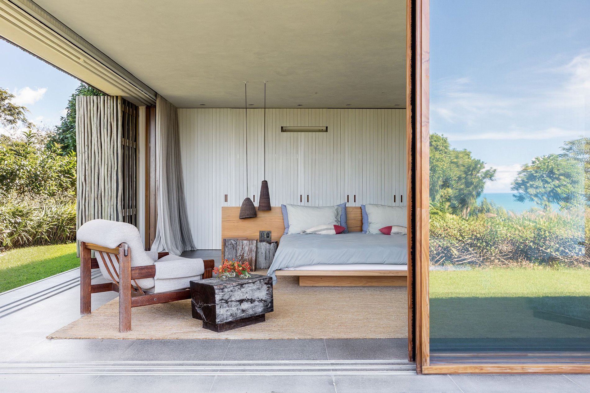 Al ingresar, el visitante se encuentra con un impresionante living abierto de más de 170 m², donde las áreas de estar y comedor se expanden en continuidad con el exterior. El mobiliario, cuidadosamente seleccionado en anticuarios de São Paulo y retapizado en tonos naturales, evoca una elegancia atemporal que contrasta poéticamente con el entorno tropical. Las puertas y paneles móviles de Viroc se pliegan como biombos, disolviendo los límites entre interior y exterior, y ofreciendo una experiencia sensorial marcada por transparencias, luces y sombras en constante transformación.