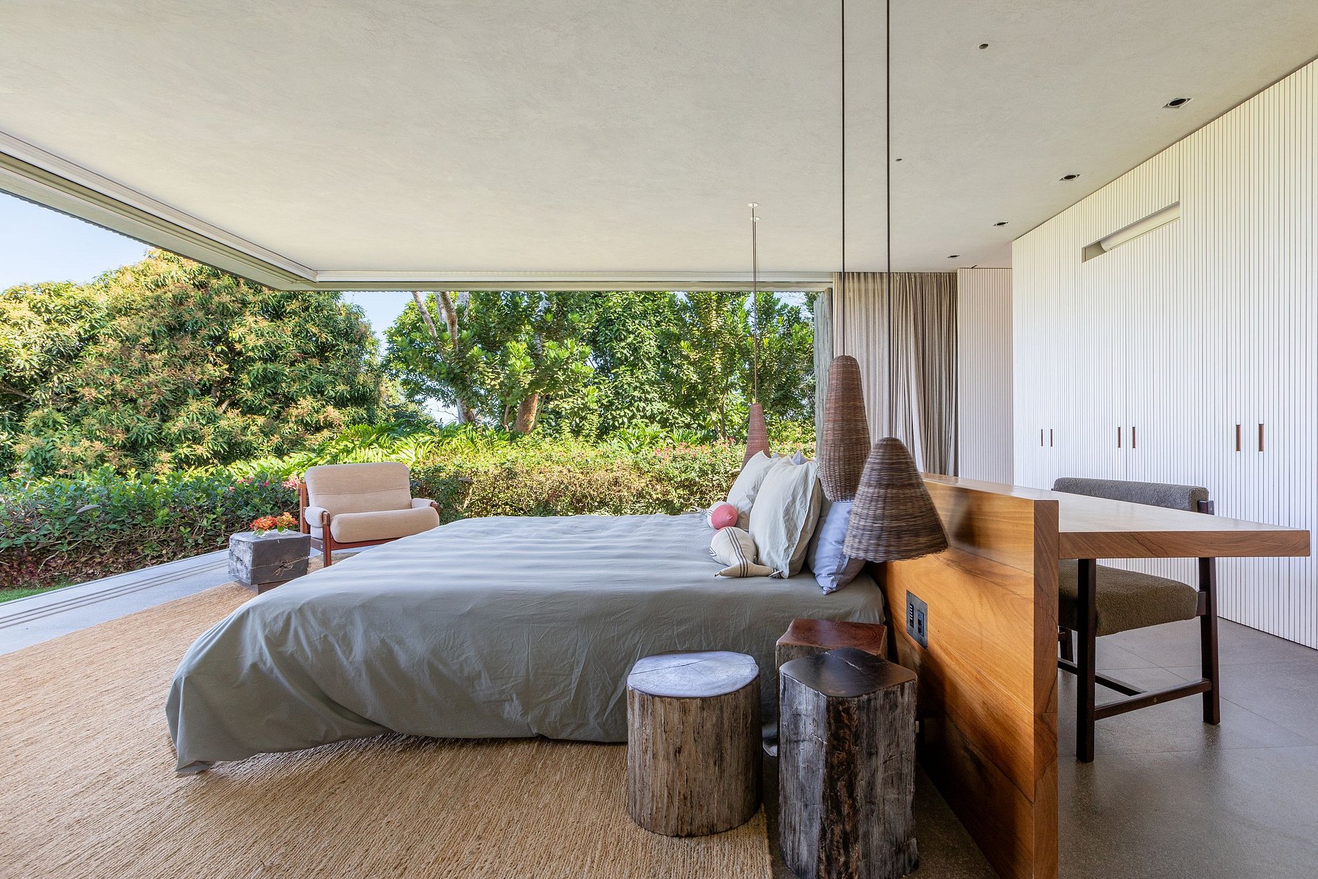 Al ingresar, el visitante se encuentra con un impresionante living abierto de más de 170 m², donde las áreas de estar y comedor se expanden en continuidad con el exterior. El mobiliario, cuidadosamente seleccionado en anticuarios de São Paulo y retapizado en tonos naturales, evoca una elegancia atemporal que contrasta poéticamente con el entorno tropical. Las puertas y paneles móviles de Viroc se pliegan como biombos, disolviendo los límites entre interior y exterior, y ofreciendo una experiencia sensorial marcada por transparencias, luces y sombras en constante transformación.