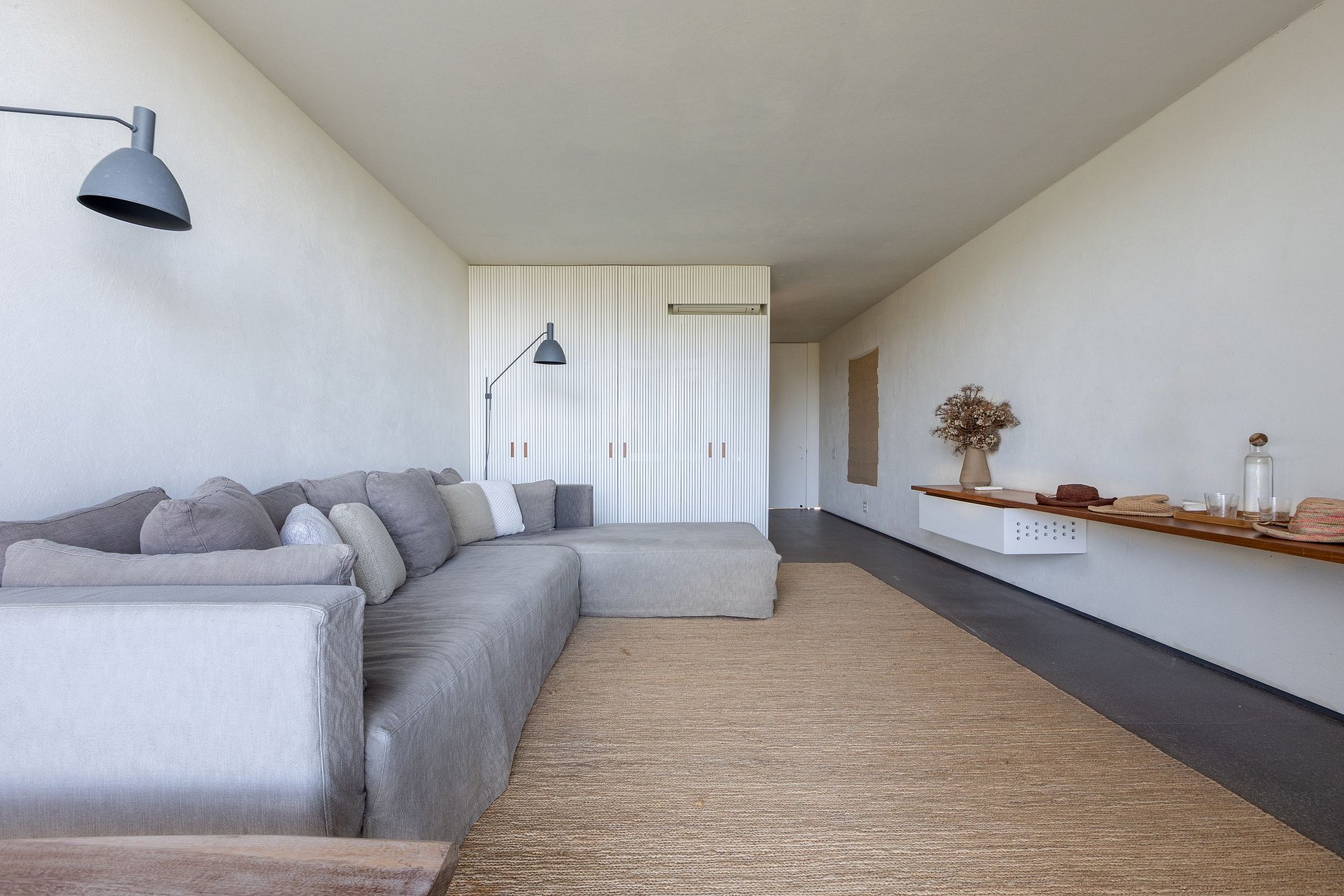 Al ingresar, el visitante se encuentra con un impresionante living abierto de más de 170 m², donde las áreas de estar y comedor se expanden en continuidad con el exterior. El mobiliario, cuidadosamente seleccionado en anticuarios de São Paulo y retapizado en tonos naturales, evoca una elegancia atemporal que contrasta poéticamente con el entorno tropical. Las puertas y paneles móviles de Viroc se pliegan como biombos, disolviendo los límites entre interior y exterior, y ofreciendo una experiencia sensorial marcada por transparencias, luces y sombras en constante transformación.