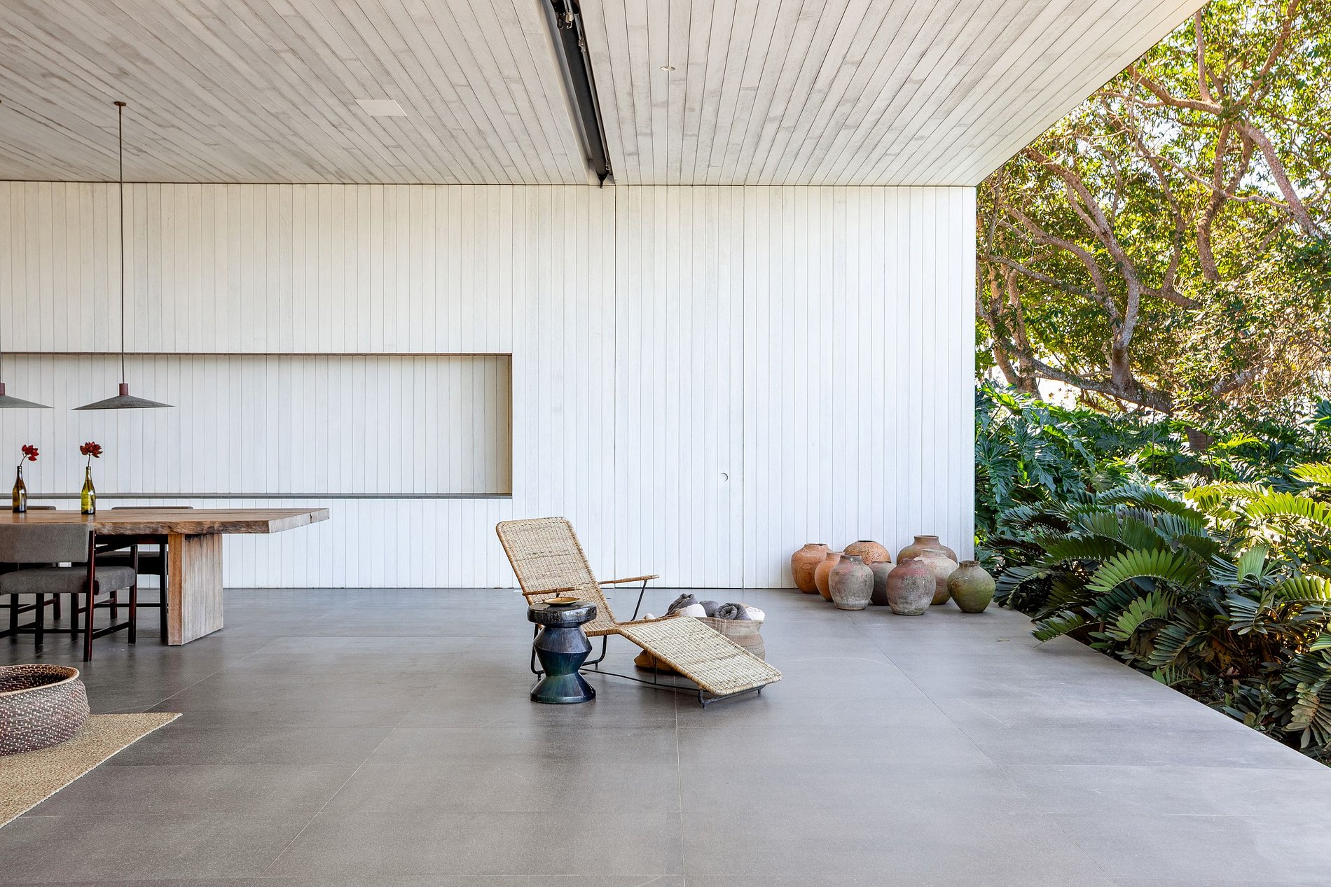 Al ingresar, el visitante se encuentra con un impresionante living abierto de más de 170 m², donde las áreas de estar y comedor se expanden en continuidad con el exterior. El mobiliario, cuidadosamente seleccionado en anticuarios de São Paulo y retapizado en tonos naturales, evoca una elegancia atemporal que contrasta poéticamente con el entorno tropical. Las puertas y paneles móviles de Viroc se pliegan como biombos, disolviendo los límites entre interior y exterior, y ofreciendo una experiencia sensorial marcada por transparencias, luces y sombras en constante transformación.