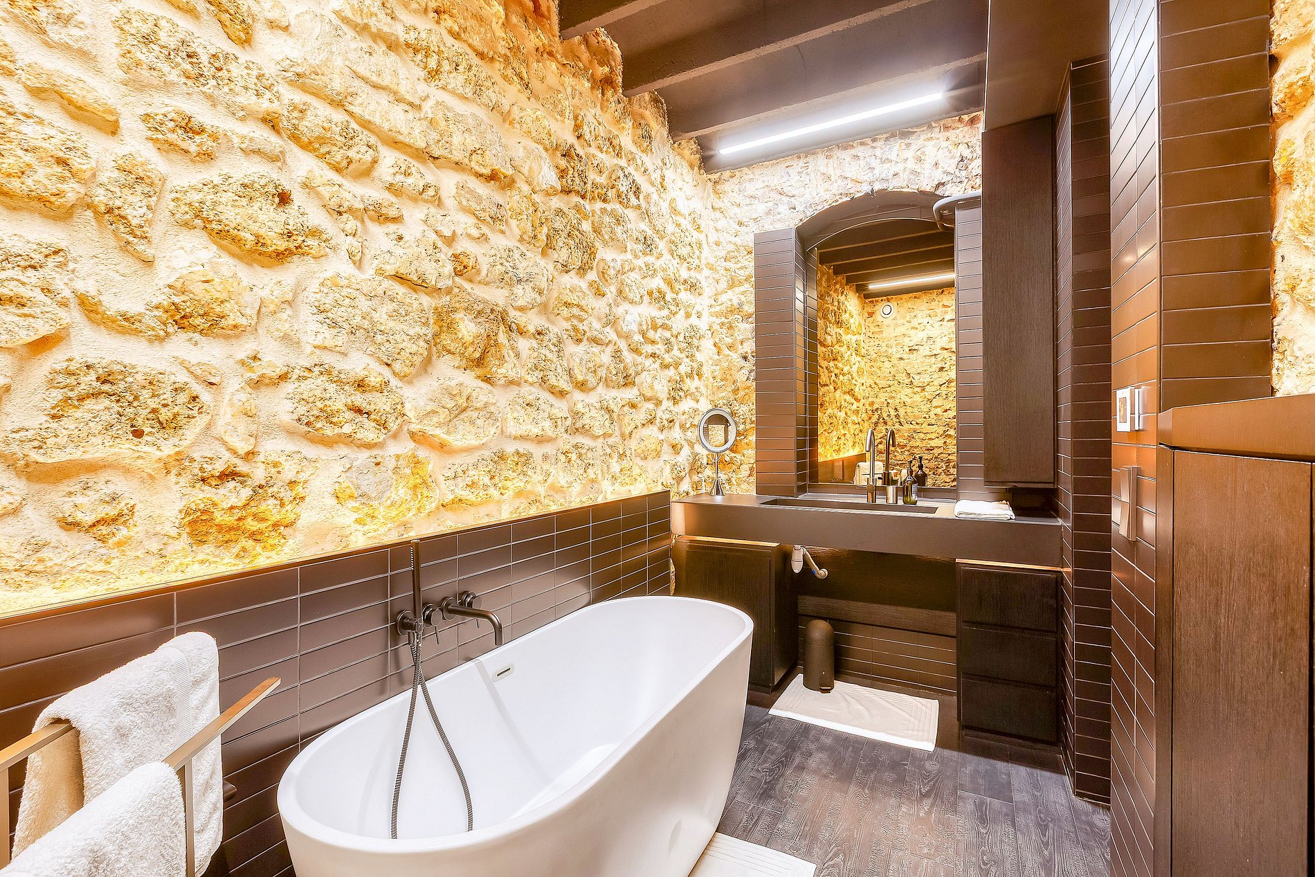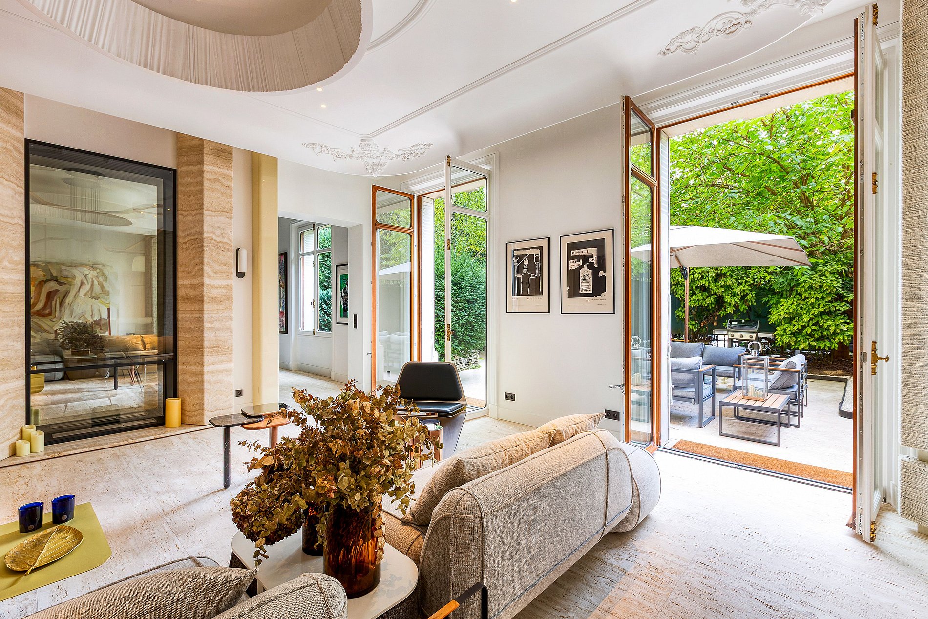 Revêtu intégralement de marbre travertin d’Italie, il s’ouvre sur un somptueux jardin privatif de 180 m² et bénéficie d’une entrée indépendante directement accessible depuis l’avenue.