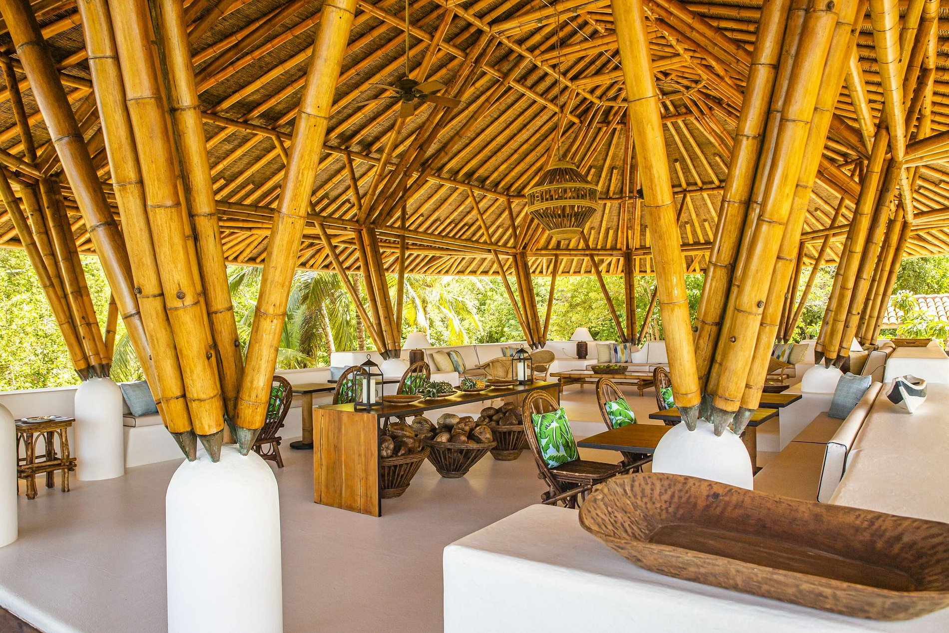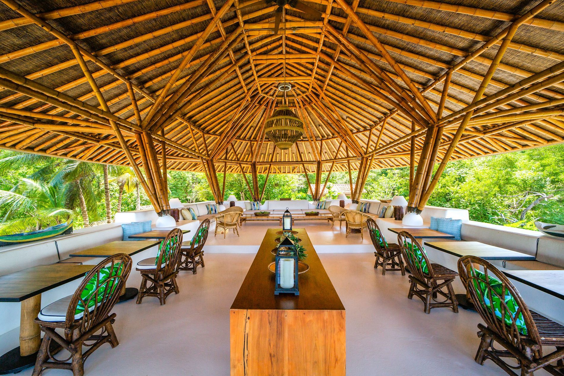 Le premier bungalow dispose de 3 chambres où 8 personnes peuvent dormir confortablement, d'un grand salon meublé principalement de pièces en bois et de canapés, et décoré avec de l'artisanat local qui complète la beauté de la nature environnante. La salle à manger est un espace ouvert avec vue sur la mer et une belle table en bois rustique pouvant accueillir 8 personnes.