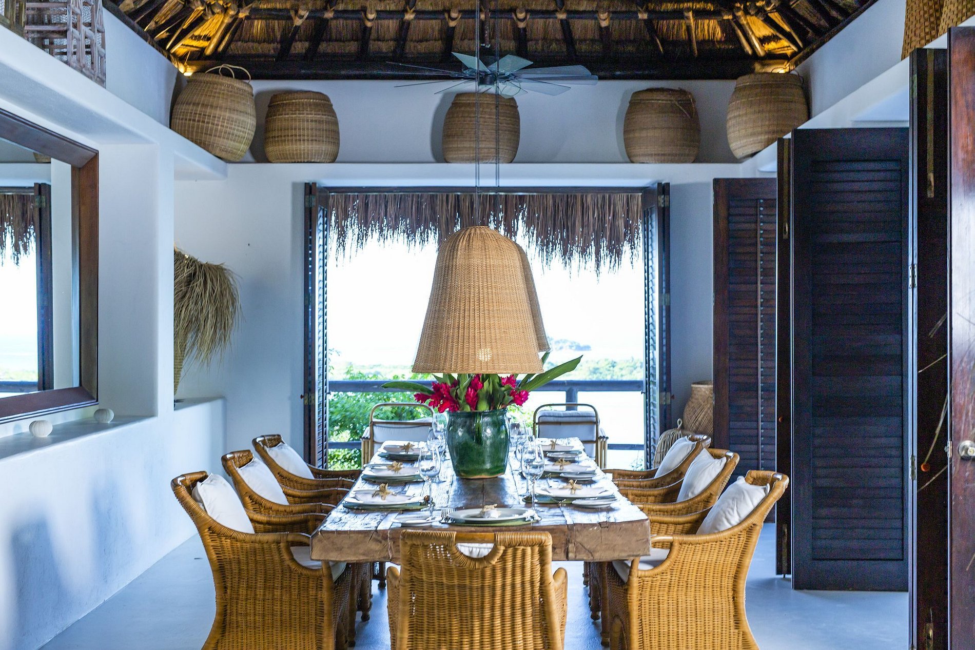 Le premier bungalow dispose de 3 chambres où 8 personnes peuvent dormir confortablement, d'un grand salon meublé principalement de pièces en bois et de canapés, et décoré avec de l'artisanat local qui complète la beauté de la nature environnante. La salle à manger est un espace ouvert avec vue sur la mer et une belle table en bois rustique pouvant accueillir 8 personnes.
