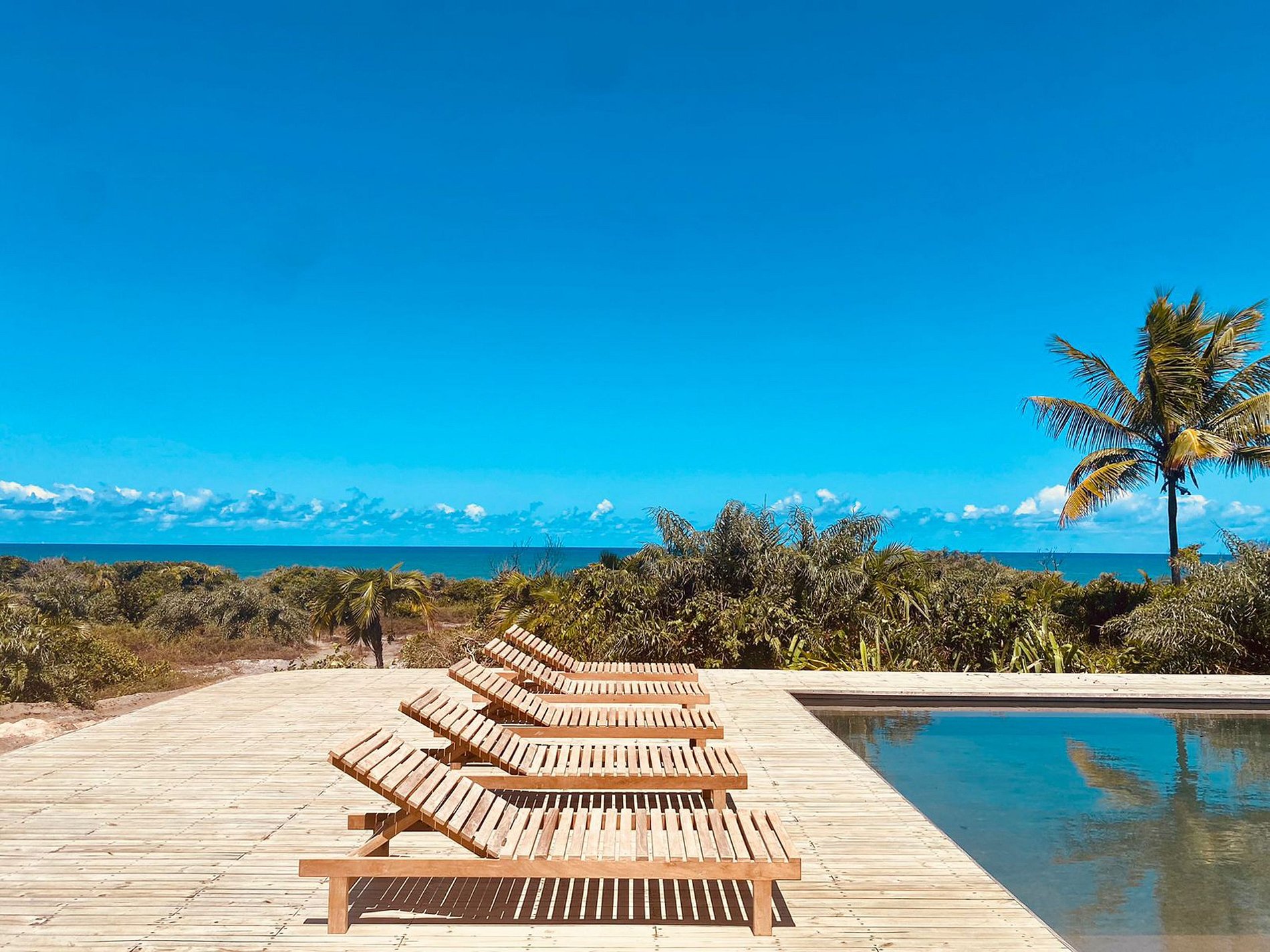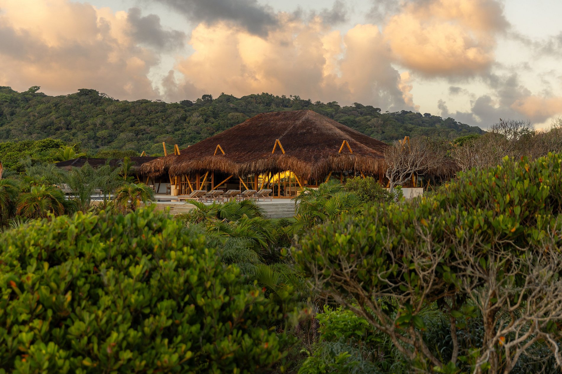 Le salon principal est un creux spectaculaire fait de bambou et de piassava, avec un design ouvert qui se jette sans effort sur une vaste terrasse en bois, où une piscine à débordement offre une vue imprenable sur l'océan.