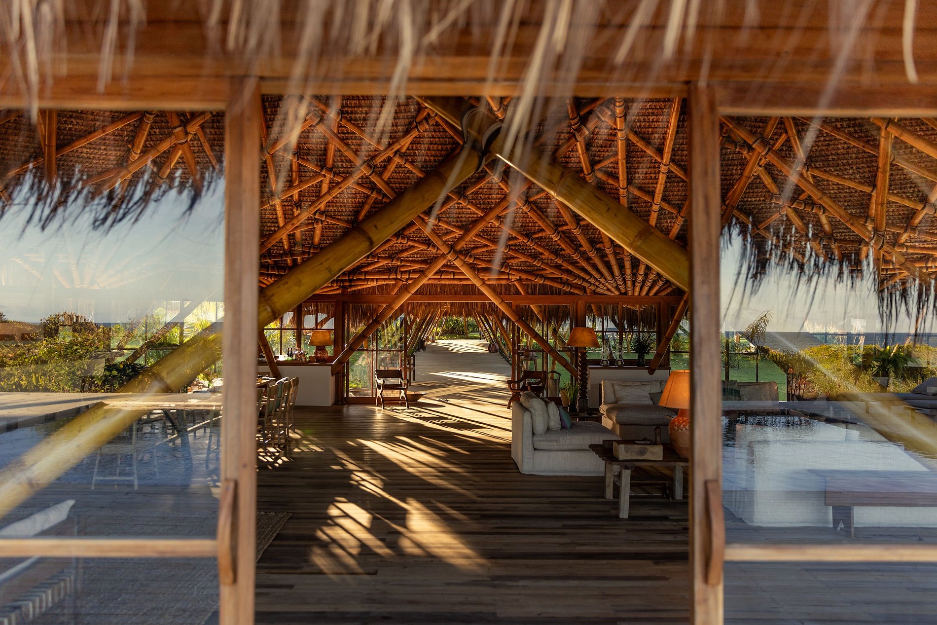 Le salon principal est un creux spectaculaire fait de bambou et de piassava, avec un design ouvert qui se jette sans effort sur une vaste terrasse en bois, où une piscine à débordement offre une vue imprenable sur l'océan.