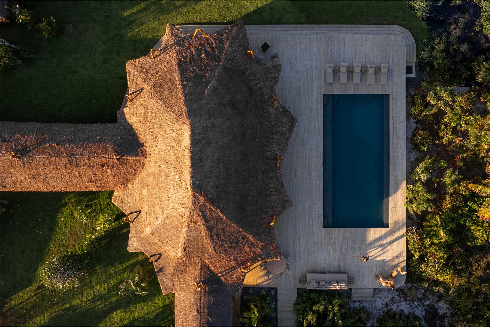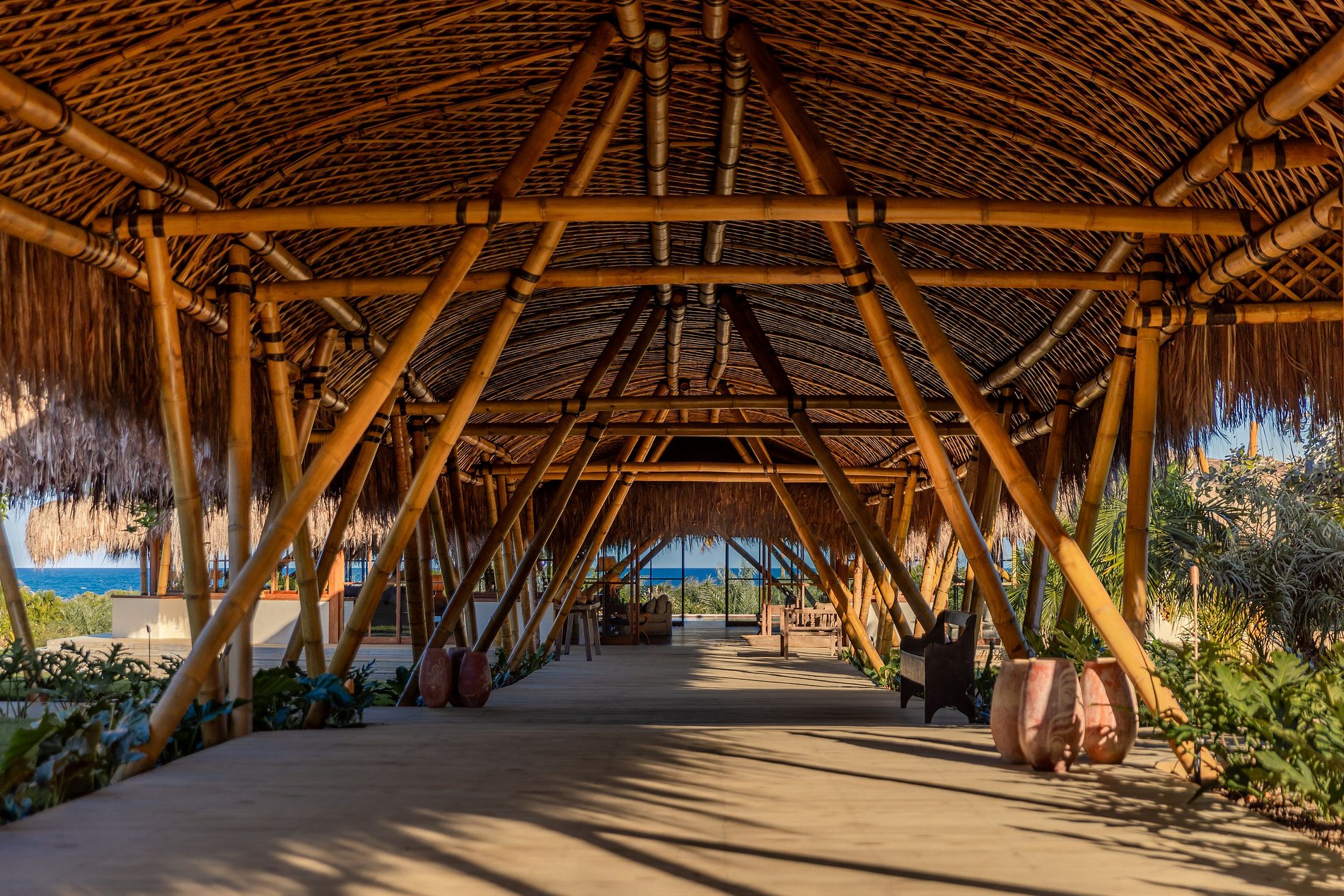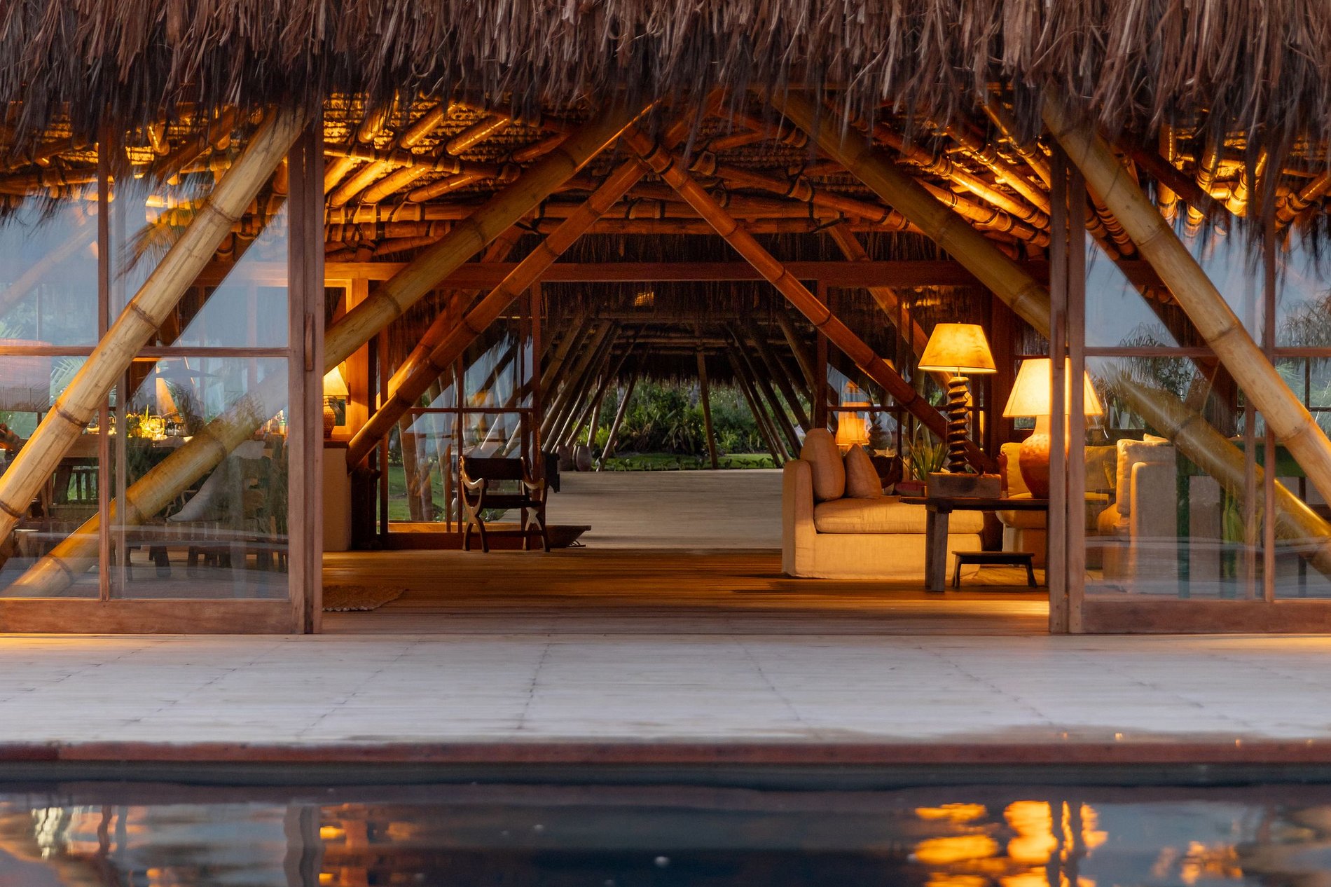 Le salon principal est un creux spectaculaire fait de bambou et de piassava, avec un design ouvert qui se jette sans effort sur une vaste terrasse en bois, où une piscine à débordement offre une vue imprenable sur l'océan.