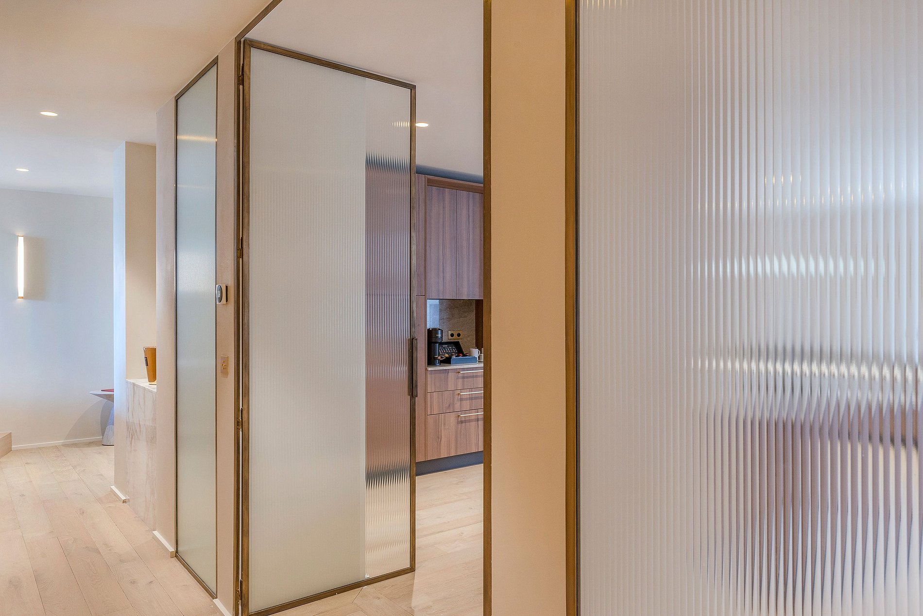 L'intérieur incarne une philosophie de design minimaliste mais élégant, où les lignes épurées et les espaces sereins s'harmonisent avec des matériaux raffinés comme le parquet en chêne poli et les surfaces en marbre lisse.