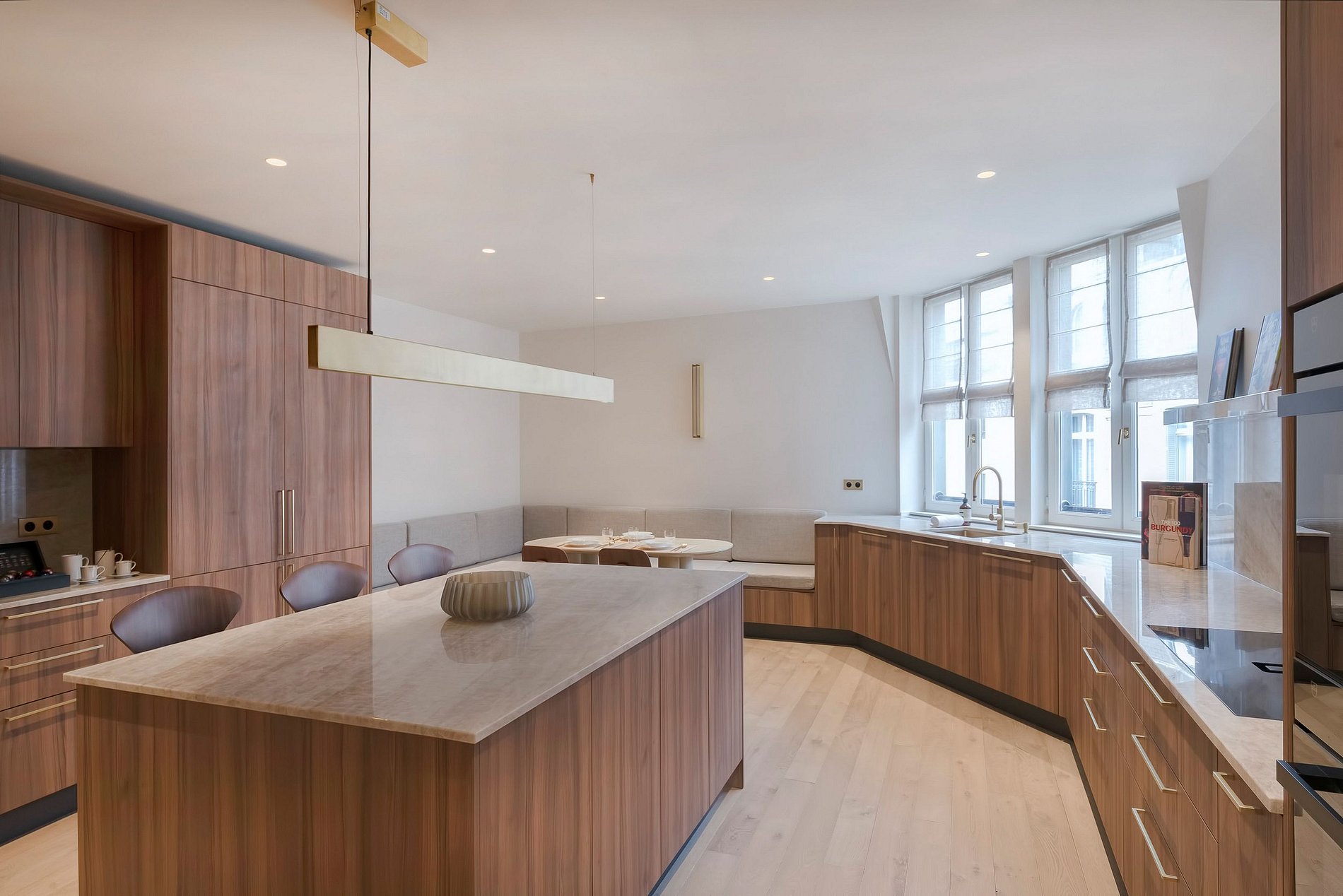 Ici, l'esthétique minimaliste brille à travers des meubles sur mesure, des appareils intégrés et des plans de travail en terrazzo expansifs, parfaits pour des rassemblements intimes ou pour recevoir avec style. De vastes fenêtres du sol au plafond partout invitent la lumière dorée de Paris à l'intérieur, offrant des vues infinies sur les toits de la ville.