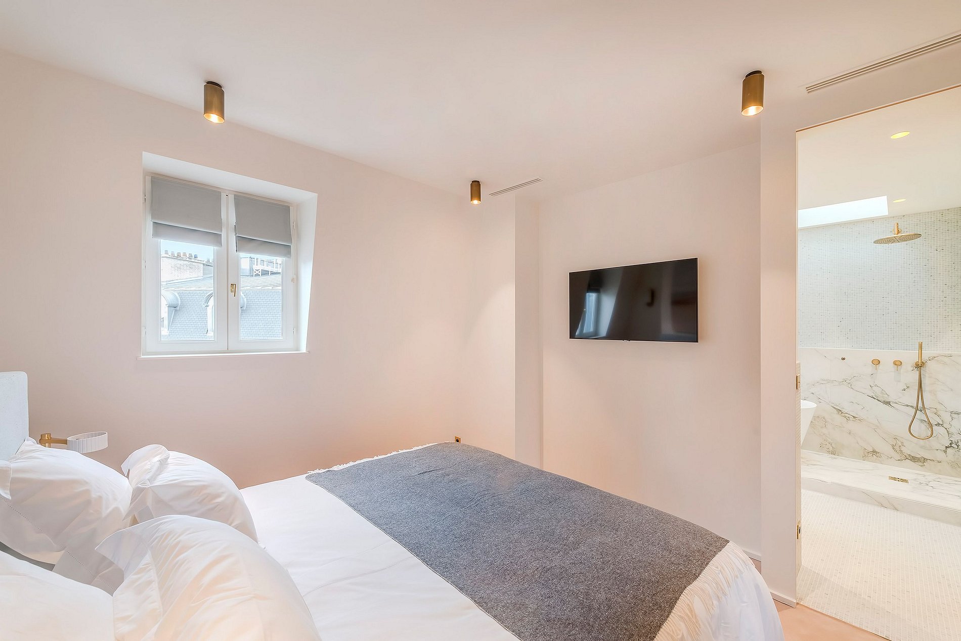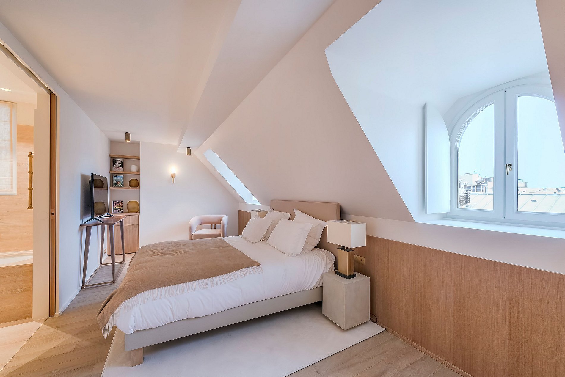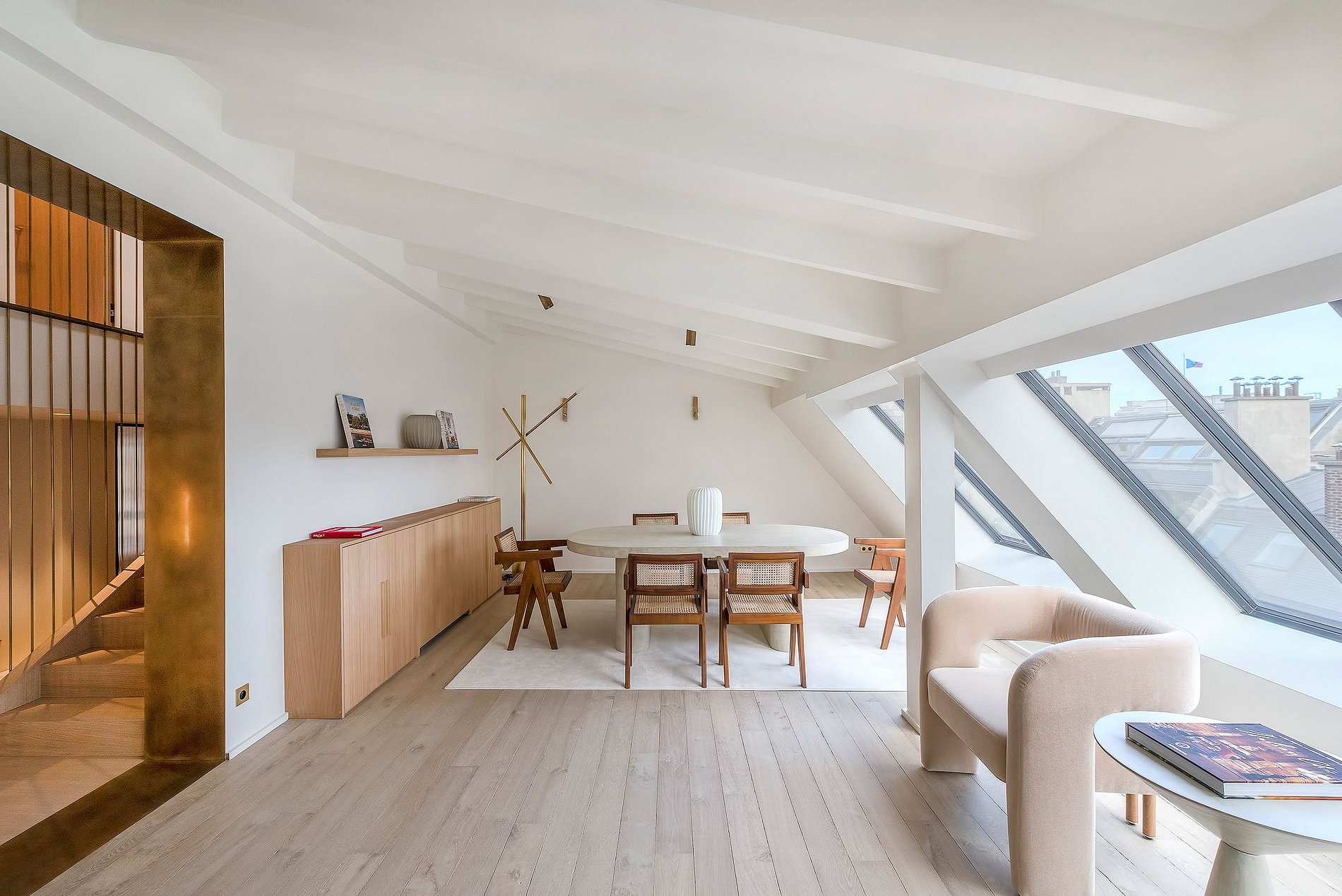 Ici, l'esthétique minimaliste brille à travers des meubles sur mesure, des appareils intégrés et des plans de travail en terrazzo expansifs, parfaits pour des rassemblements intimes ou pour recevoir avec style. De vastes fenêtres du sol au plafond partout invitent la lumière dorée de Paris à l'intérieur, offrant des vues infinies sur les toits de la ville.