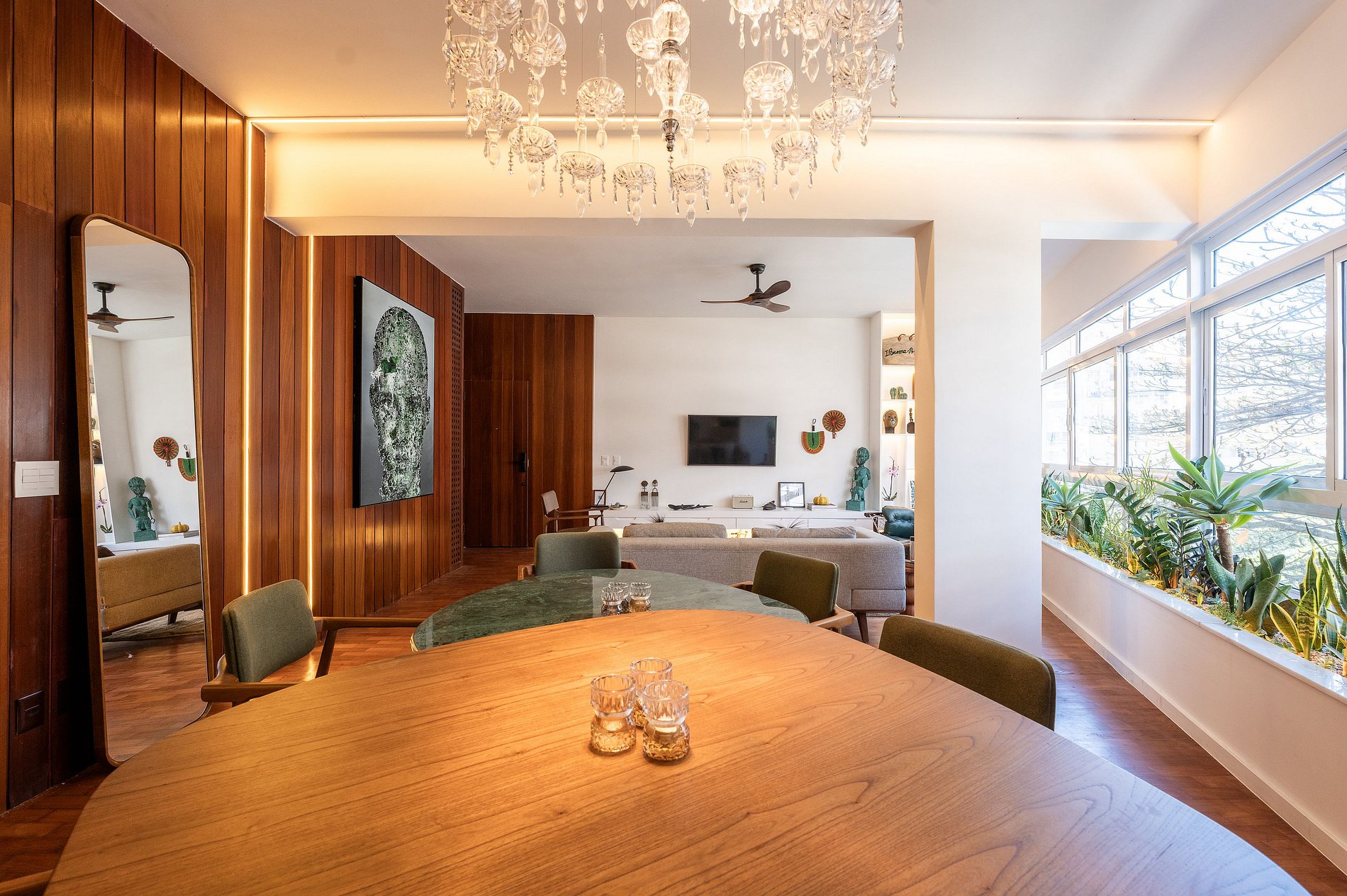 Le choix raffiné des couleurs et des matériaux crée une atmosphère unique, un équilibre harmonieux entre confort contemporain et esprit tropical brésilien.