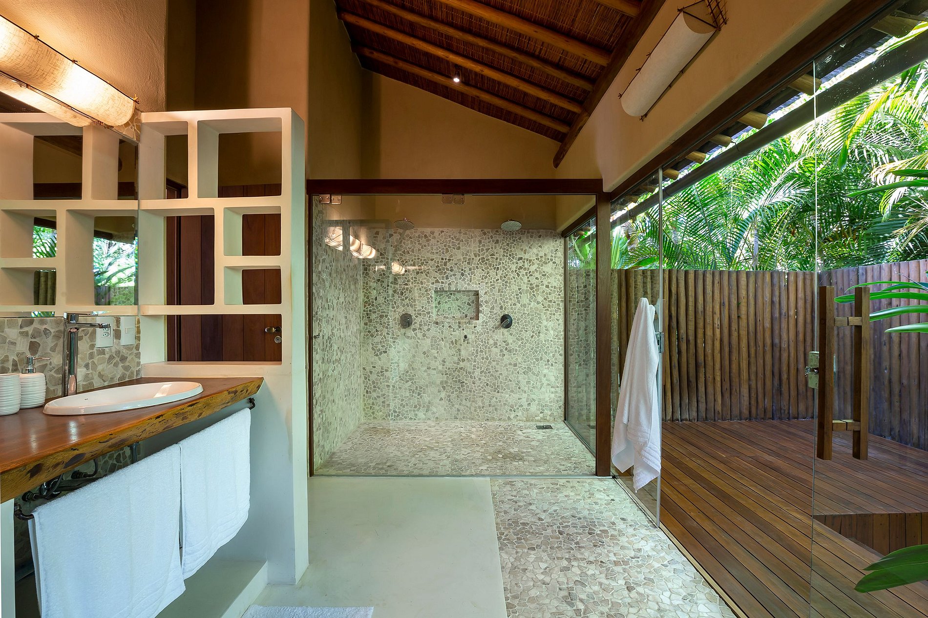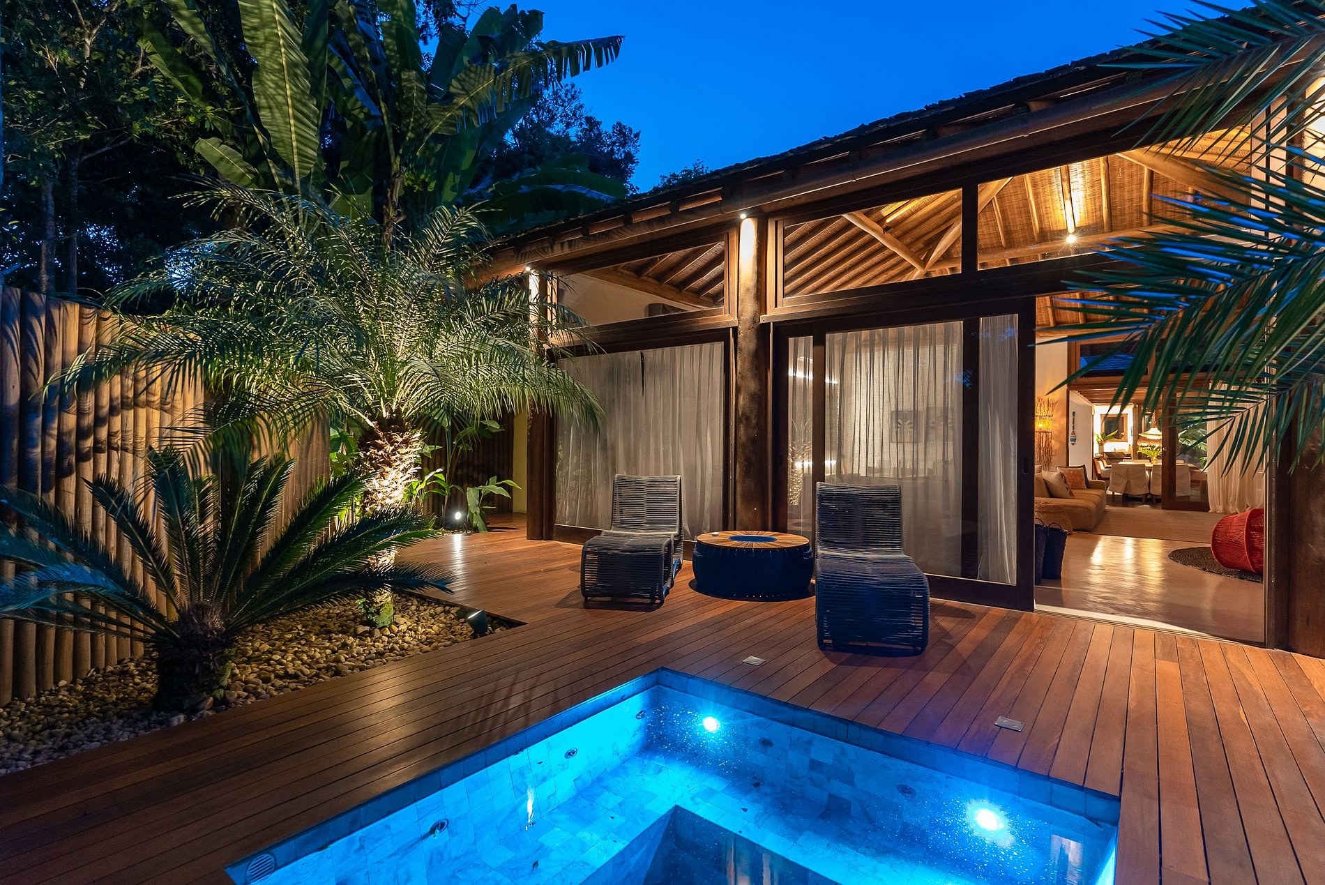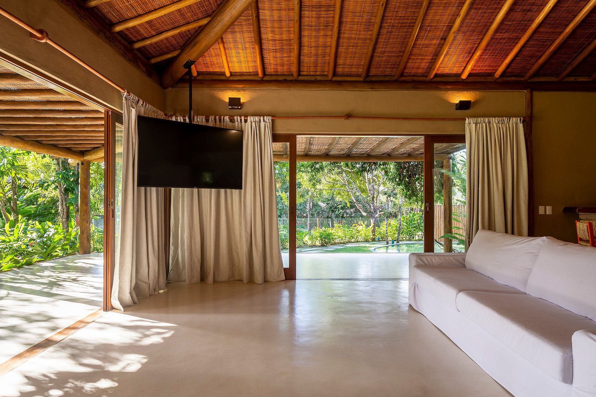 Chaque bungalow offre un lit queen size, un minibar, une télévision connectée de 50 pouces, une climatisation split, une salle de bain privée et de charmantes vues sur le jardin avec piscine. Le Bungalow principal se distingue par un lit king size, une mini cuisine, un comptoir et un salon spacieux et confortable, idéal pour une expérience encore plus exclusive.
