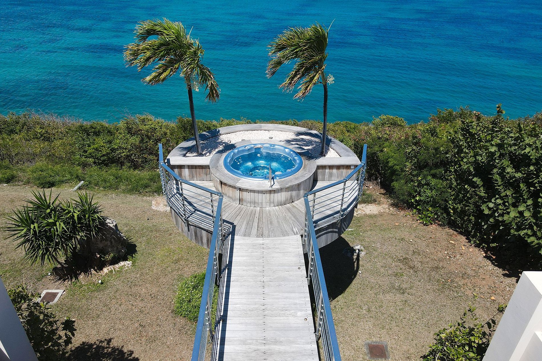 La résidence se répartit en trois bâtiments distincts. La villa principale comprend un grand hall de réception, un salon spacieux et des salles à manger qui s’ouvrent sur une cuisine gastronomique, le tout encadré de larges baies vitrées laissant entrer la lumière et la brise marine. Une piscine à débordement et un jacuzzi se prolongent jusqu’au bord de la falaise, offrant un décor spectaculaire de ciel et d’eau. Sept chambres s’y trouvent, chacune avec salle de bains attenante incluant douches intérieure et extérieure, tandis que la suite principale bénéficie d’une terrasse privée.
