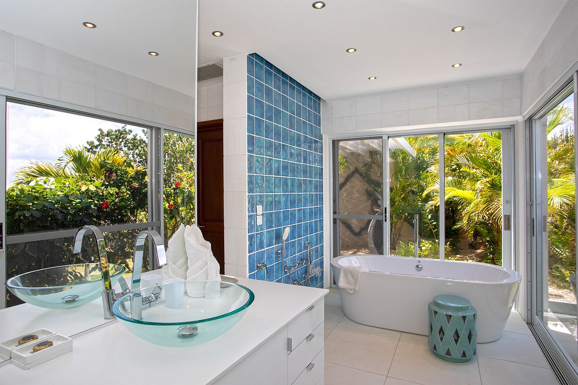 La deuxième villa ajoute trois suites supplémentaires avec de lumineux espaces de vie et sa propre piscine en gradins, tandis que la troisième abrite trois autres suites avec lits king-size et salles de bains privées. Au total, le domaine propose treize chambres et quatorze salles de bains, la plupart avec douche extérieure, assurant confort et intimité aux grands groupes.