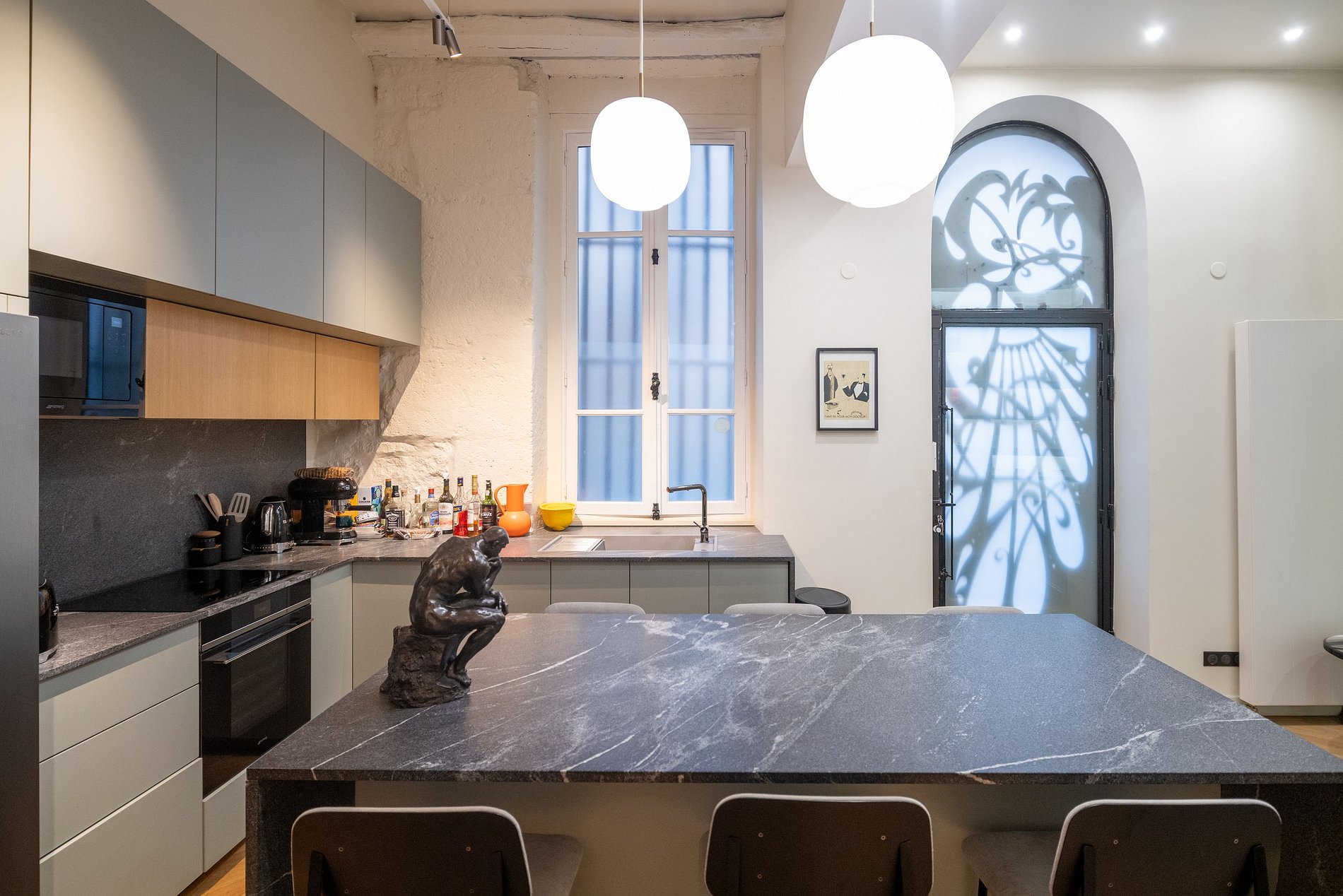 Le rez-de-chaussée présente une fusion délicieuse de styles rustique et moderne. Les murs en pierre originale rendent hommage à la riche histoire de Paris, tandis que les meubles modernes et chics ajoutent une touche de sophistication. Cet espace accueillant, équipé d'une cuisine de pointe, est parfait pour se divertir et se détendre.