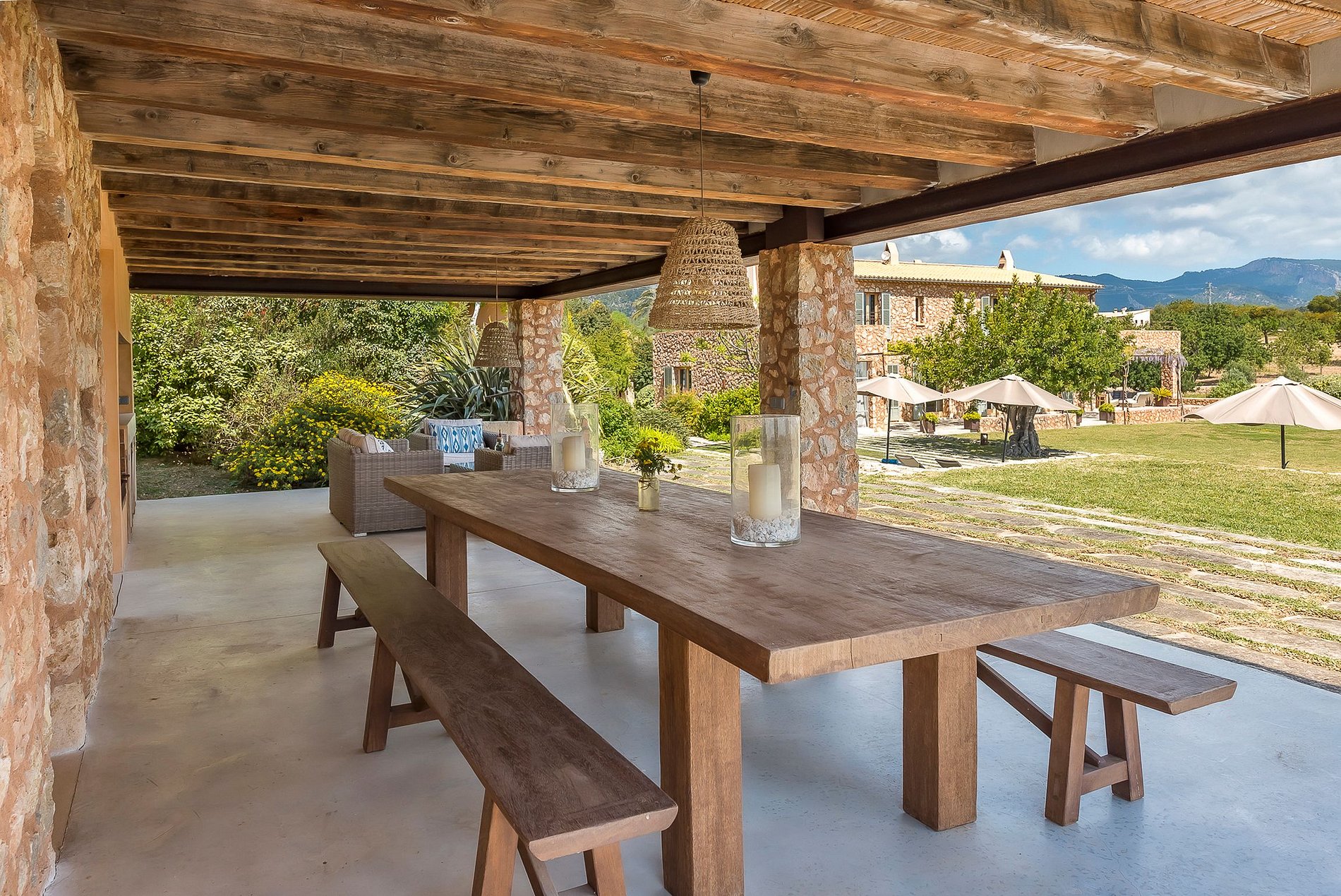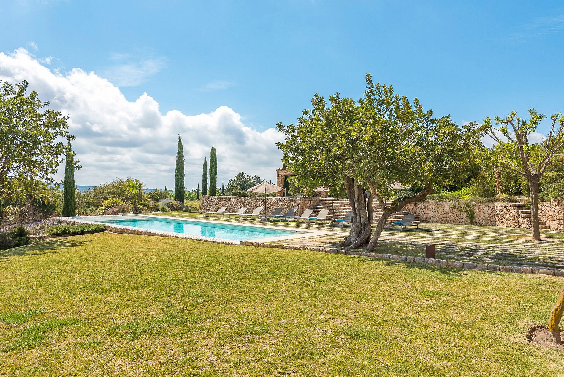 Cette authentique propriété en pierre naturelle est implantée sur un terrain d'environ 4 hectares et est entouré d'un jardin méditerranéen et de plusieurs vignes avec vue sur le magnifique paysage.