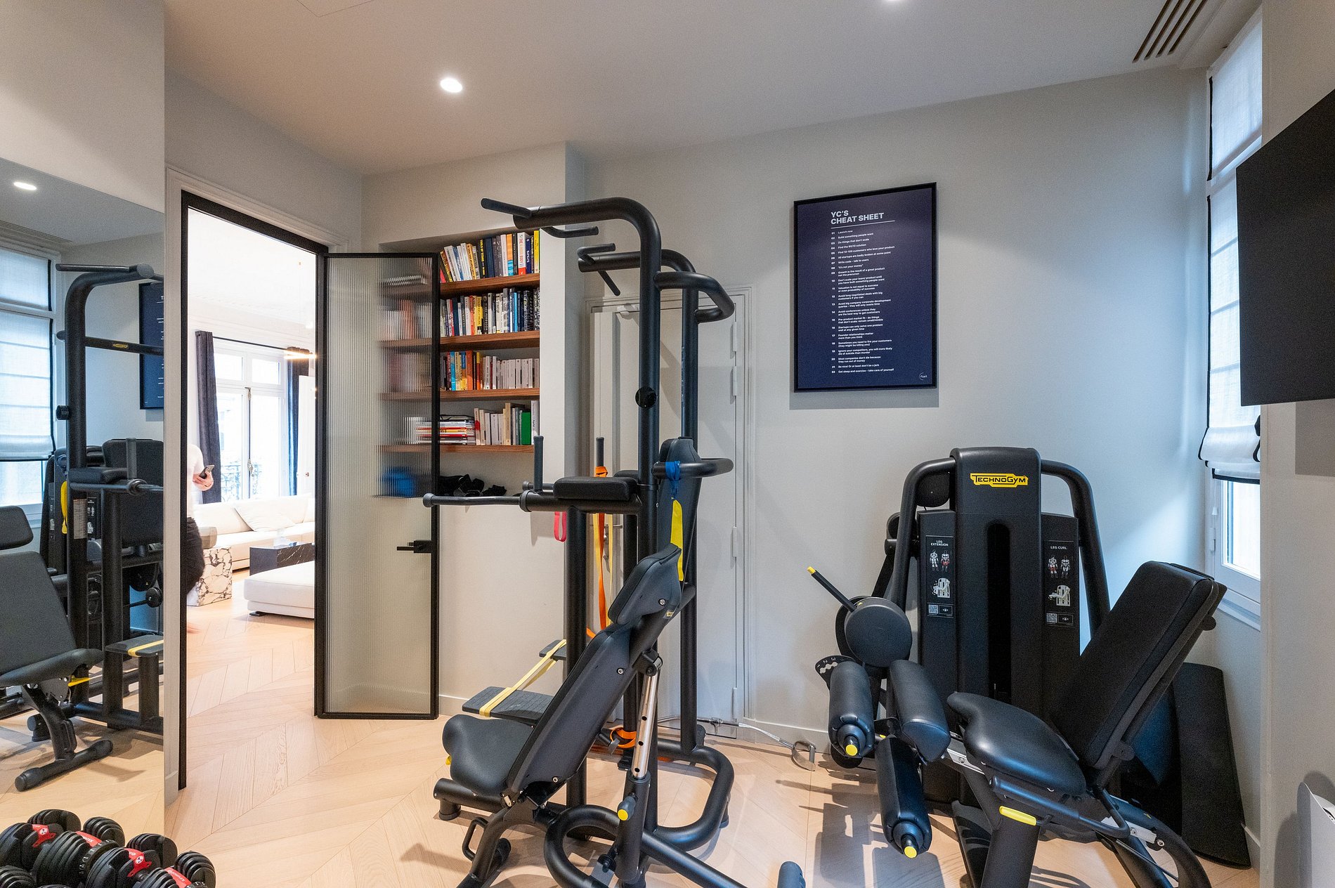 Pour ceux dédiés au fitness, l'appartement comprend une salle de sport équipée de machines Technogym, répondant aux besoins des véritables amateurs de sport. Cet espace de fitness privé permet aux résidents de maintenir leur routine d'entraînement dans le confort de leur propre maison.