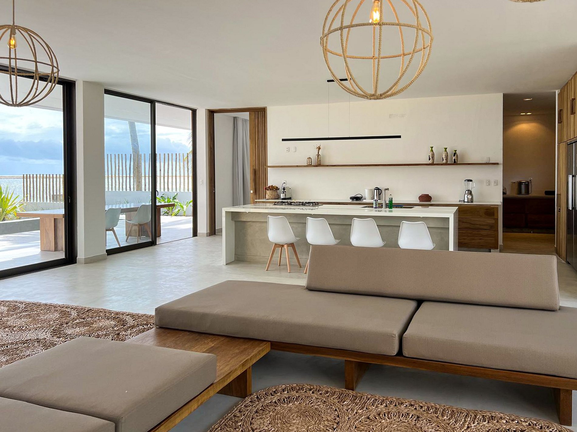 L’architecture moderne, aux lignes épurées, s’intègre parfaitement à l’environnement tropical. Chaque pièce de la maison est dotée de grandes baies vitrées, inondant les espaces de lumière naturelle et offrant une vue imprenable sur la mer, l’ile ou le jardin luxuriant. L’intérieur et l’extérieur se fondent en parfaite harmonie, créant une atmosphère élégante, chaleureuse et détendue.