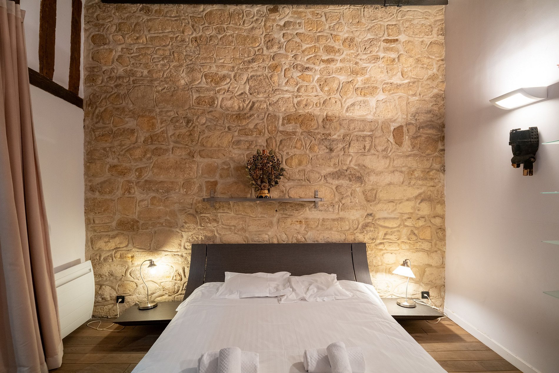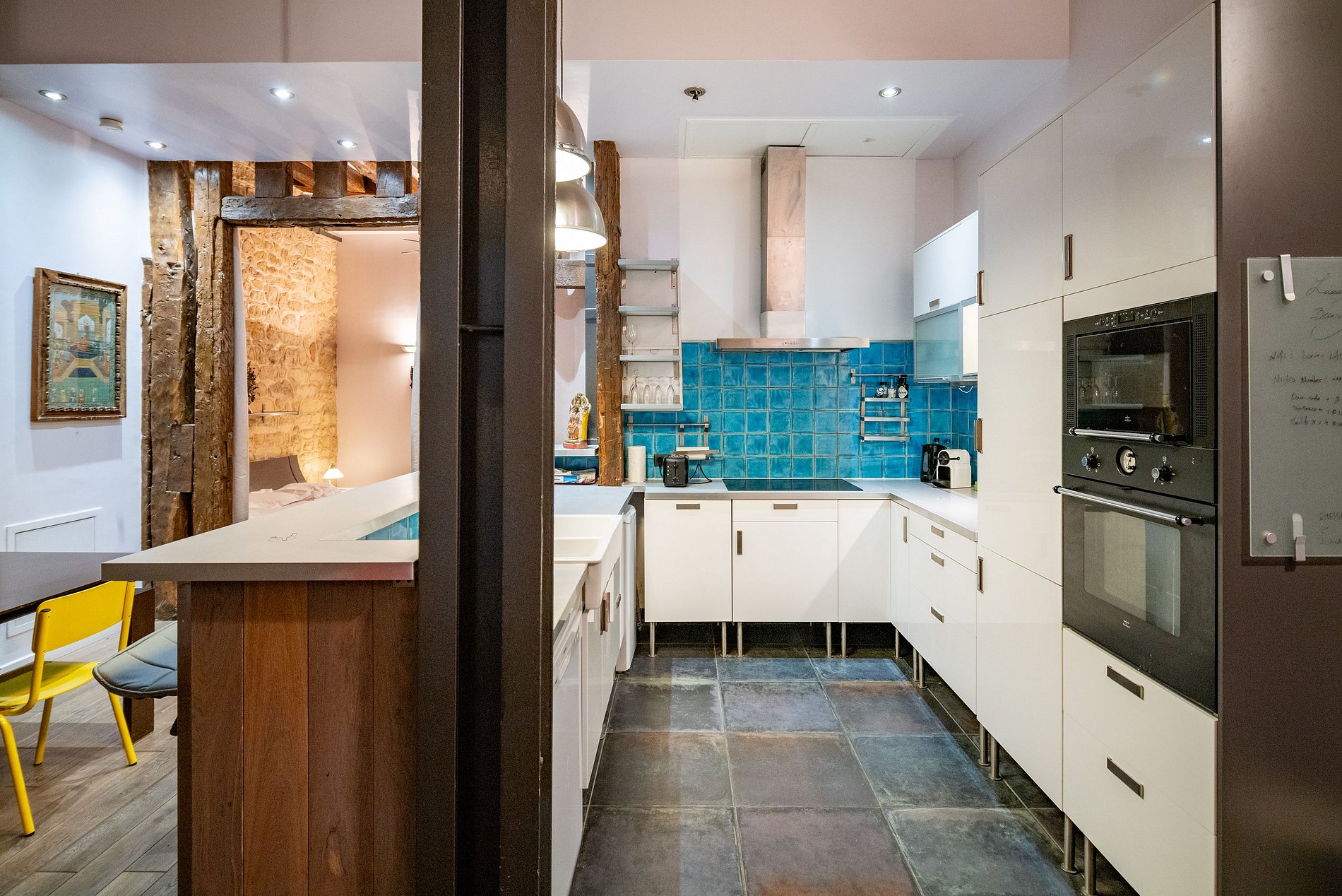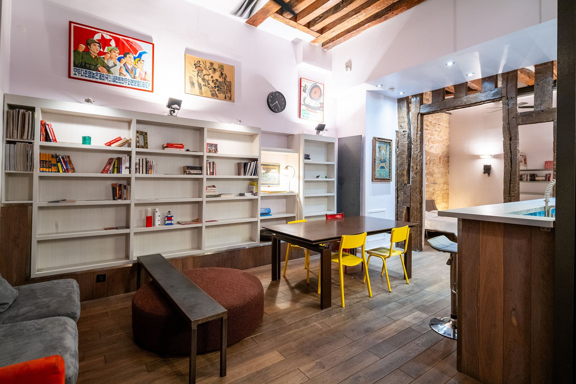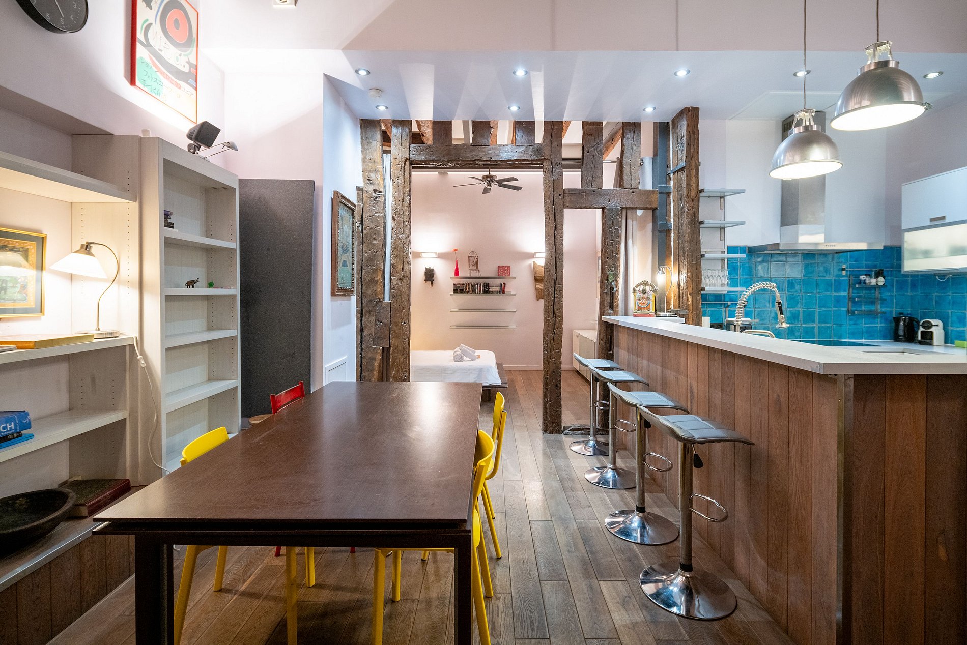 En entrant dans le loft, vous accédez à un élégant espace de vie, orné d'un grand canapé et d'une table à manger, parfaitement positionnée face à la cuisine ouverte entièrement équipée. Cette disposition crée un espace invitant et fonctionnel pour la détente et le divertissement. À droite de l'entrée, il y a un grand espace de couchage, comprenant un lit queen-size confortable. Cette zone est conçue pour offrir un refuge paisible et privé dans le cadre urbain animé. À gauche, quelques marches mènent à un deuxième espace de couchage, offrant un hébergement supplémentaire. Cette zone surélevée ajoute un élément de séparation et d'intimité, rendant le loft idéal pour accueillir des invités ou pour une petite famille. Adjacent à ce deuxième espace de couchage se trouve la salle de bain du loft, conçue avec des installations modernes, garantissant confort et commodité. L'une des caractéristiques les plus captivantes de ce loft est l'accès à la terrasse. Cet espace extérieur sert de véritable havre de paix au cœur de Paris, offrant un endroit serein pour se détendre ou recevoir, loin de l'agitation des rues de la ville. La terrasse est un luxe rare dans un emplacement aussi central, offrant une occasion exclusive de profiter de la vie en plein air dans l'une des villes les plus renommées au monde. Dans l'ensemble, ce loft combine commodités modernes, design réfléchi et emplacement privilégié, le rendant une demeure urbaine idéale pour ceux qui cherchent à s'immerger dans le cœur vibrant de Paris.