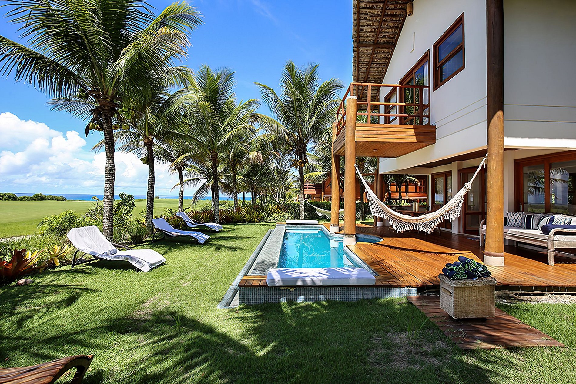 Villa dans une copropriété de haut standing. Vue spectaculaire sur le golf et vue mer. 04 suites confortables. Salon, salle de télévision. Cuisine équipée. Piscine avec vue mer. Chaises et omblelone sur la plage des tortues.