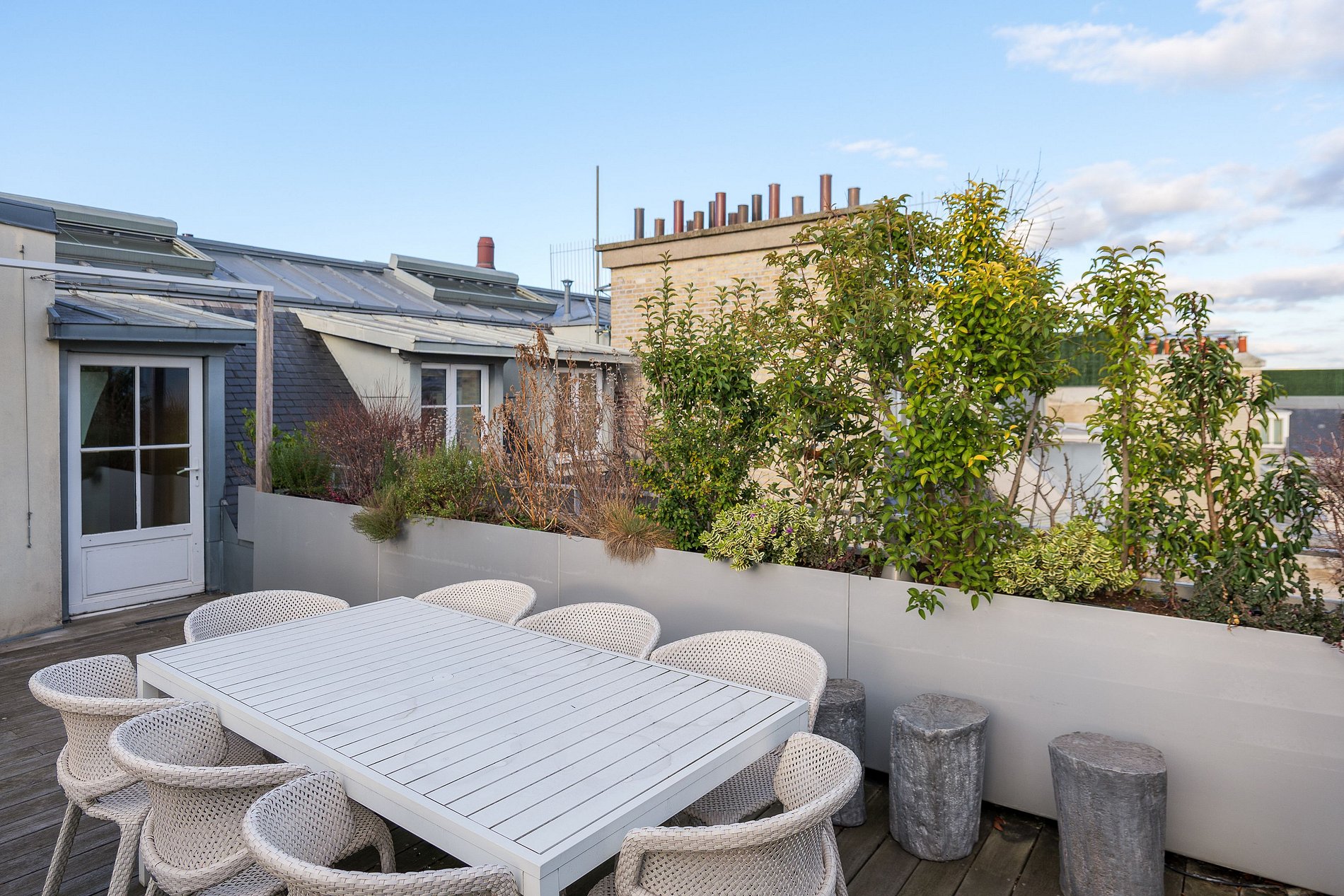 Le penthouse lui-même a été méticuleusement rénové par un décorateur d'intérieur renommé, offrant un espace de vie à couper le souffle qui mélange magistralement le luxe contemporain avec le charme classique. La vaste salle de séjour/réception, avec son plafond haut, s'écoule gracieusement sur une terrasse paysagère de 36 m², offrant une vue enchantée sur Paris. La salle à manger respire la sophistication, parfaite pour accueillir des soirées élégantes, tandis que la cuisine très spacieuse avec des installations pour manger est un rêve pour tout passionné de cuisine.