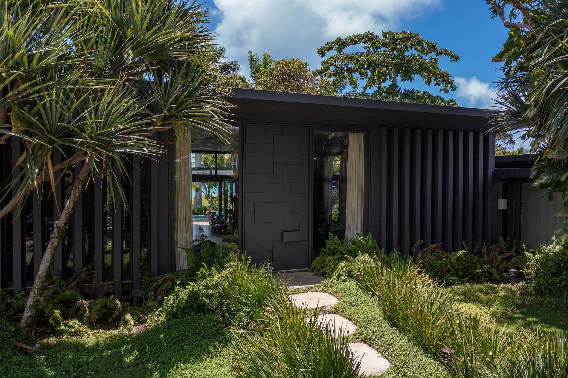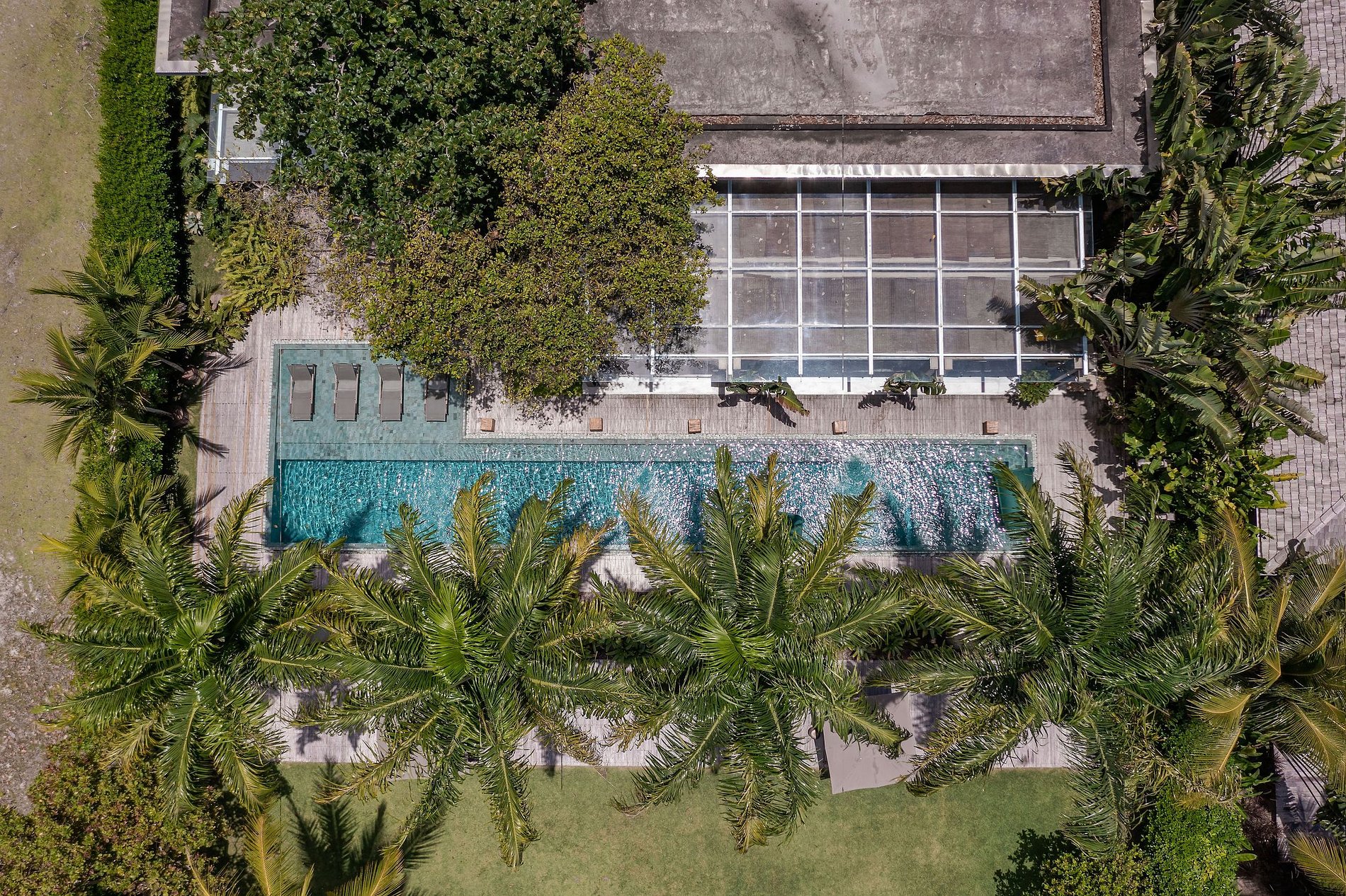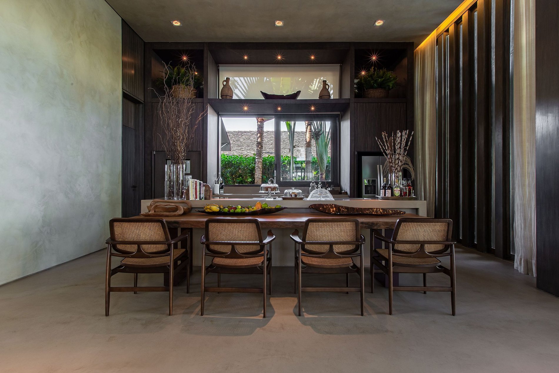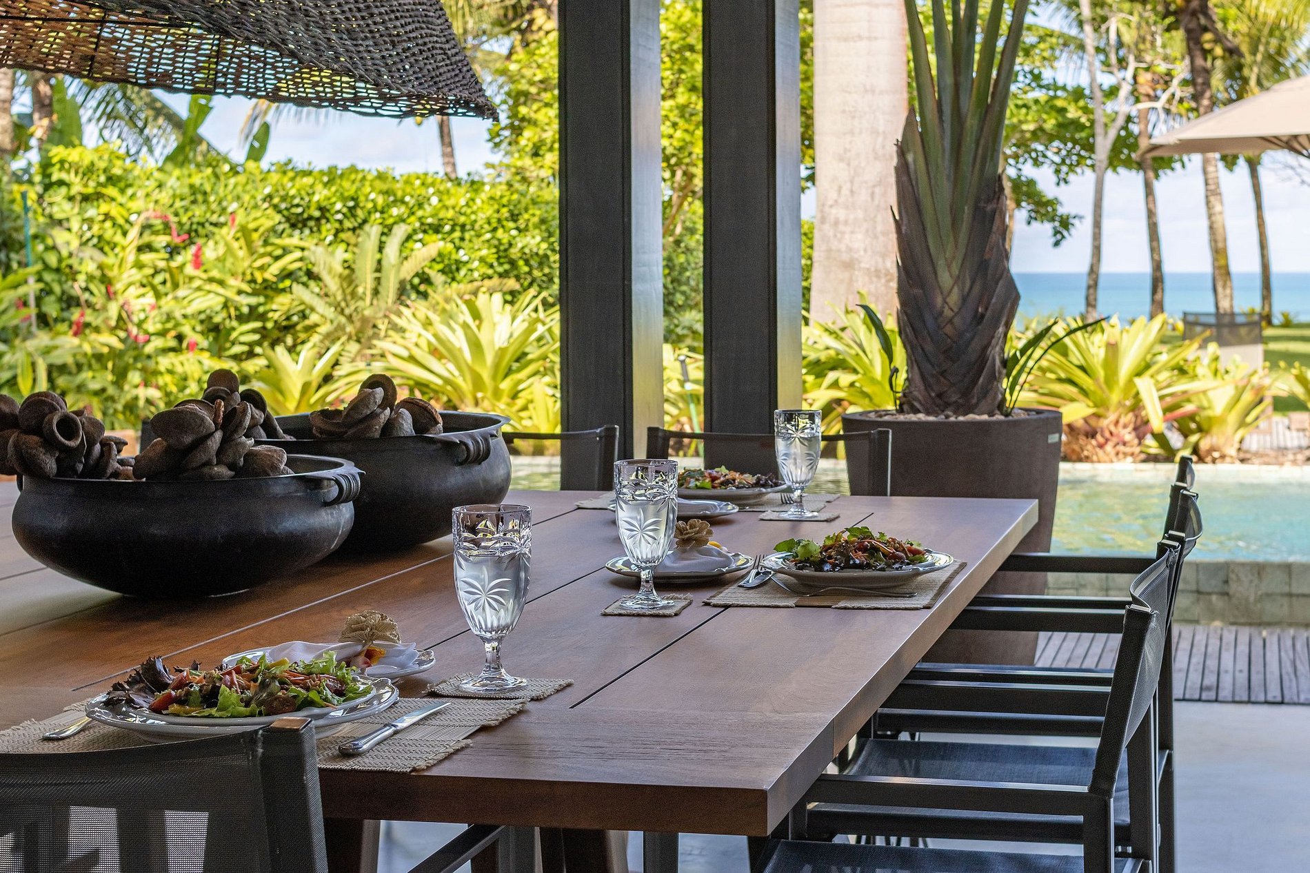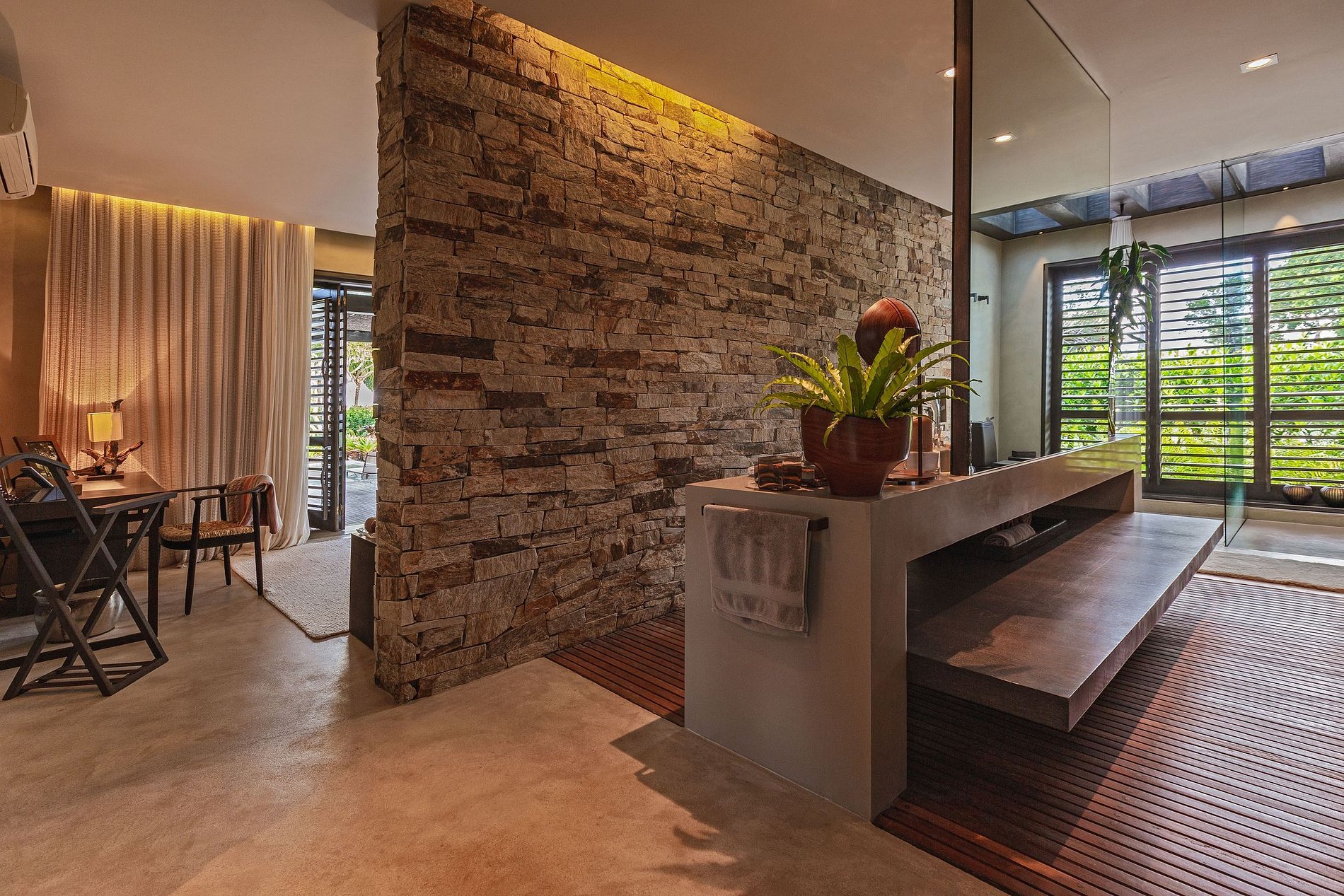 La villa se compose de 2 blocs. Le premier est le salon, la salle d'eau, la salle à manger , la cuisine de service et la cuisine gastronomique. Cet environnement a une hauteur sous plafond de 5 mètres. Il surplombe la piscine et offre une vue sur la mer. Le deuxième bloc comprend les suites et la buanderie. Ce bloc a une vue latérale qui fait face à la zone préservée de la copropriété, offrant aux clients une intimité totale.