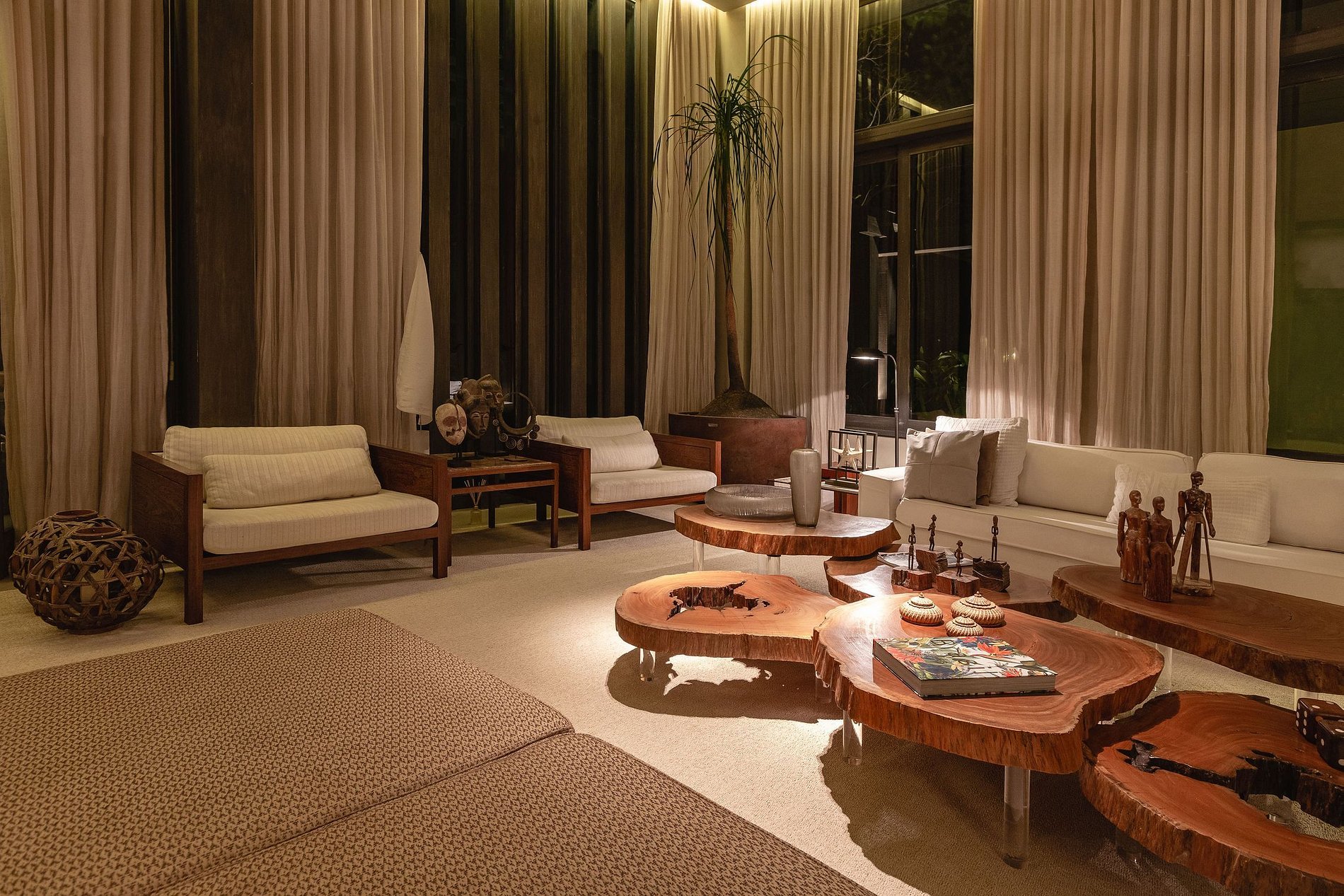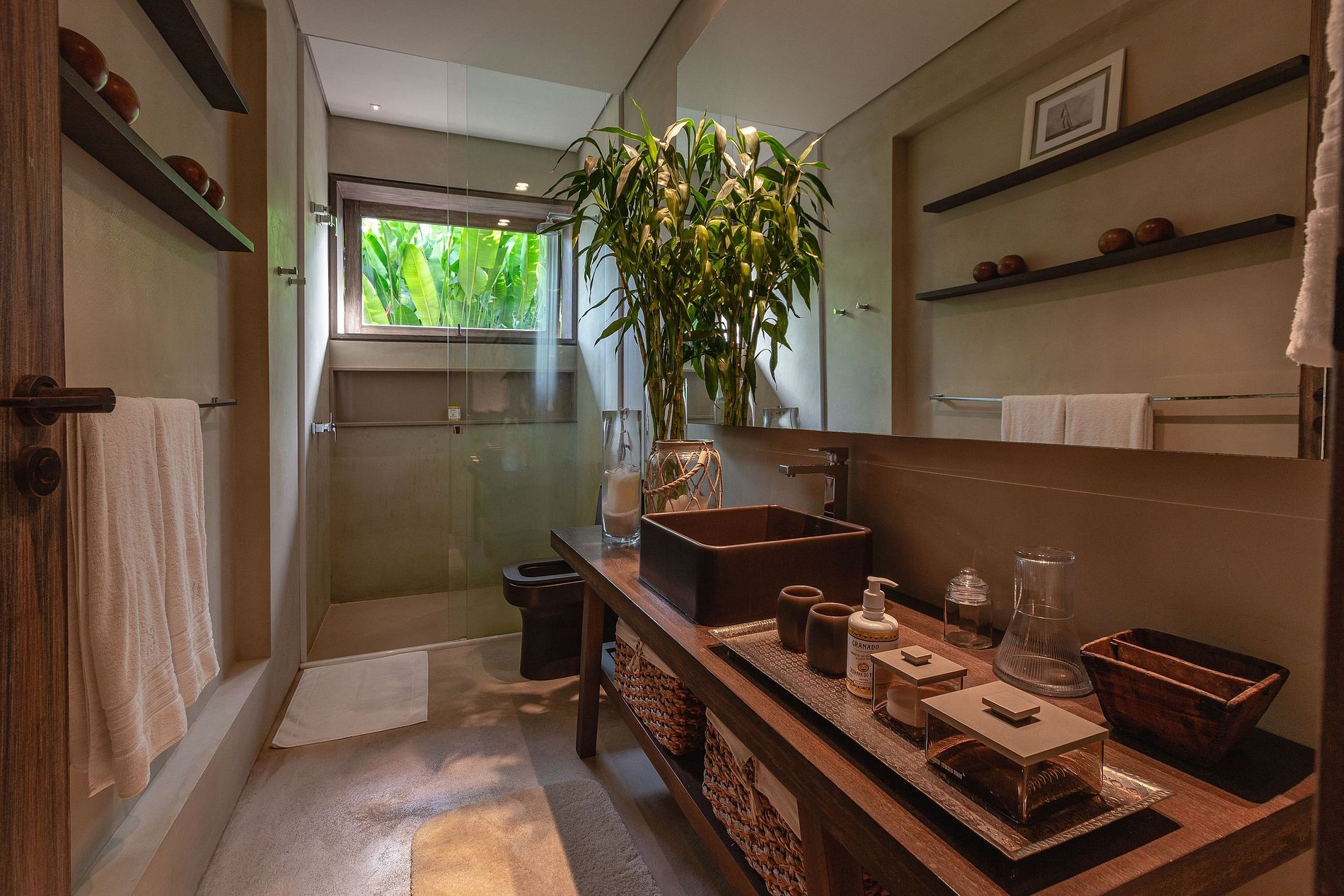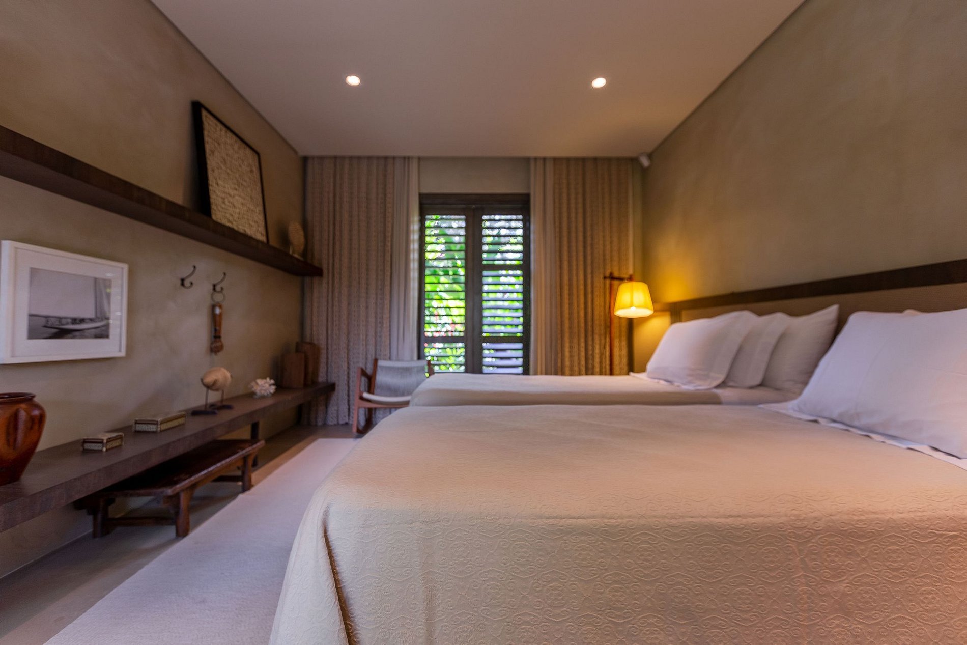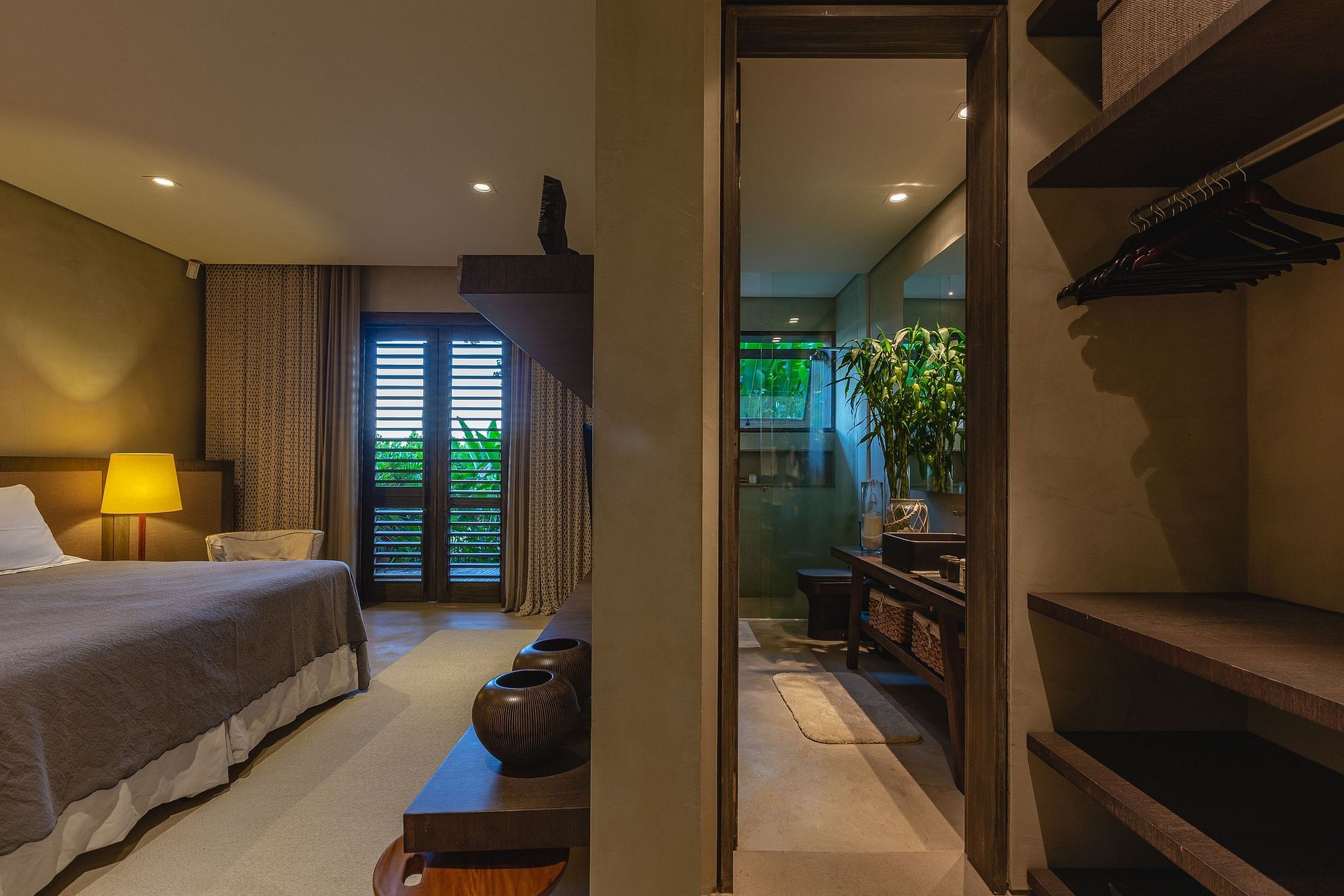Dans la partie nuit, se trouvent les 5 suites qui offrent un confort à tous les invités. Elle est composée de : 1 suite parentale et 4 suites invités, toutes climatisées et équipées de layettes haut de gamme. Le différentiel de la suite parentale se trouve dans son deck avec 2 canapés simples, accès direct à la piscine, lit king size et son immense salle de bain. Les autres suites disposent de lits simples qui, ensemble, deviennent un lit double.