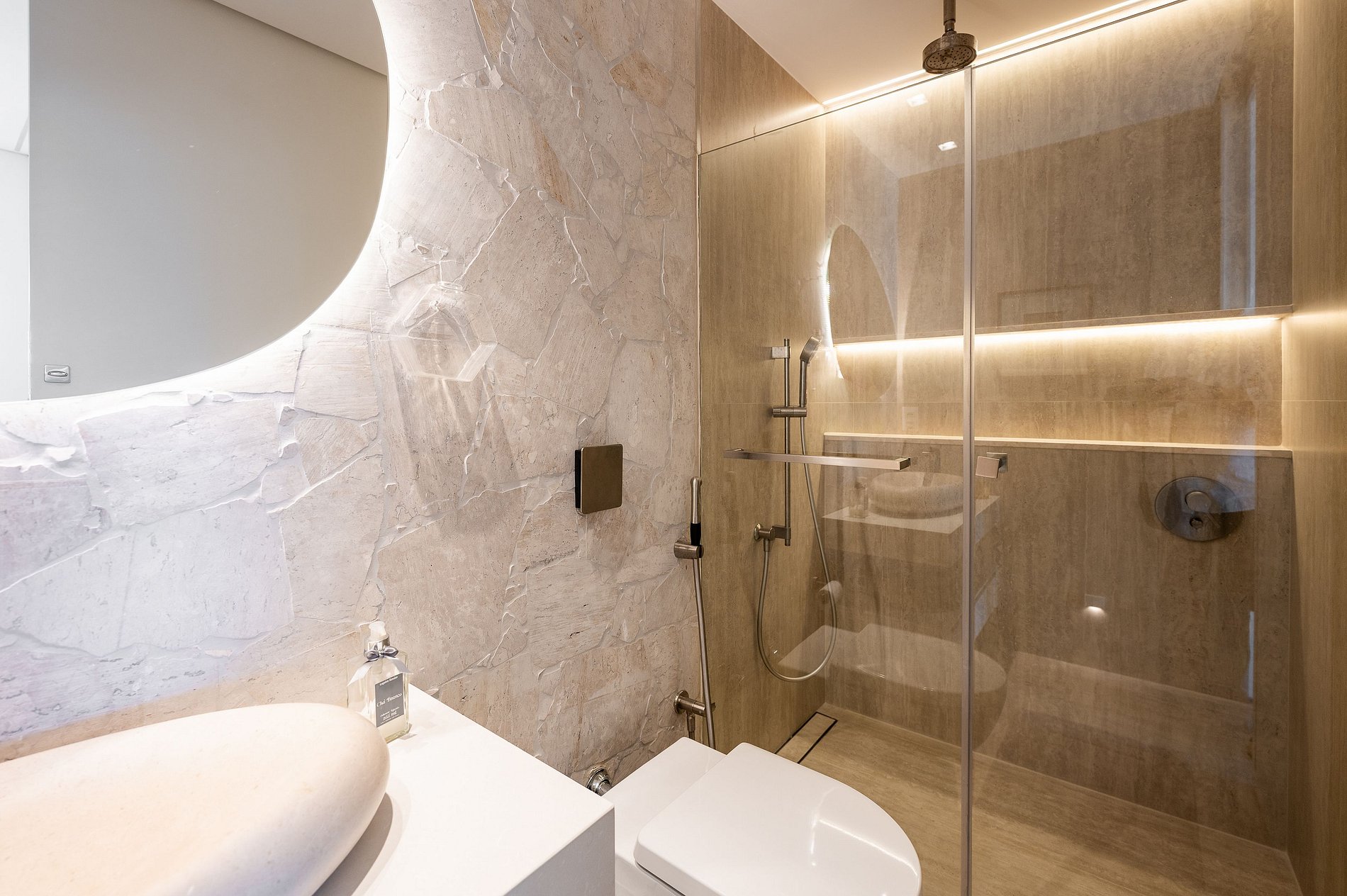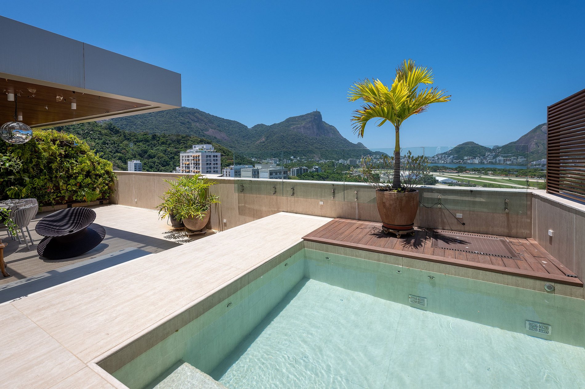 Au cœur de cette expérience, l’étage supérieur dévoile un espace extérieur absolument remarquable : une terrasse généreuse, pensée comme un véritable rooftop privé. Un jardin vertical luxuriant y compose une atmosphère tropicale et confidentielle, apportant fraîcheur, intimité et un décor vivant tout au long de la journée. La piscine chauffée, parfaitement intégrée à la terrasse, invite autant à une baignade matinale avec le soleil qui se lève sur la ville qu’à un moment de détente en fin de journée, lorsque les lumières de Rio commencent à scintiller. Une douche extérieure complète l’ensemble, idéale après la piscine ou un retour de plage.