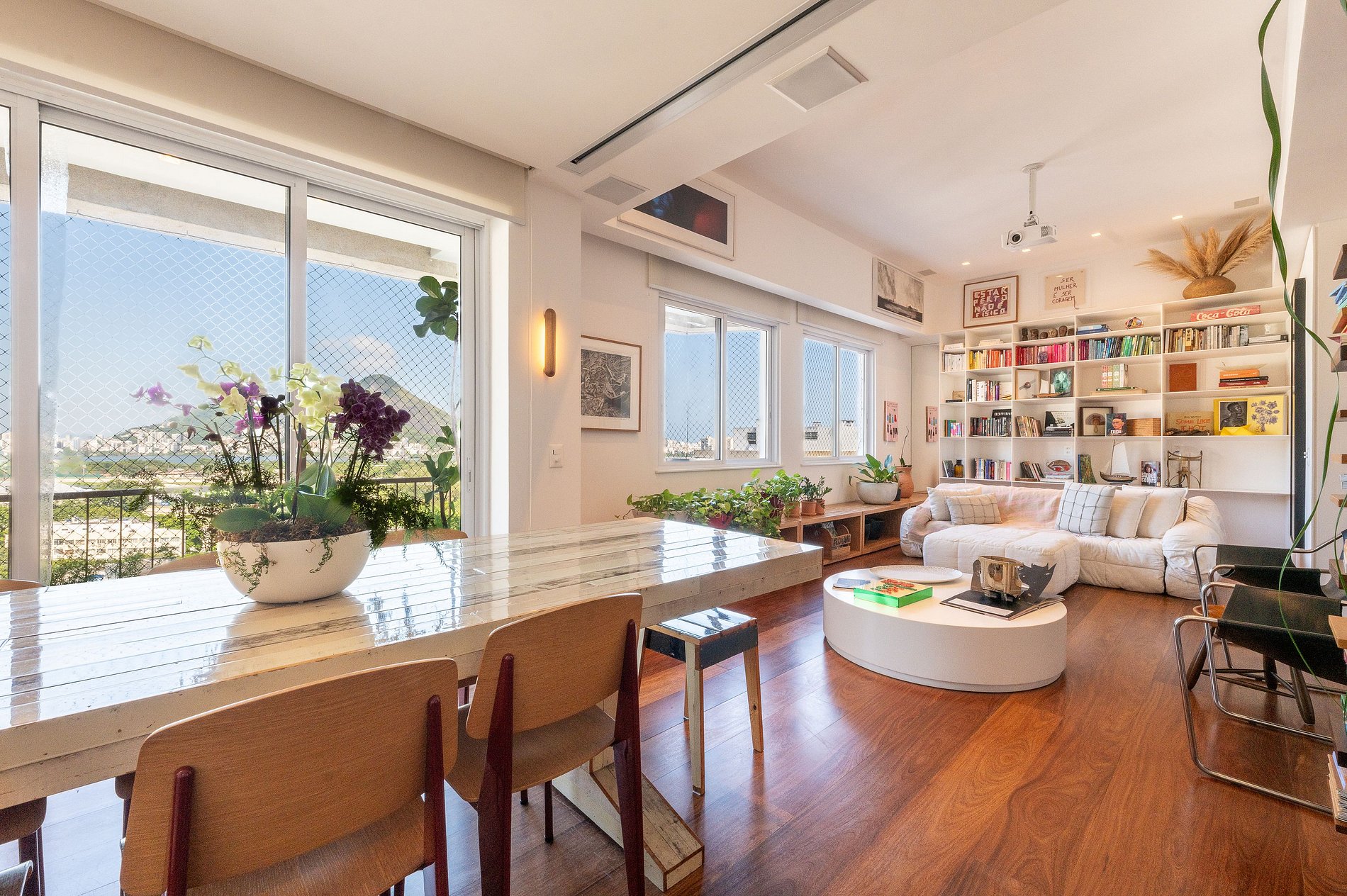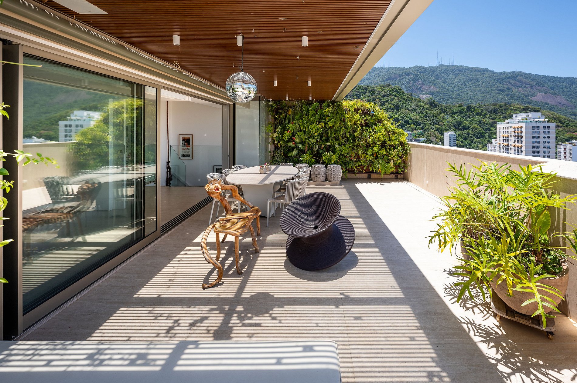 Dès l’entrée, la vue saisit : un panorama spectaculaire sur la ville, le Corcovado et son Christ Rédempteur, la forêt de Tijuca et la Lagoa. Ici, chaque pièce semble dialoguer avec le paysage.