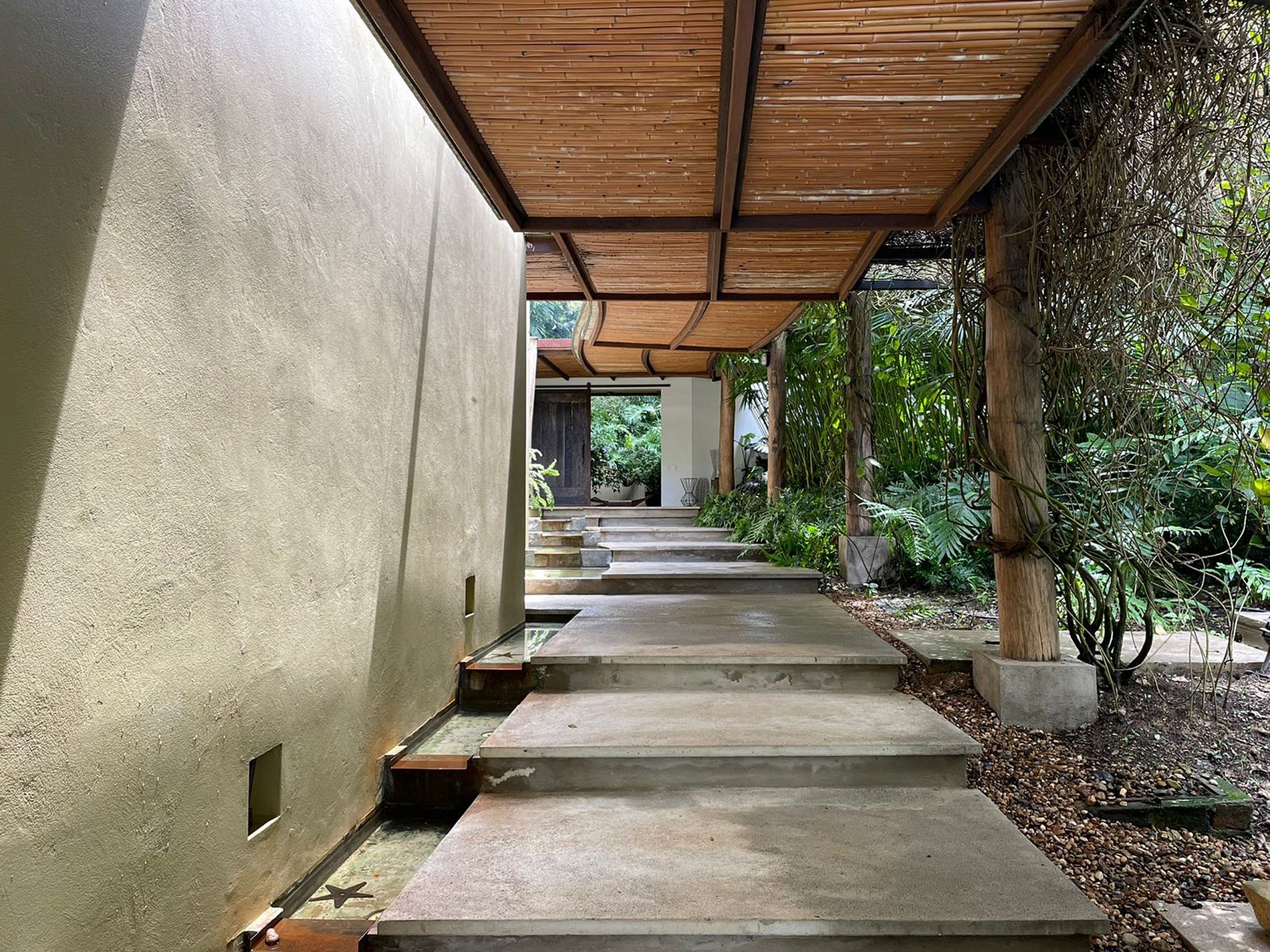 L'abondance de végétation entourant la maison crée une toile de fond sereine, favorisant une sensation de paix et d'intimité. Les espaces ouverts dans toute la propriété invitent à la connexion avec la nature, tandis que l'espace extérieur à côté de la piscine offre un cadre idéal pour la détente, avec des sièges, une salle à manger et des chaises longues.