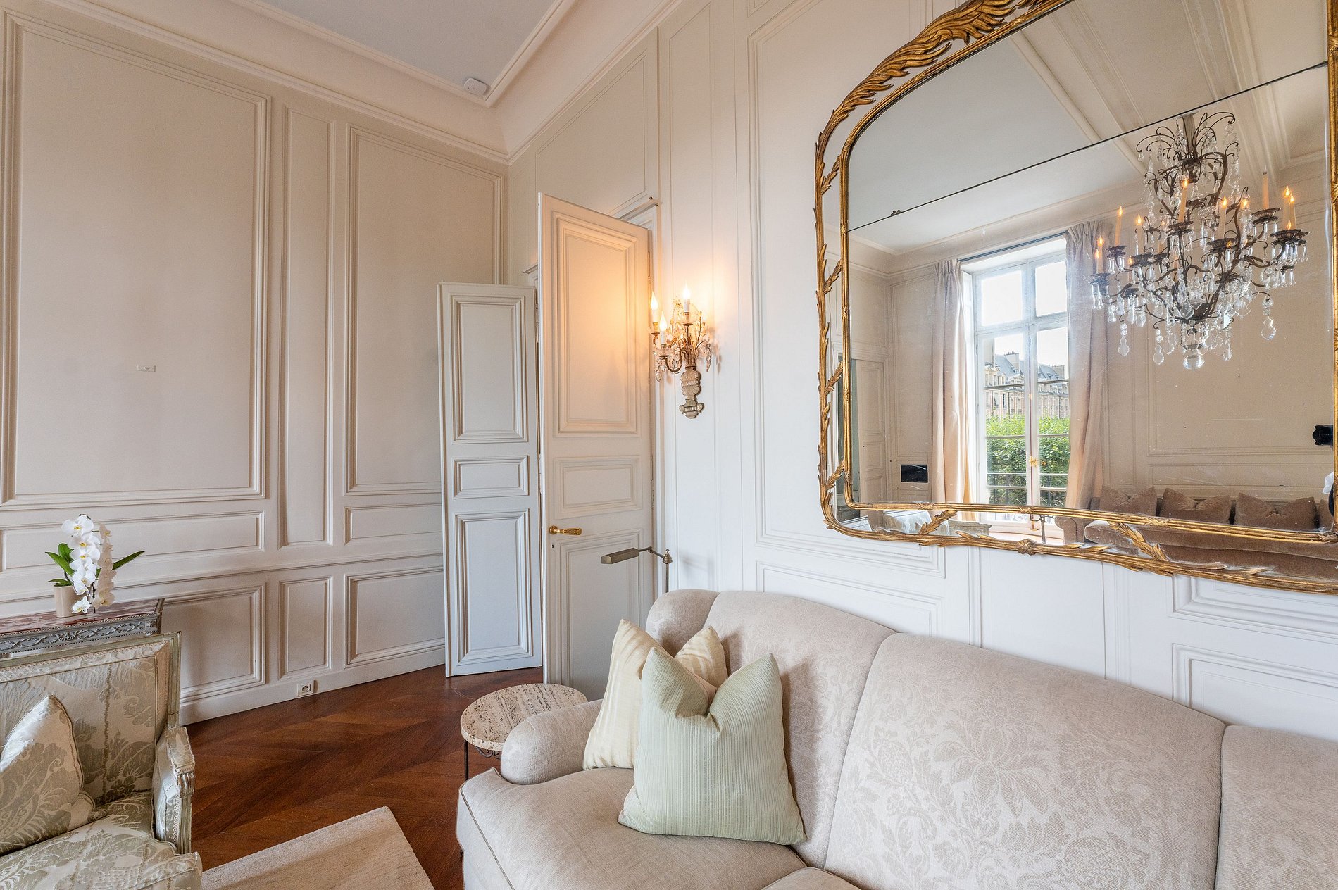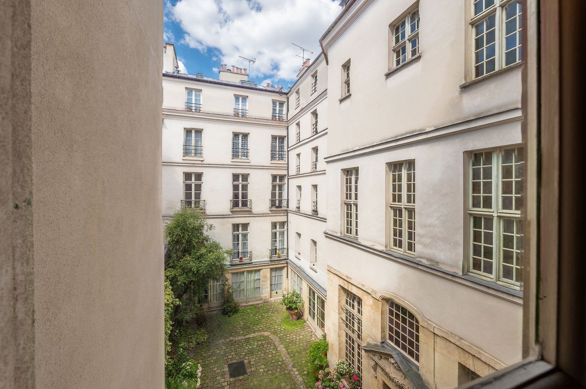 Les trois chambres, chacune dotée de sa propre salle de bains privative et climatisée, offrent intimité et bien-être à tous les occupants. Les vues imprenables sur les jardins parfaitement dessinés et les arcades de la Place des Vosges confèrent à ce lieu un cachet unique, véritable tableau vivant de la vie parisienne.
