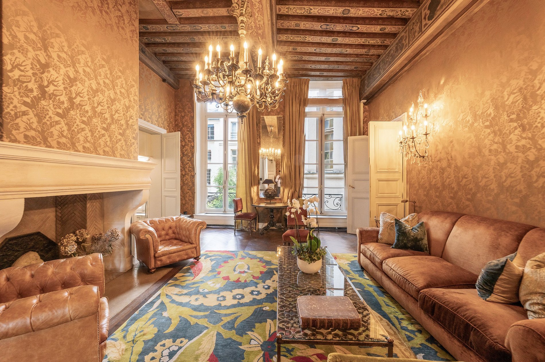 La décoration, d’inspiration classique française, rend hommage au passé avec un goût certain : moulures délicates, mobilier soigneusement sélectionné, textiles nobles et détails architecturaux subliment chaque pièce. L’ensemble reflète une esthétique raffinée, respectueuse de l’histoire et du patrimoine.