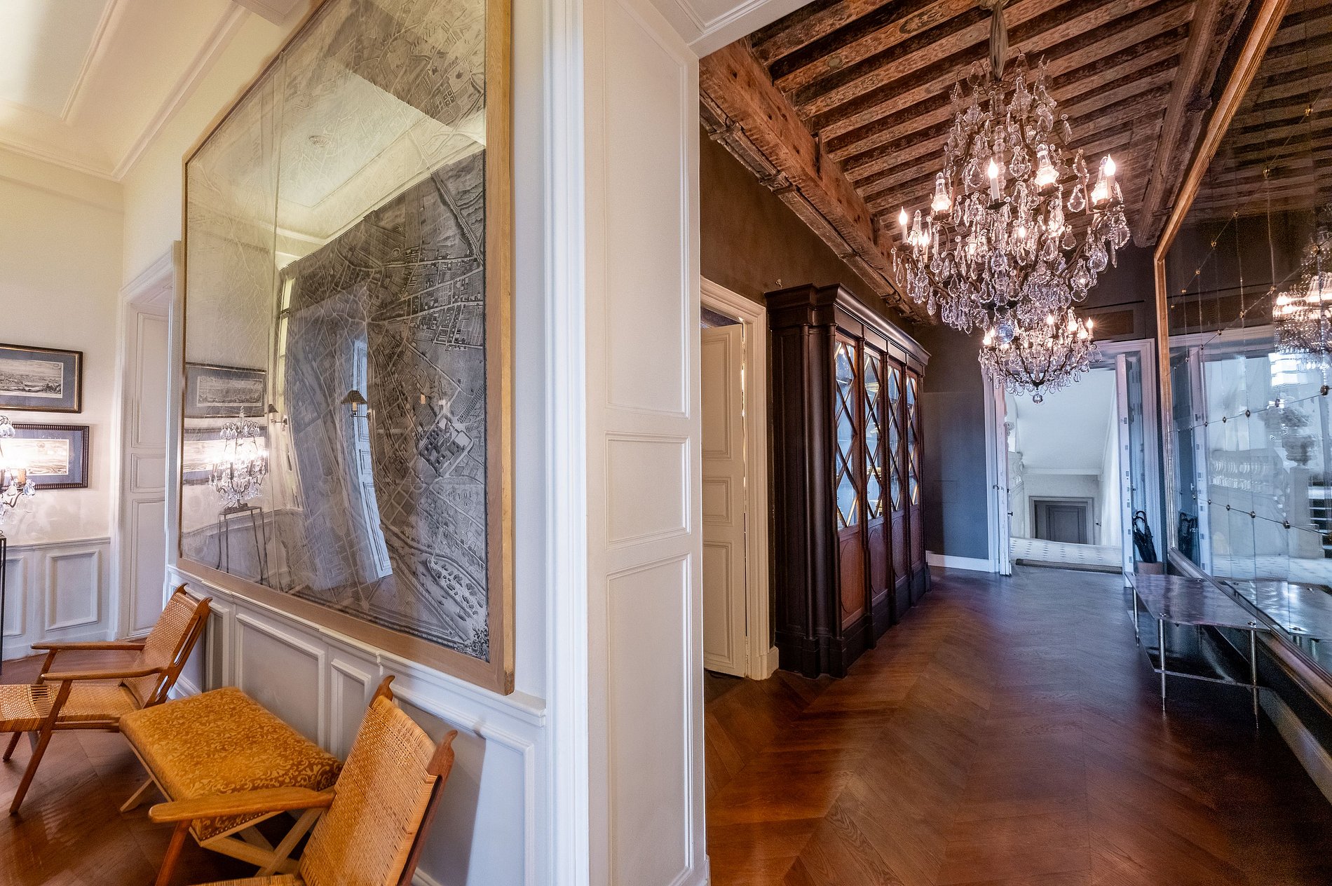 La décoration, d’inspiration classique française, rend hommage au passé avec un goût certain : moulures délicates, mobilier soigneusement sélectionné, textiles nobles et détails architecturaux subliment chaque pièce. L’ensemble reflète une esthétique raffinée, respectueuse de l’histoire et du patrimoine.