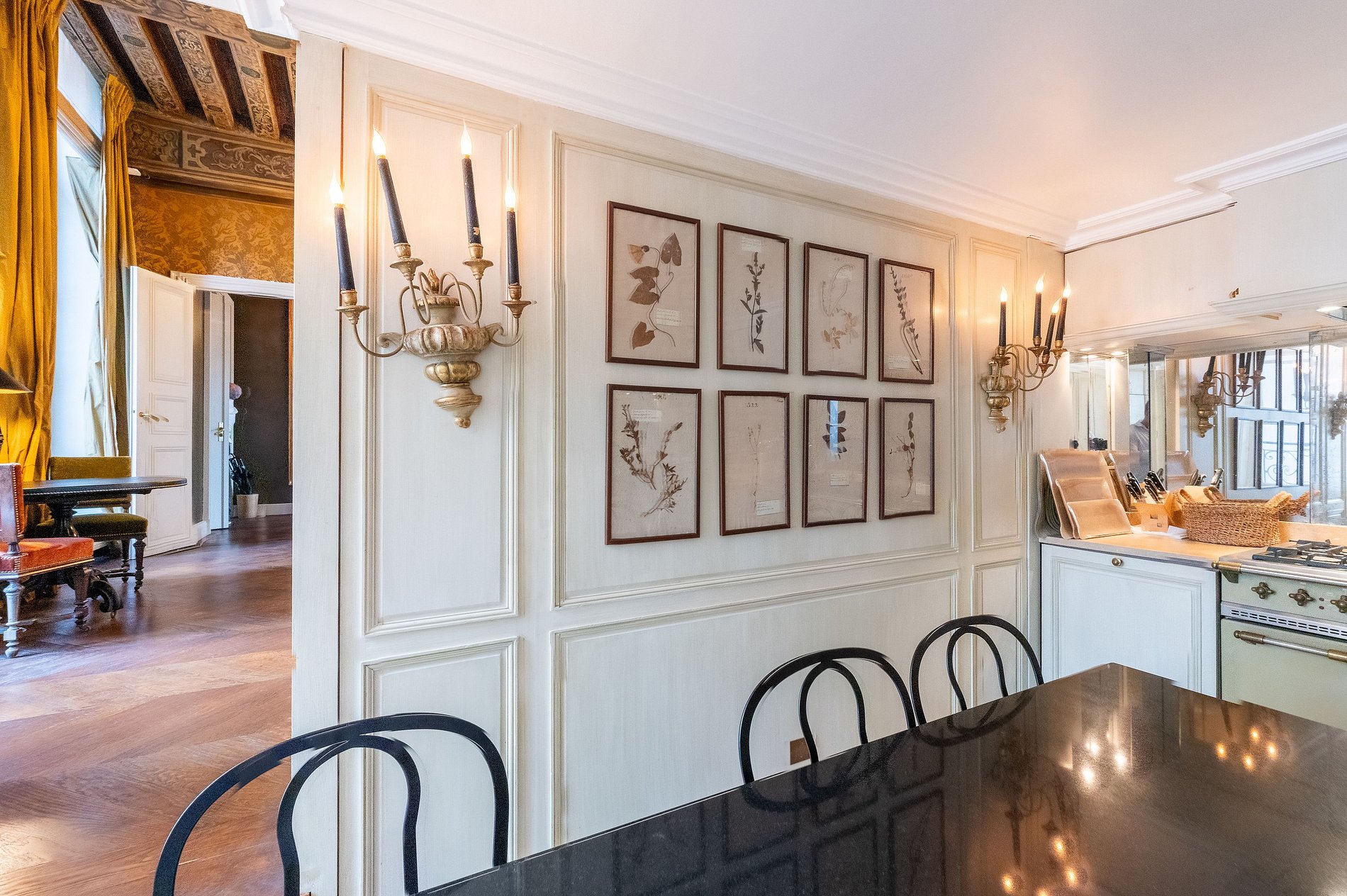 Les trois chambres, chacune dotée de sa propre salle de bains privative et climatisée, offrent intimité et bien-être à tous les occupants. Les vues imprenables sur les jardins parfaitement dessinés et les arcades de la Place des Vosges confèrent à ce lieu un cachet unique, véritable tableau vivant de la vie parisienne.