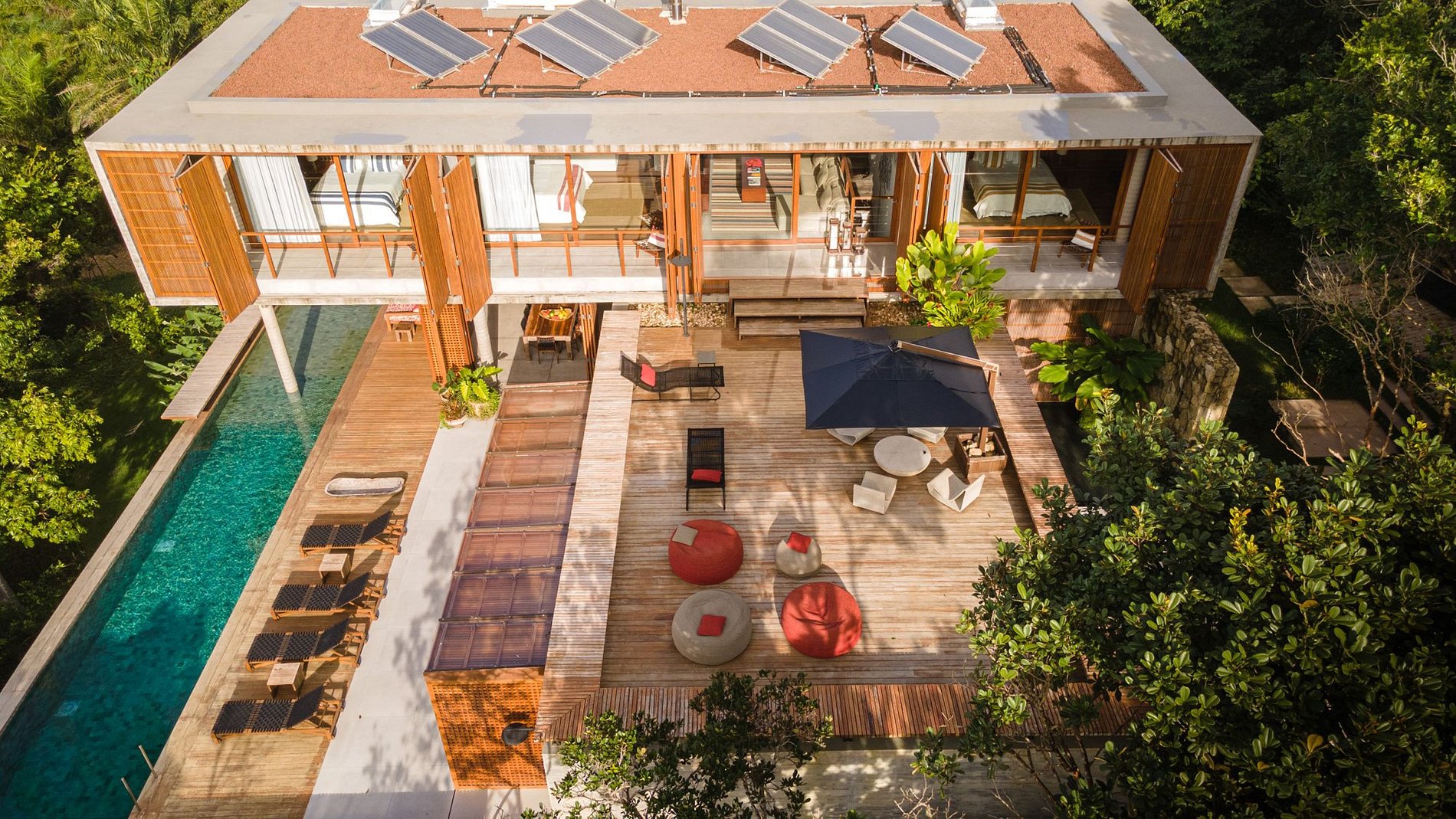 La Villa dispose de trois suites à l'étage supérieur et d'une au rez-de-chaussée, toutes équipées d'une télévision, d'un minibar et deux d'entre elles d'une baignoire stratégiquement positionnées pour profiter de la magnifique vue sur la forêt atlantique. La propriété dispose également d'une salle de télévision, d'un système de son surround dans les espaces communs, d'une terrasse de yoga et d'un espace gastronomique équipé d'un grill argentin, parfait pour profiter de moments gastronomiques en plein air.