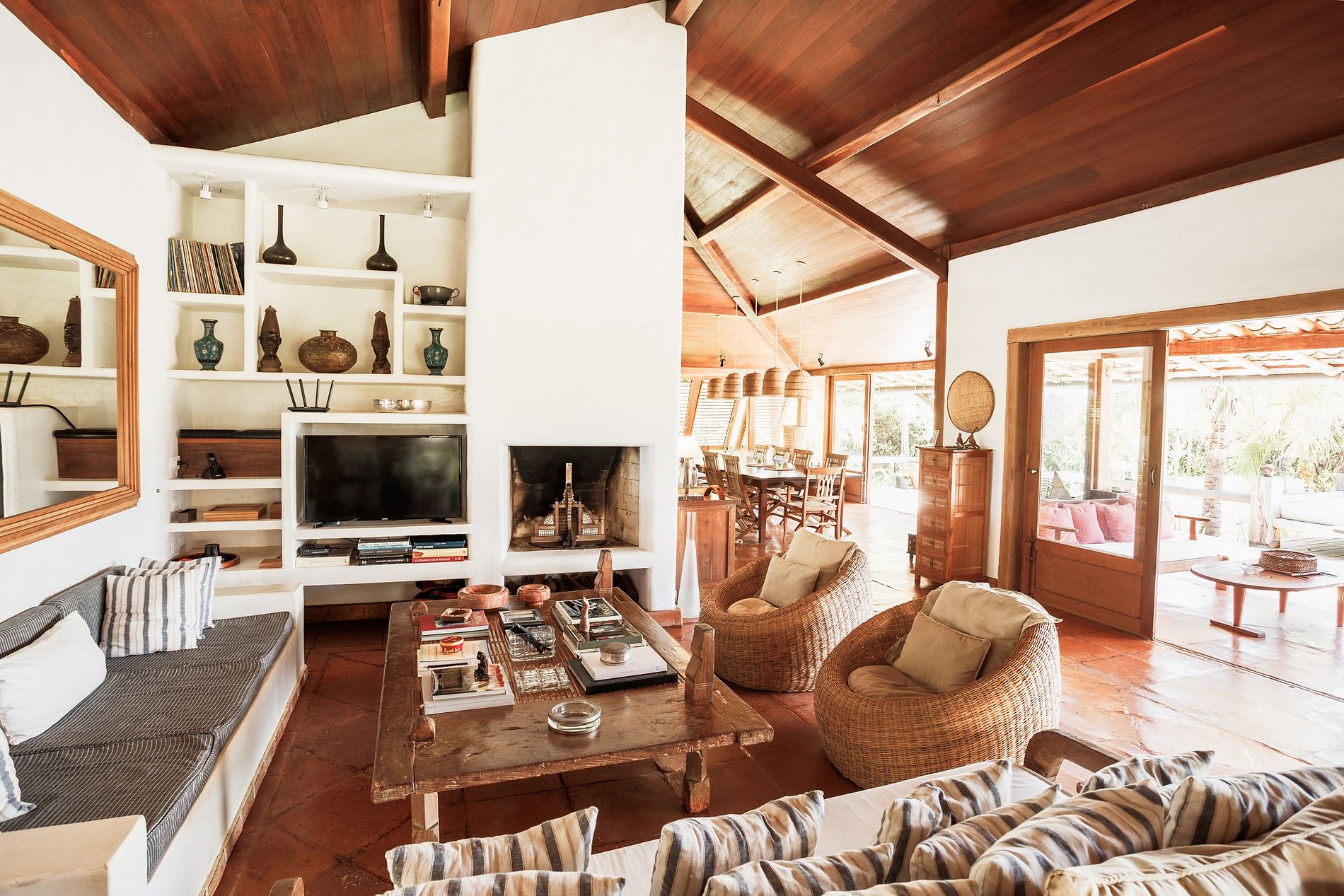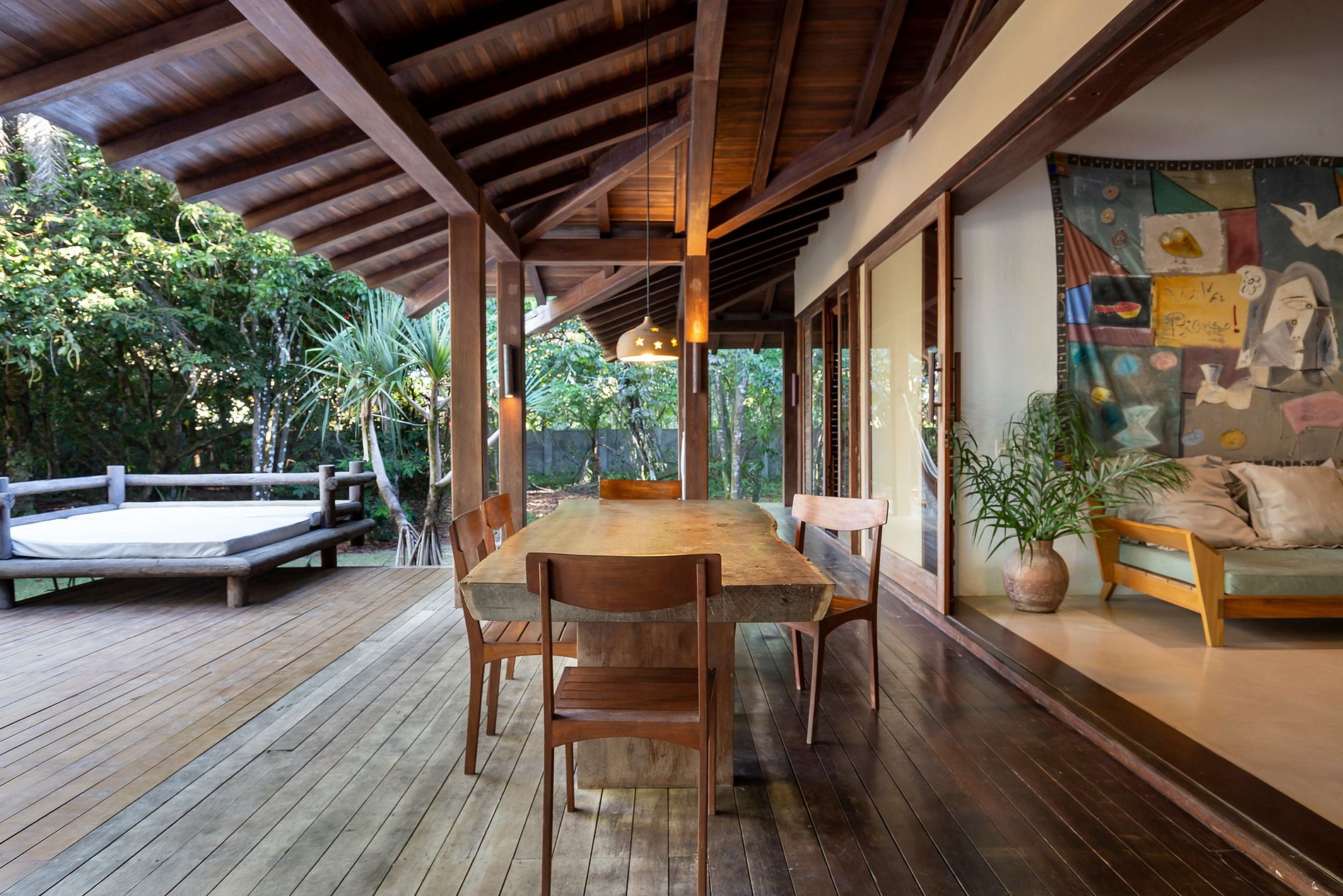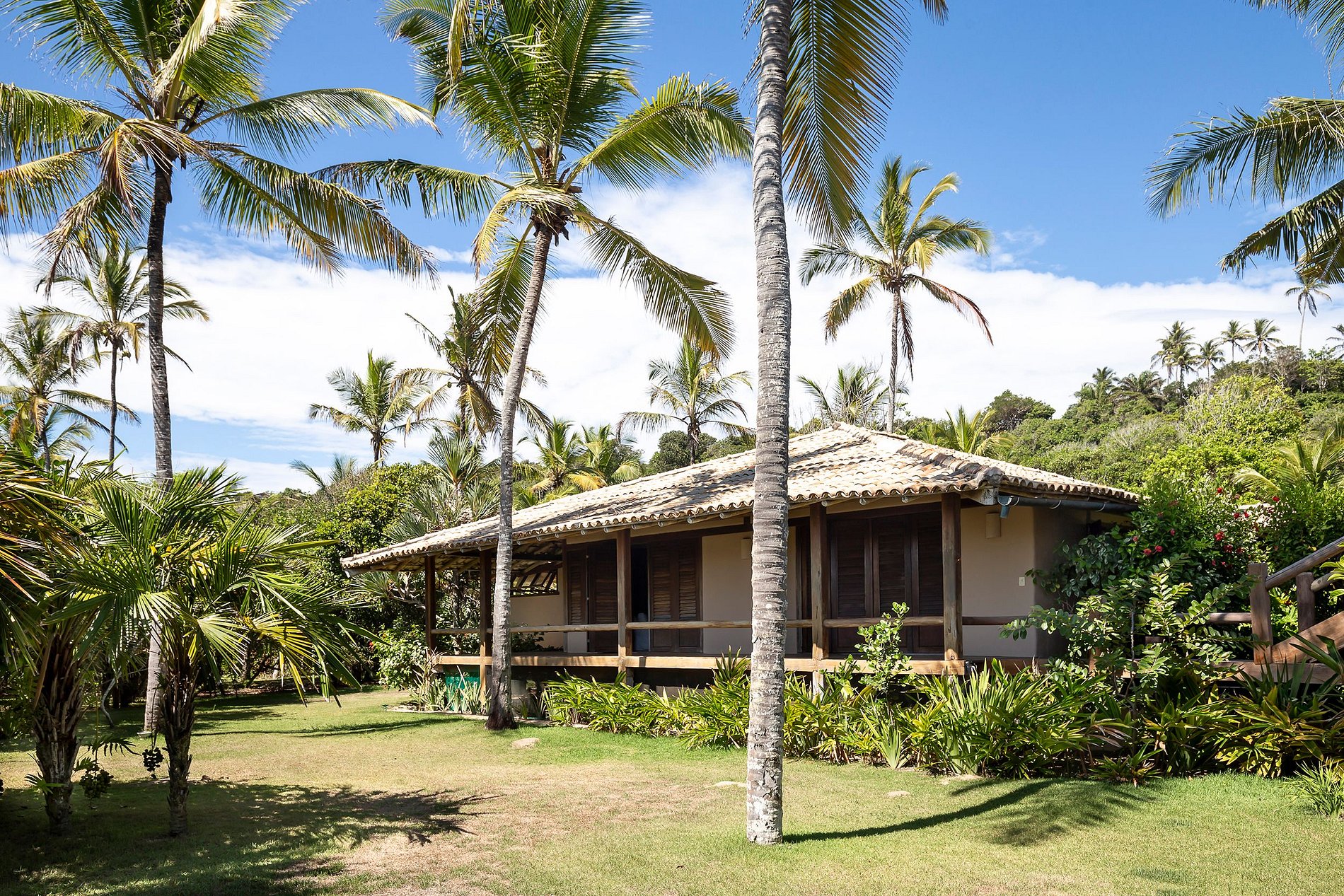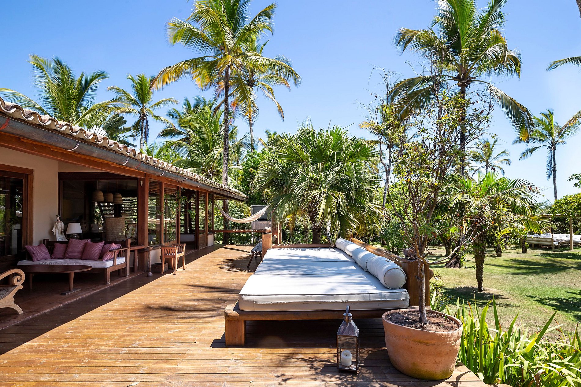 Le salon principal et la salle à manger ont des portes vitrées qui s'ouvrent sur un balcon suivi d'une grande terrasse en bois avec un immense canapé solarium. La maison entoure une cour ouverte avec de l'herbe et des cocotiers. Depuis le pont principal, il y a un escalier qui descend à la pelouse et un autre qui monte à un point de vue couvert par une piassava, où se trouvent un canapé, des fauteuils et un bar dont la vue embrasse la mer depuis la plage dos Coqueiros (côté nord). à Ponta de Itapororoca (côté sud).