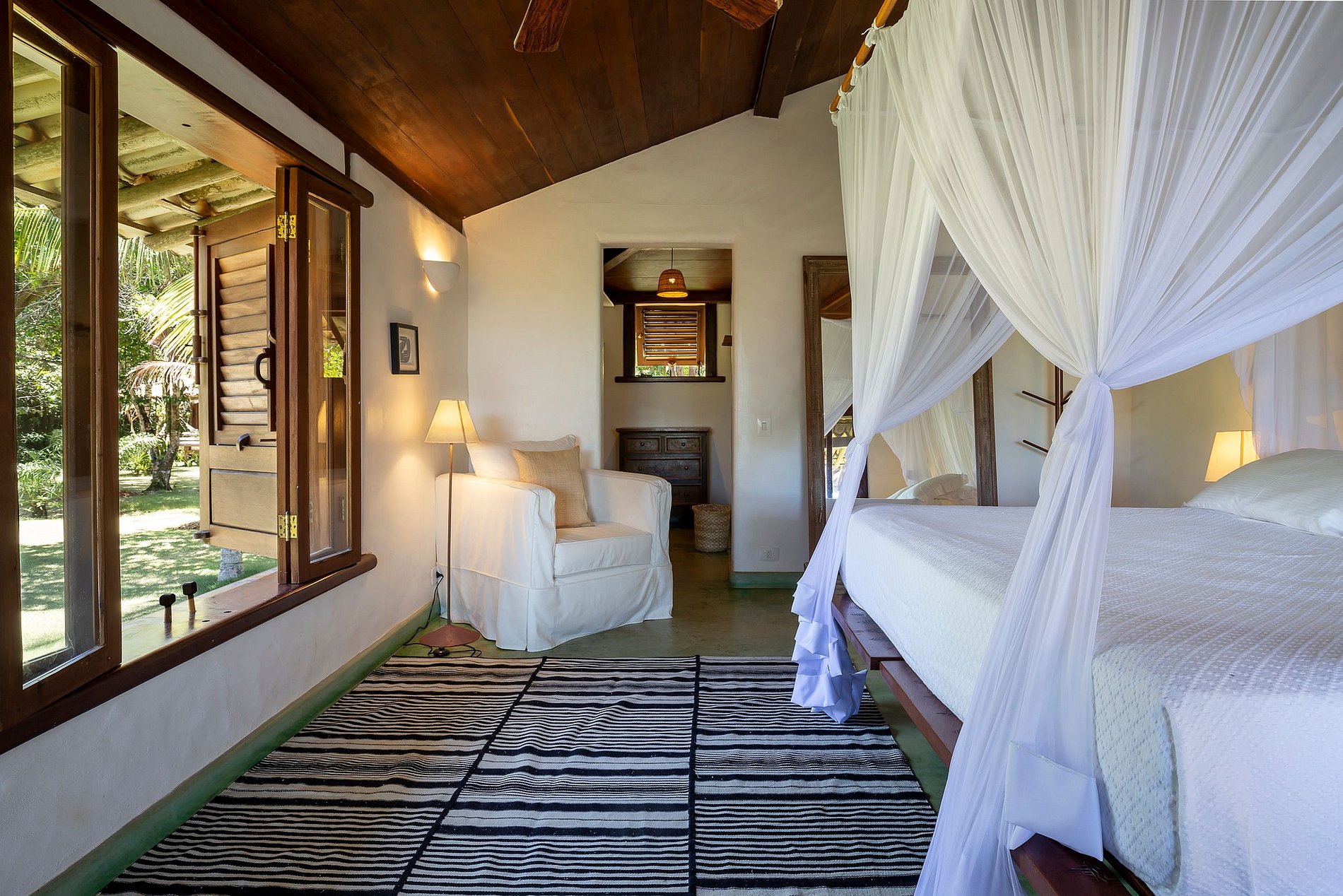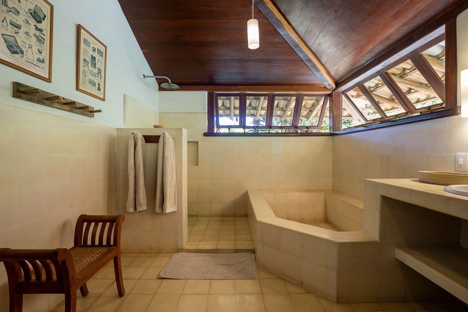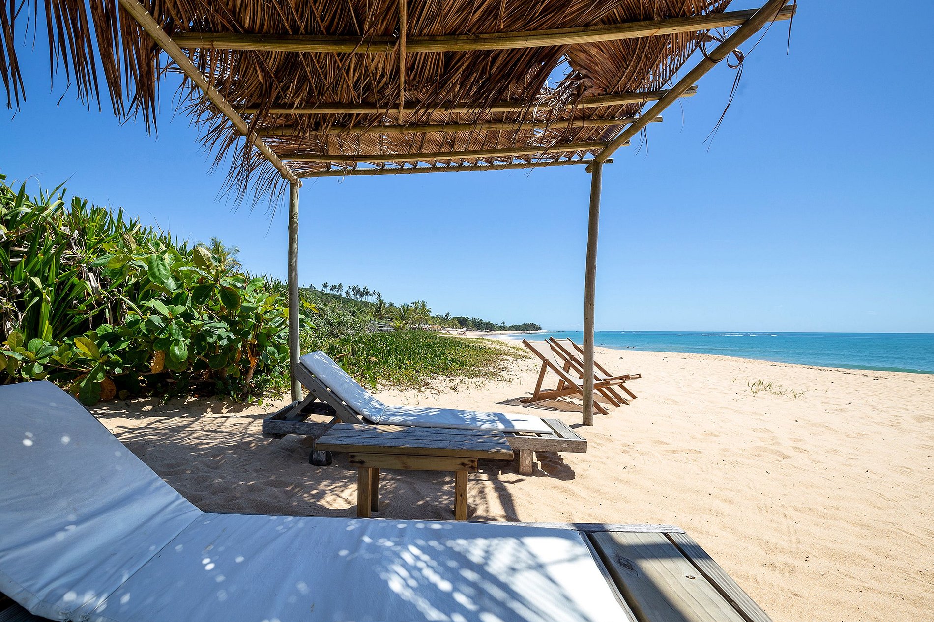Le salon principal et la salle à manger ont des portes vitrées qui s'ouvrent sur un balcon suivi d'une grande terrasse en bois avec un immense canapé solarium. La maison entoure une cour ouverte avec de l'herbe et des cocotiers. Depuis le pont principal, il y a un escalier qui descend à la pelouse et un autre qui monte à un point de vue couvert par une piassava, où se trouvent un canapé, des fauteuils et un bar dont la vue embrasse la mer depuis la plage dos Coqueiros (côté nord). à Ponta de Itapororoca (côté sud).