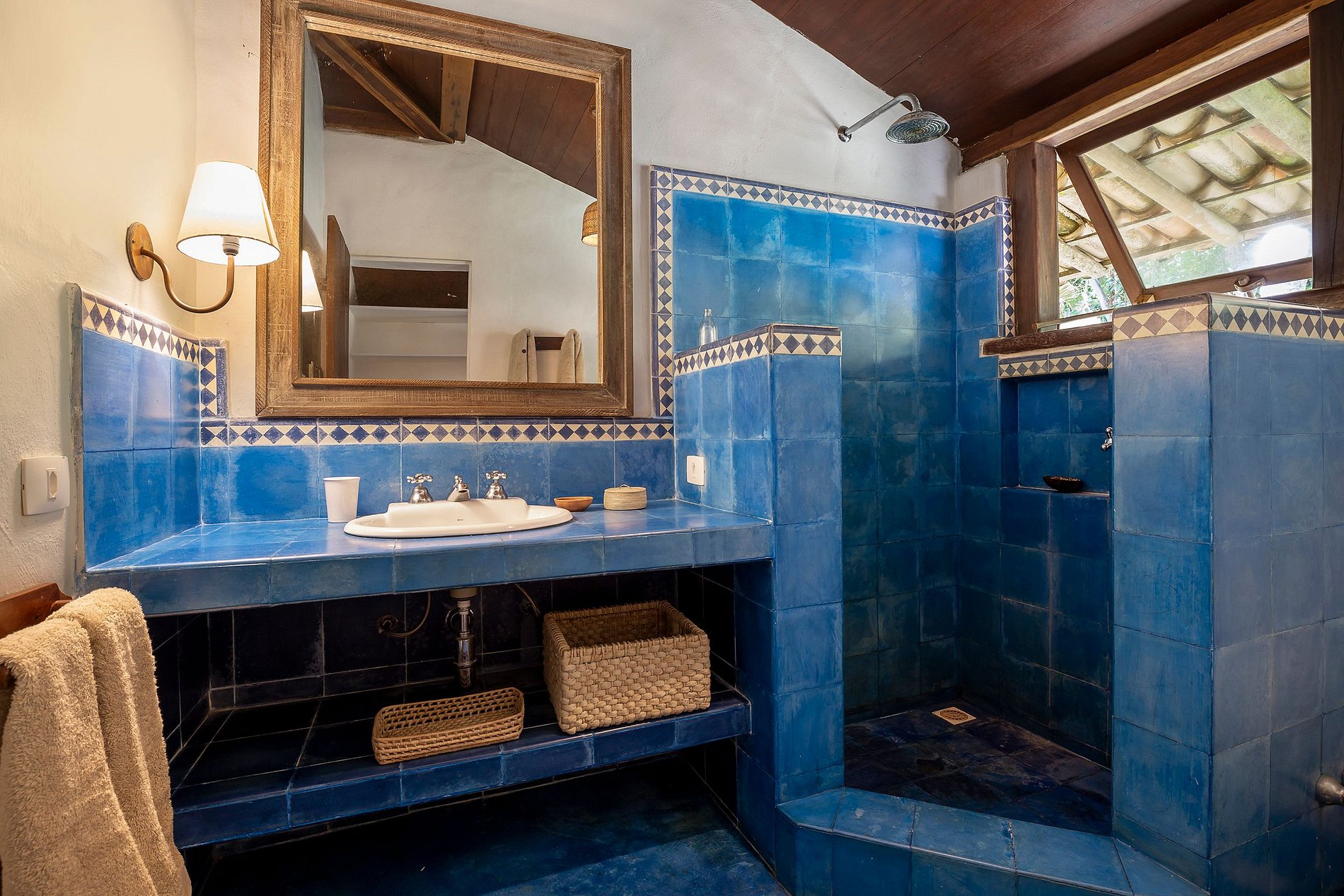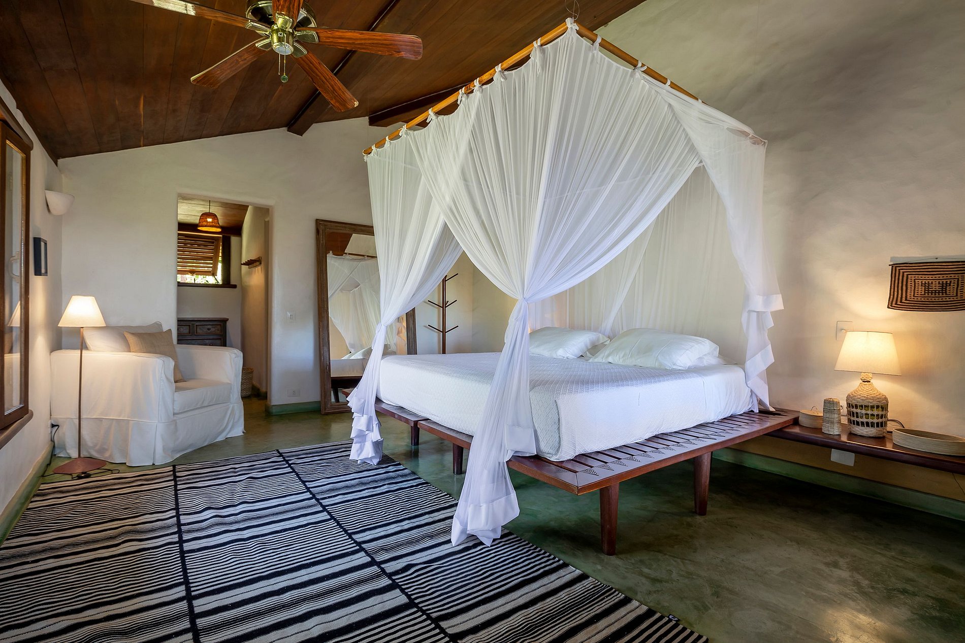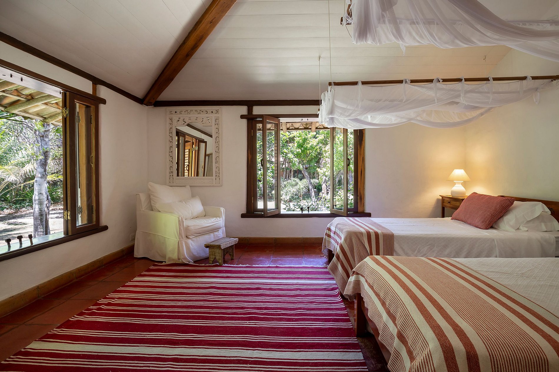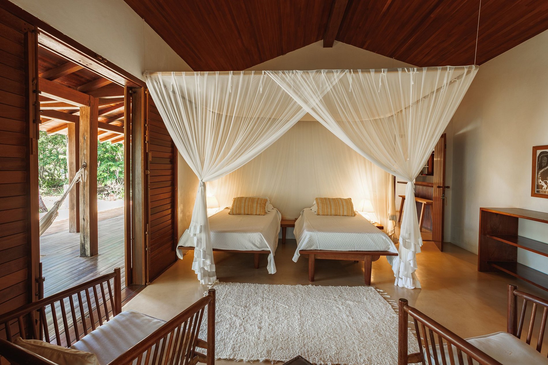 Le salon principal et la salle à manger ont des portes vitrées qui s'ouvrent sur un balcon suivi d'une grande terrasse en bois avec un immense canapé solarium. La maison entoure une cour ouverte avec de l'herbe et des cocotiers. Depuis le pont principal, il y a un escalier qui descend à la pelouse et un autre qui monte à un point de vue couvert par une piassava, où se trouvent un canapé, des fauteuils et un bar dont la vue embrasse la mer depuis la plage dos Coqueiros (côté nord). à Ponta de Itapororoca (côté sud).
